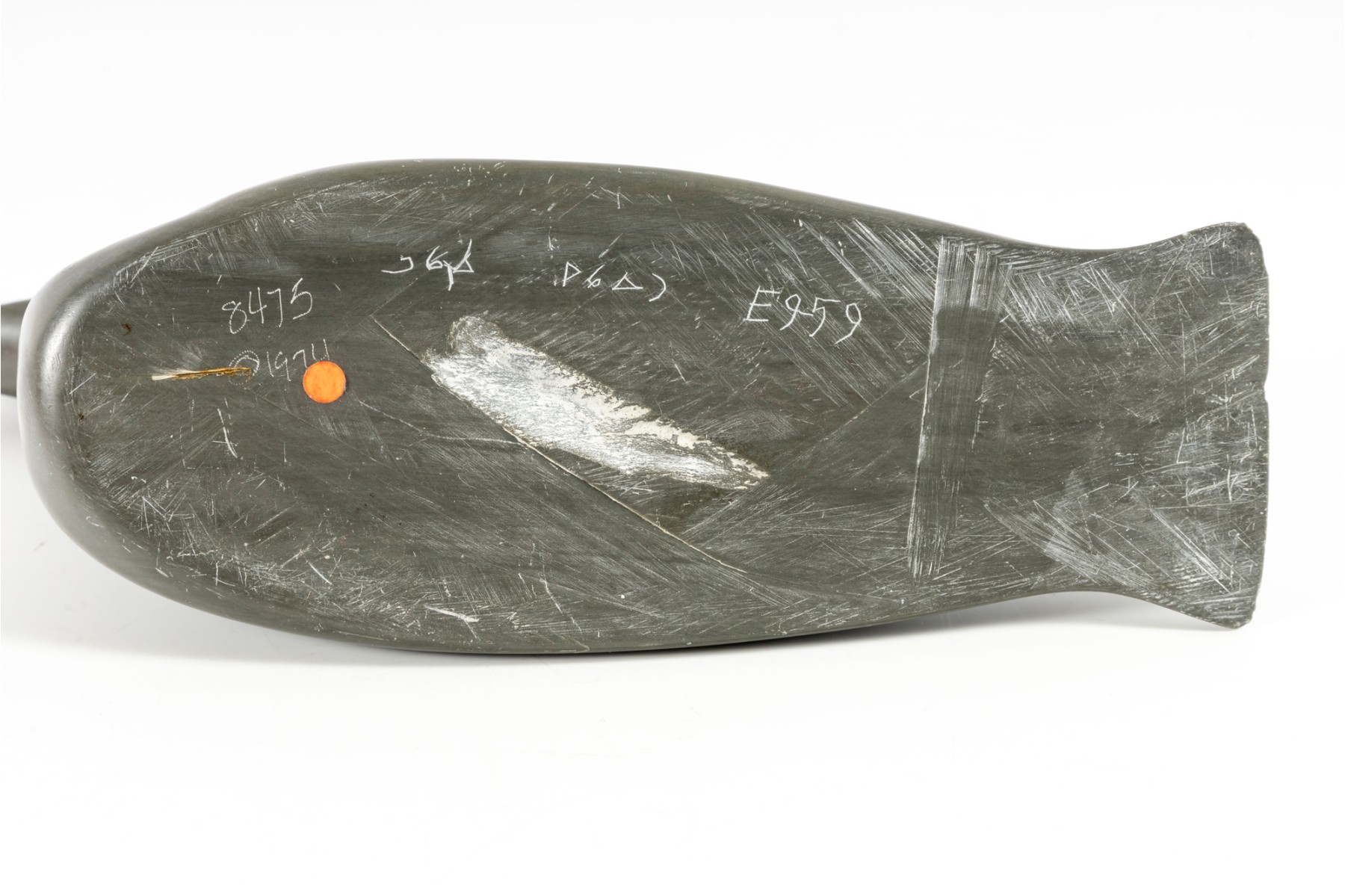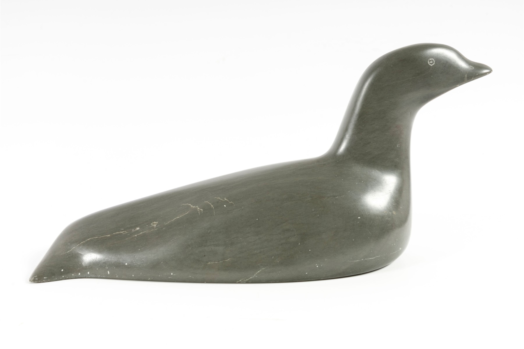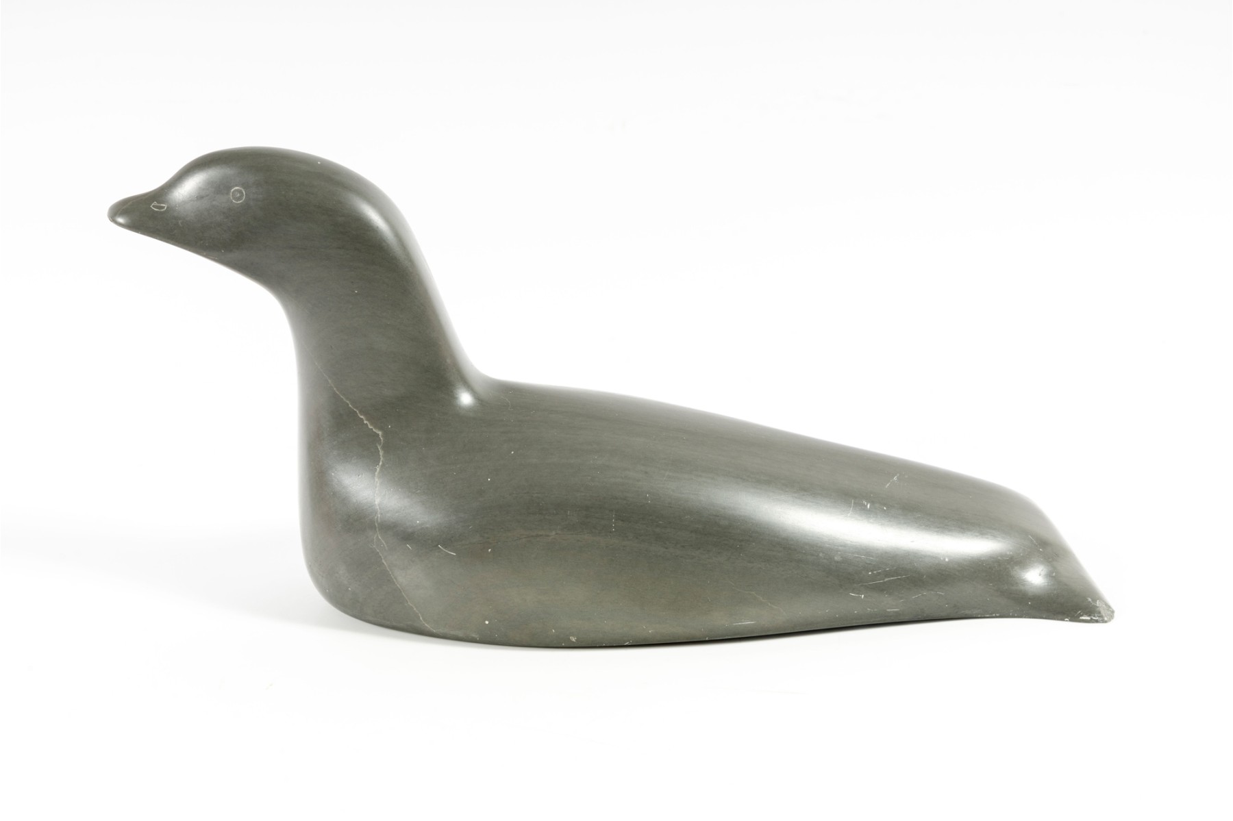 A carved soapstone Inuit duck decoy sculpture, rounded and smoothed to a glossy finish. Multiple markings, dated 1974. Perfect for display.