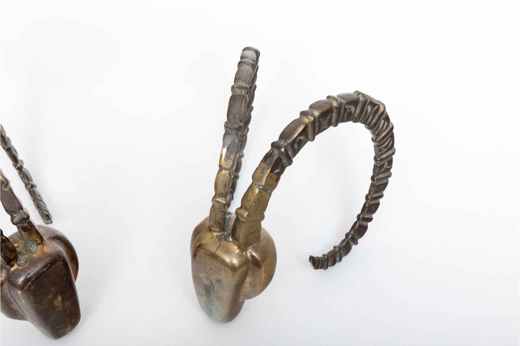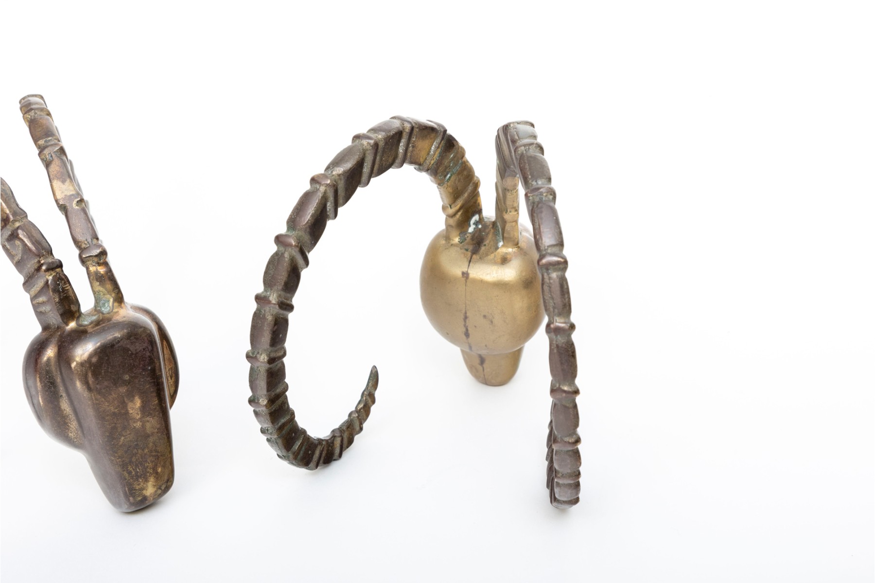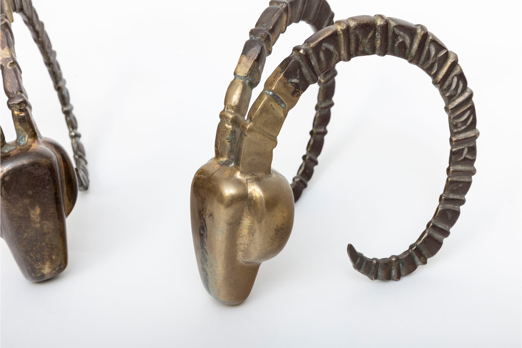 A pair of 1980's Dolbi Cashier brass bookends with great Art Deco and Hollywood Regency flare, displaying abstract ibex heads with textural high-arching horns.