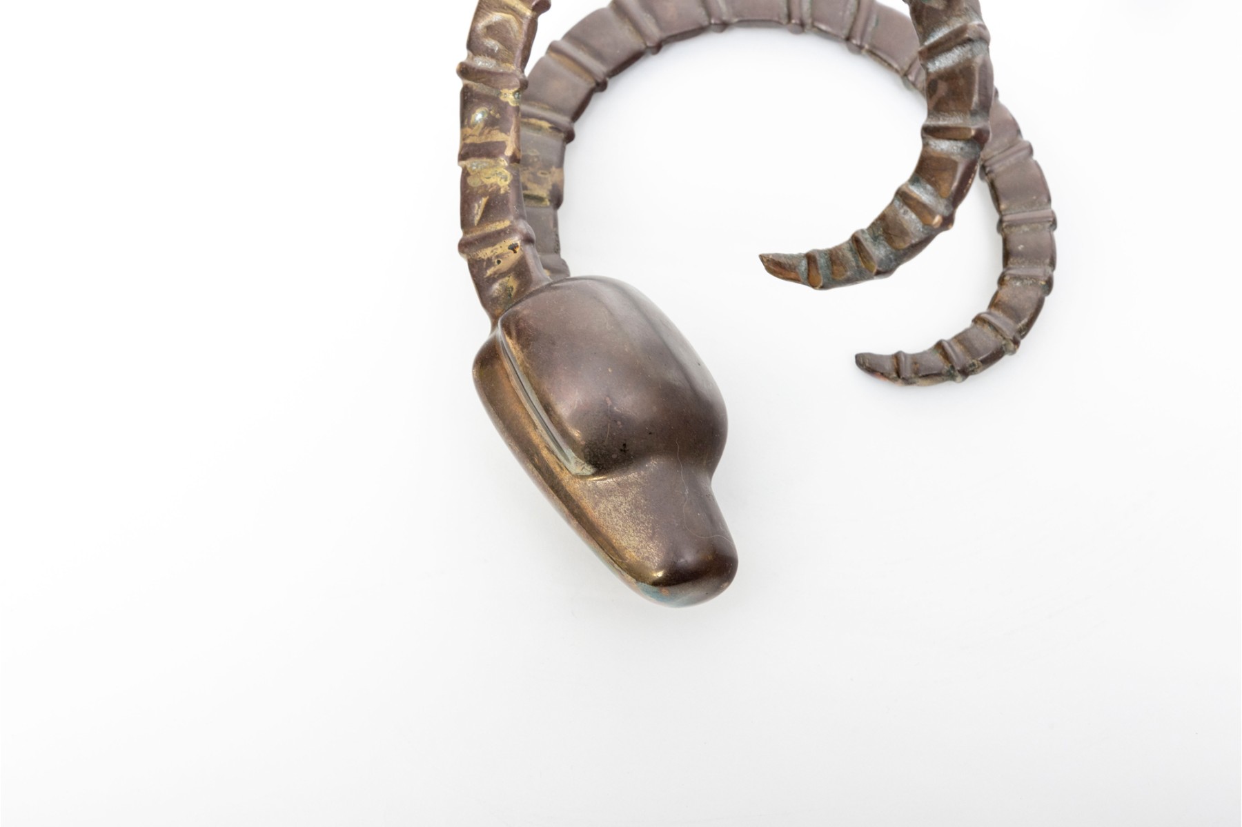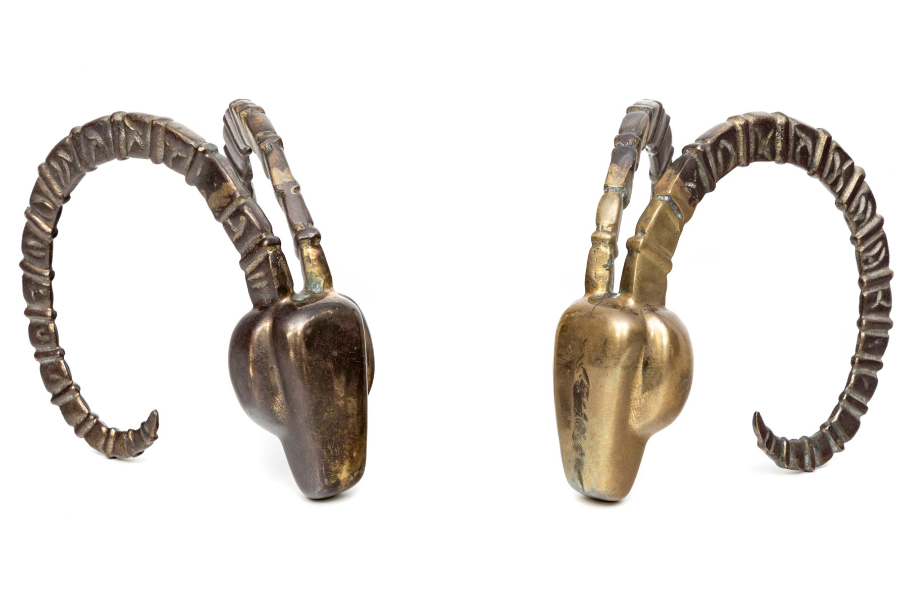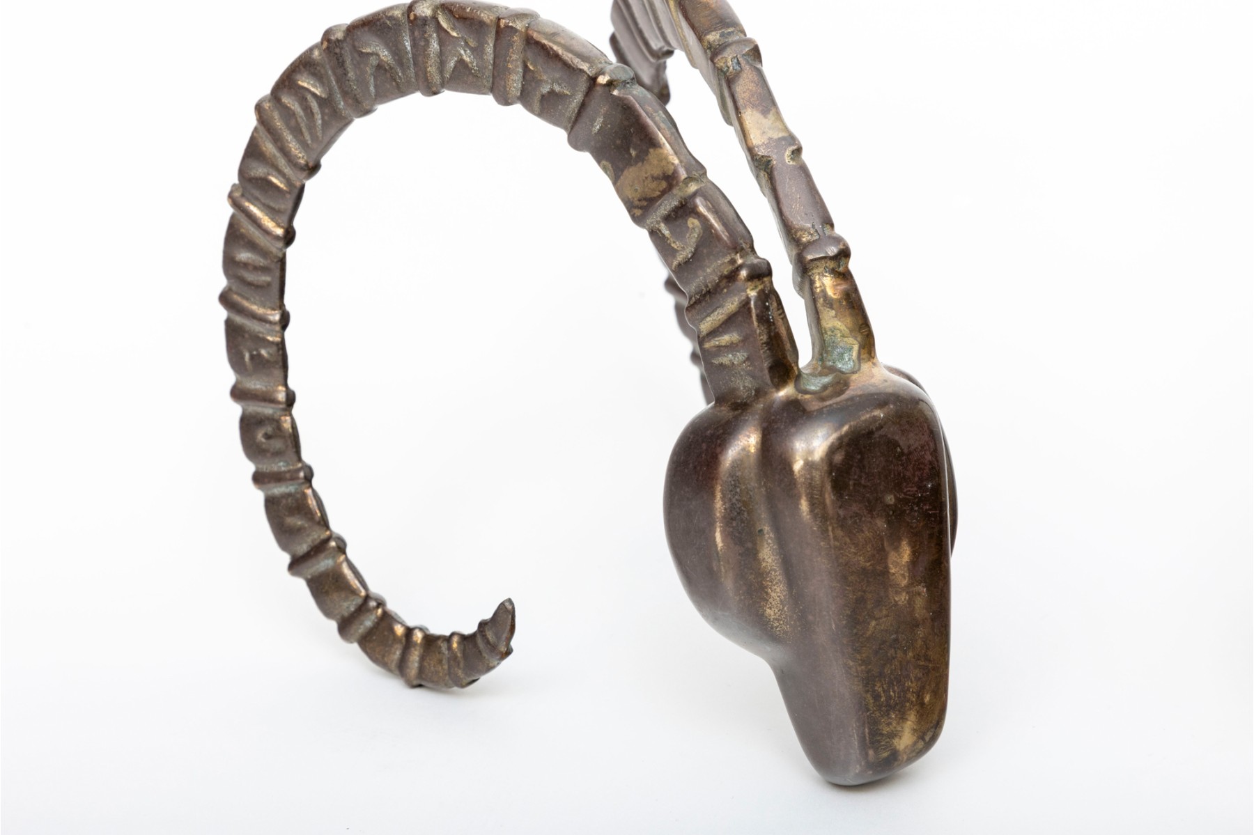 A pair of 1980's Dolbi Cashier brass bookends with great Art Deco and Hollywood Regency flare, displaying abstract ibex heads with textural high-arching horns.