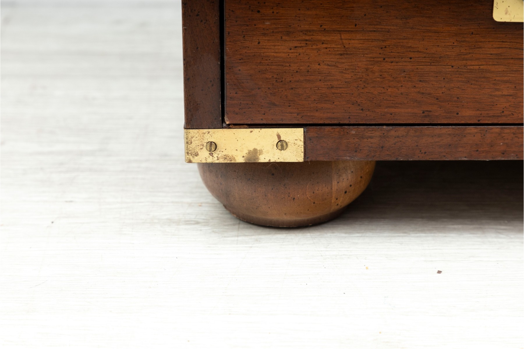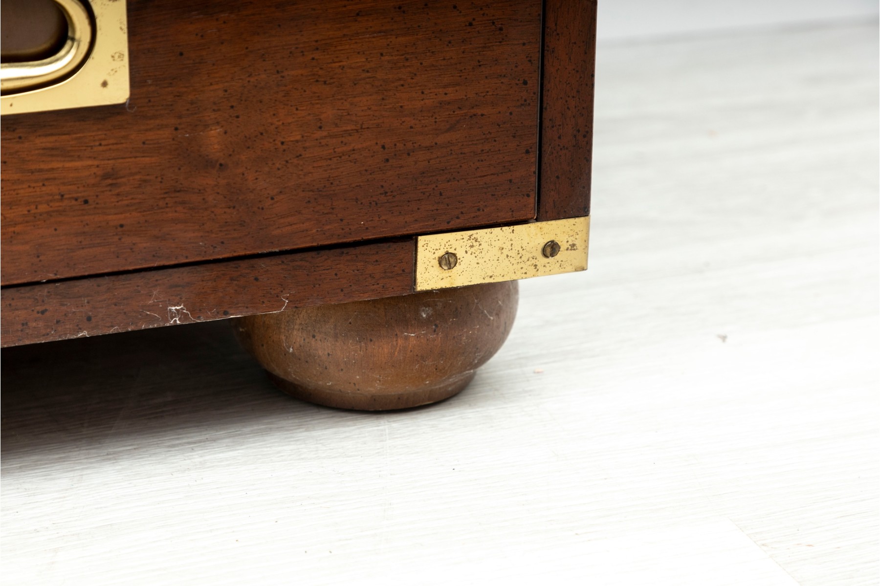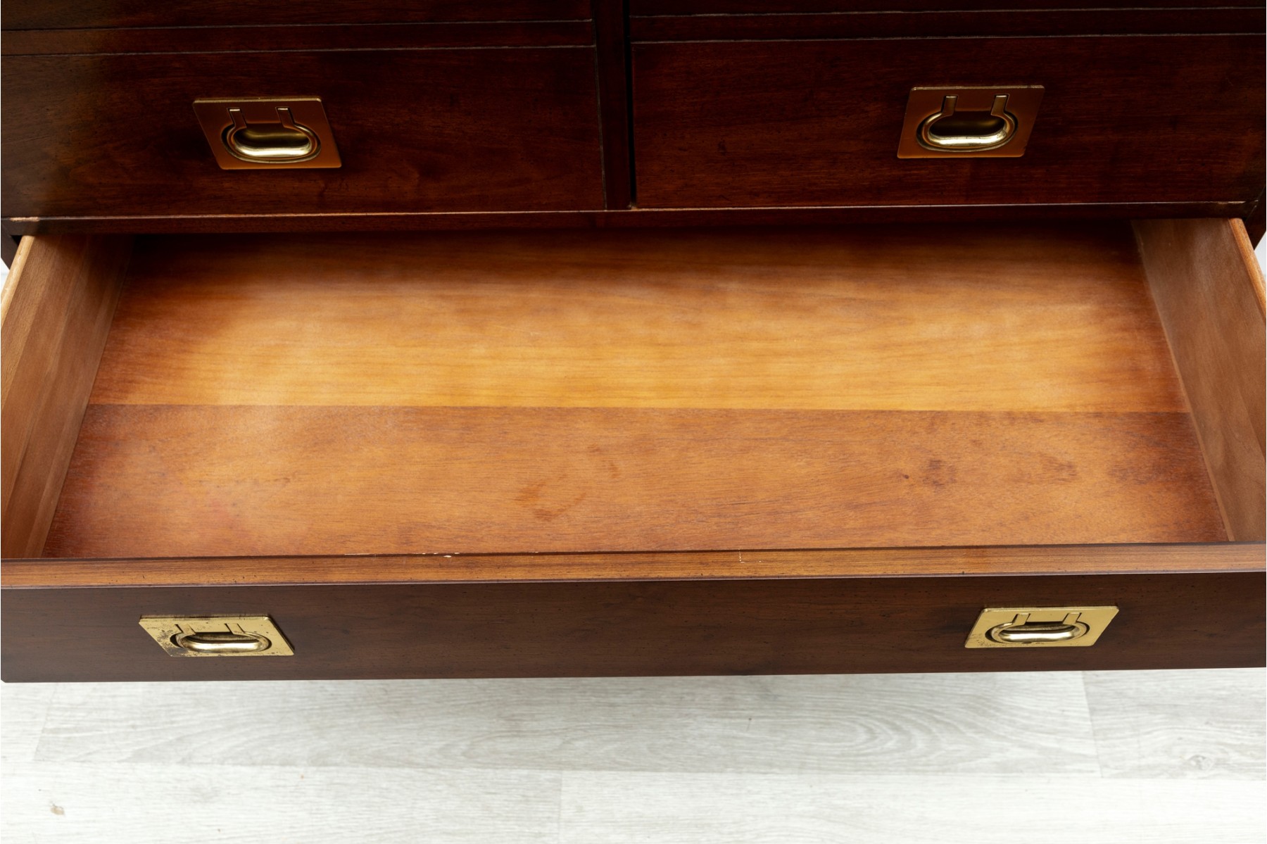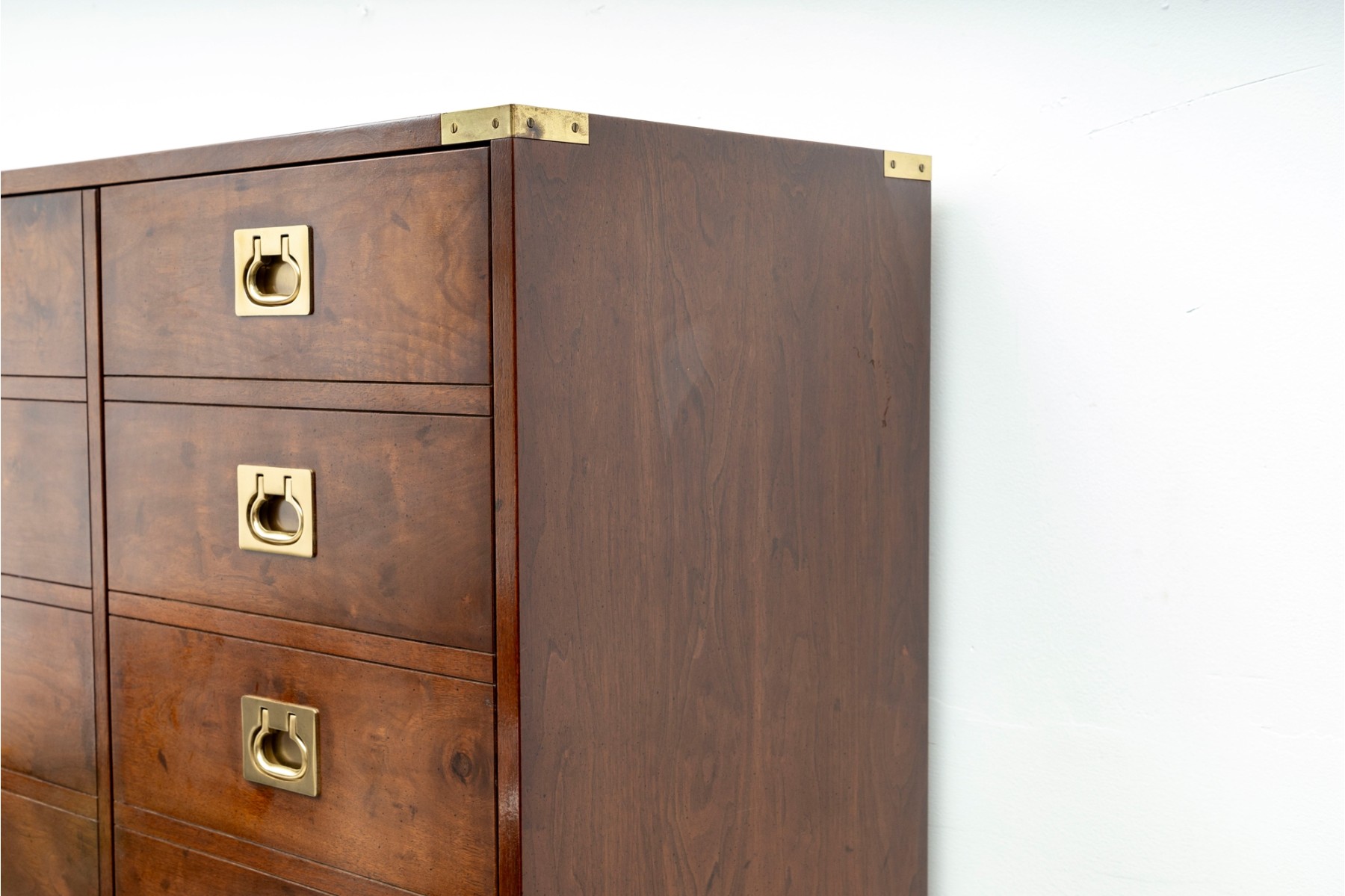 This 1980's Henredon dresser is a stunning example of the iconic Campaign style, featuring a sleek and functional design. The dresser includes two spacious bottom drawers for ample storage, while the cabinet doors above are designed with a faux drawer front, giving the piece a cohesive and stylish look.