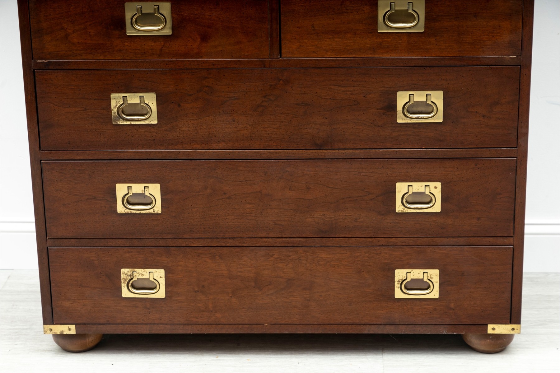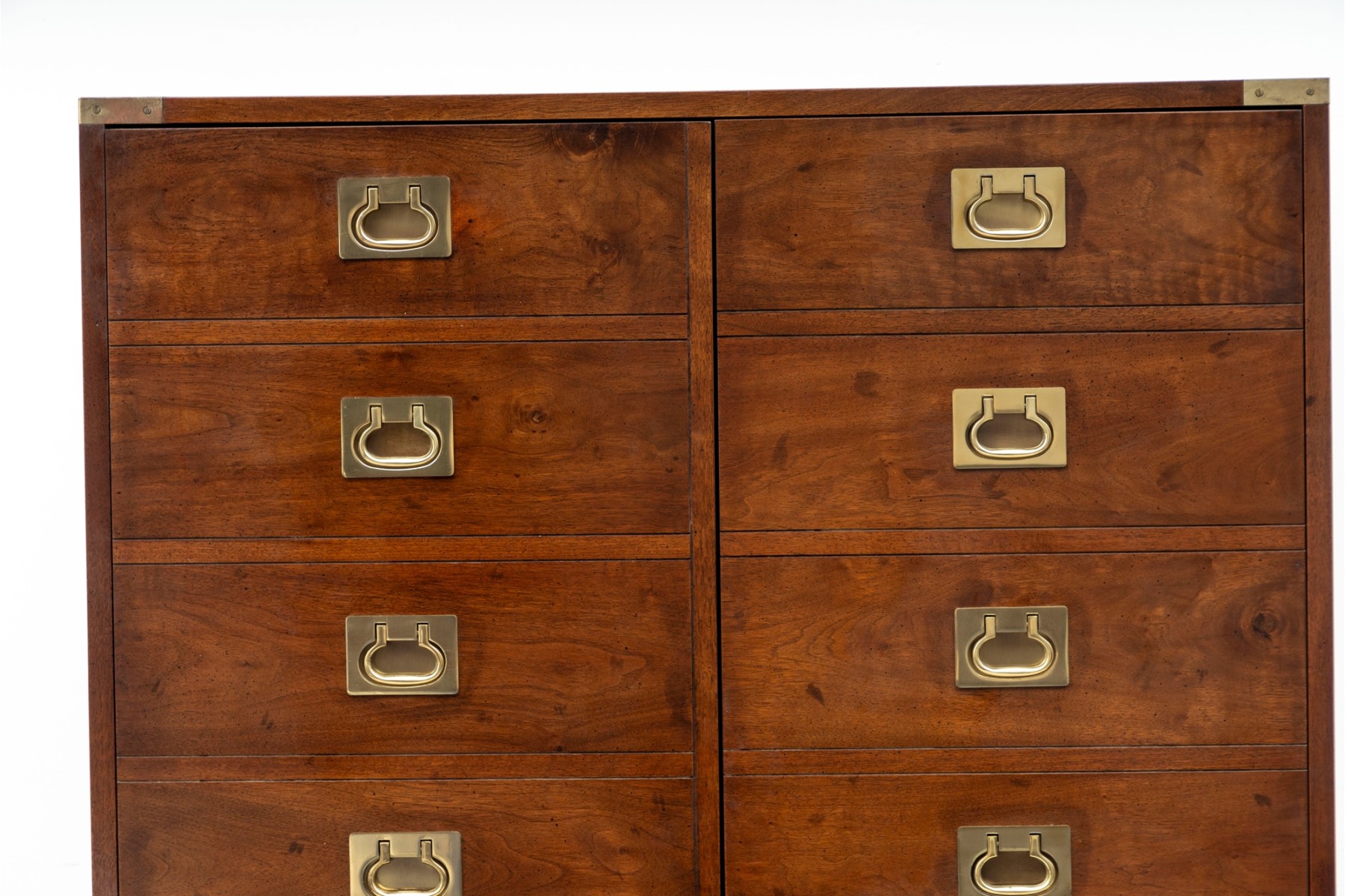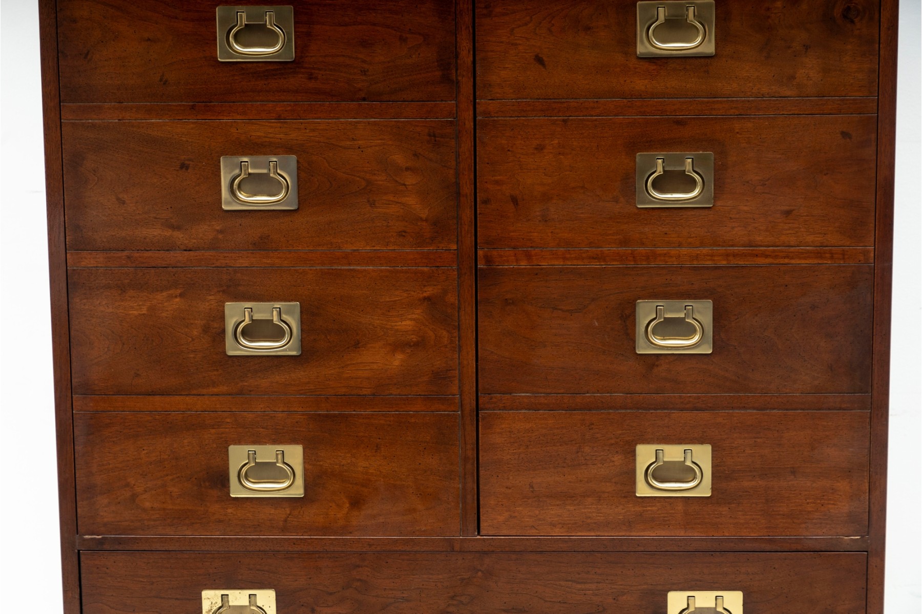 This 1980's Henredon dresser is a stunning example of the iconic Campaign style, featuring a sleek and functional design. The dresser includes two spacious bottom drawers for ample storage, while the cabinet doors above are designed with a faux drawer front, giving the piece a cohesive and stylish look.