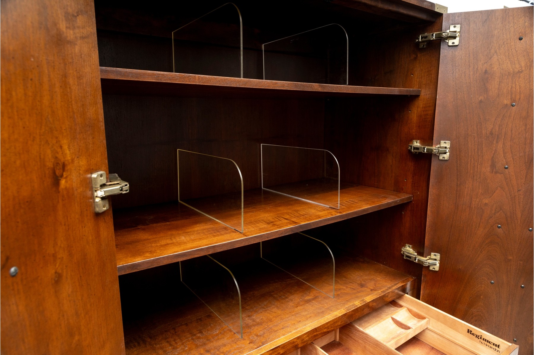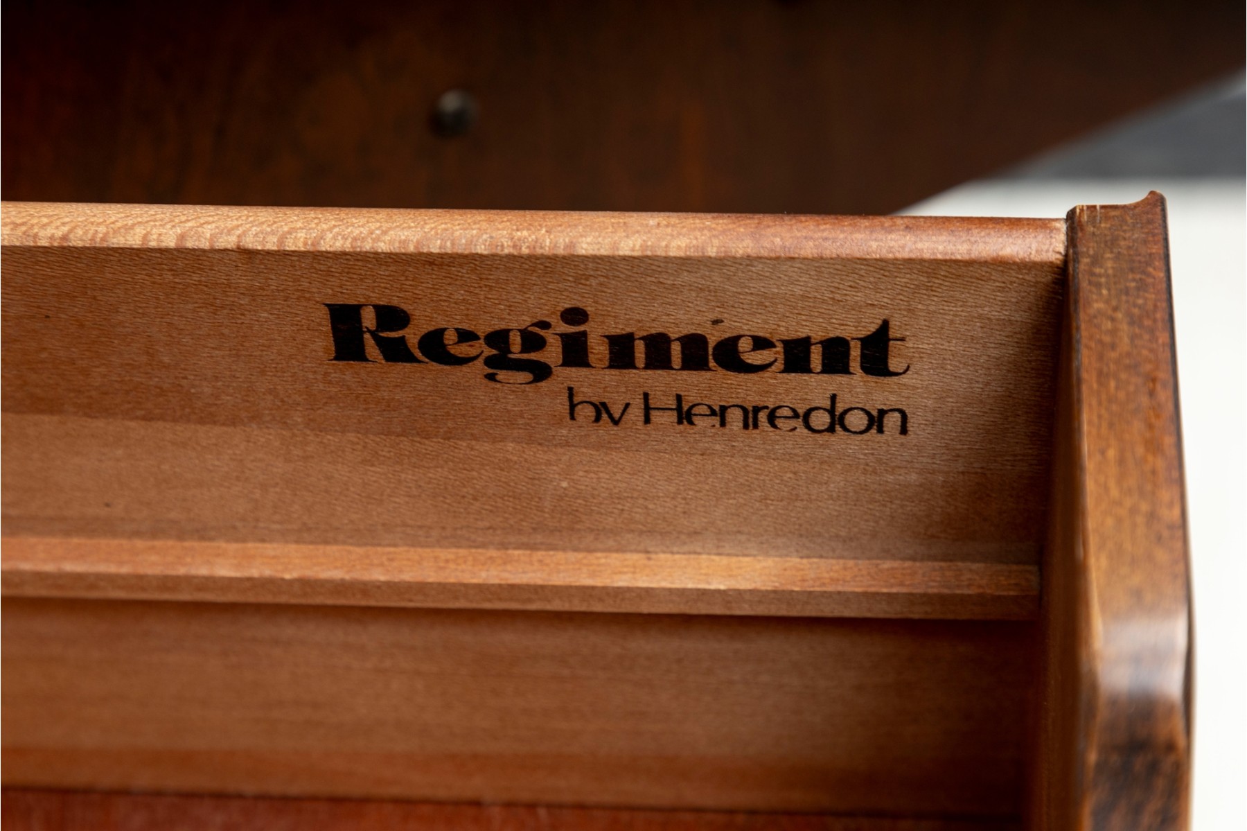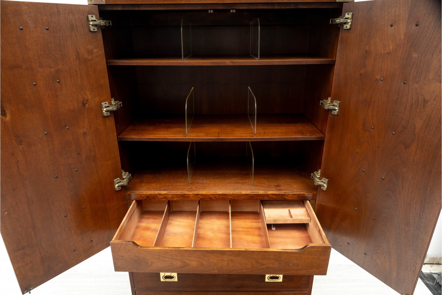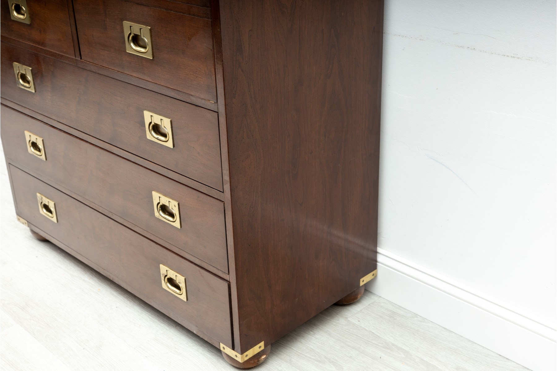 This 1980's Henredon dresser is a stunning example of the iconic Campaign style, featuring a sleek and functional design. The dresser includes two spacious bottom drawers for ample storage, while the cabinet doors above are designed with a faux drawer front, giving the piece a cohesive and stylish look.