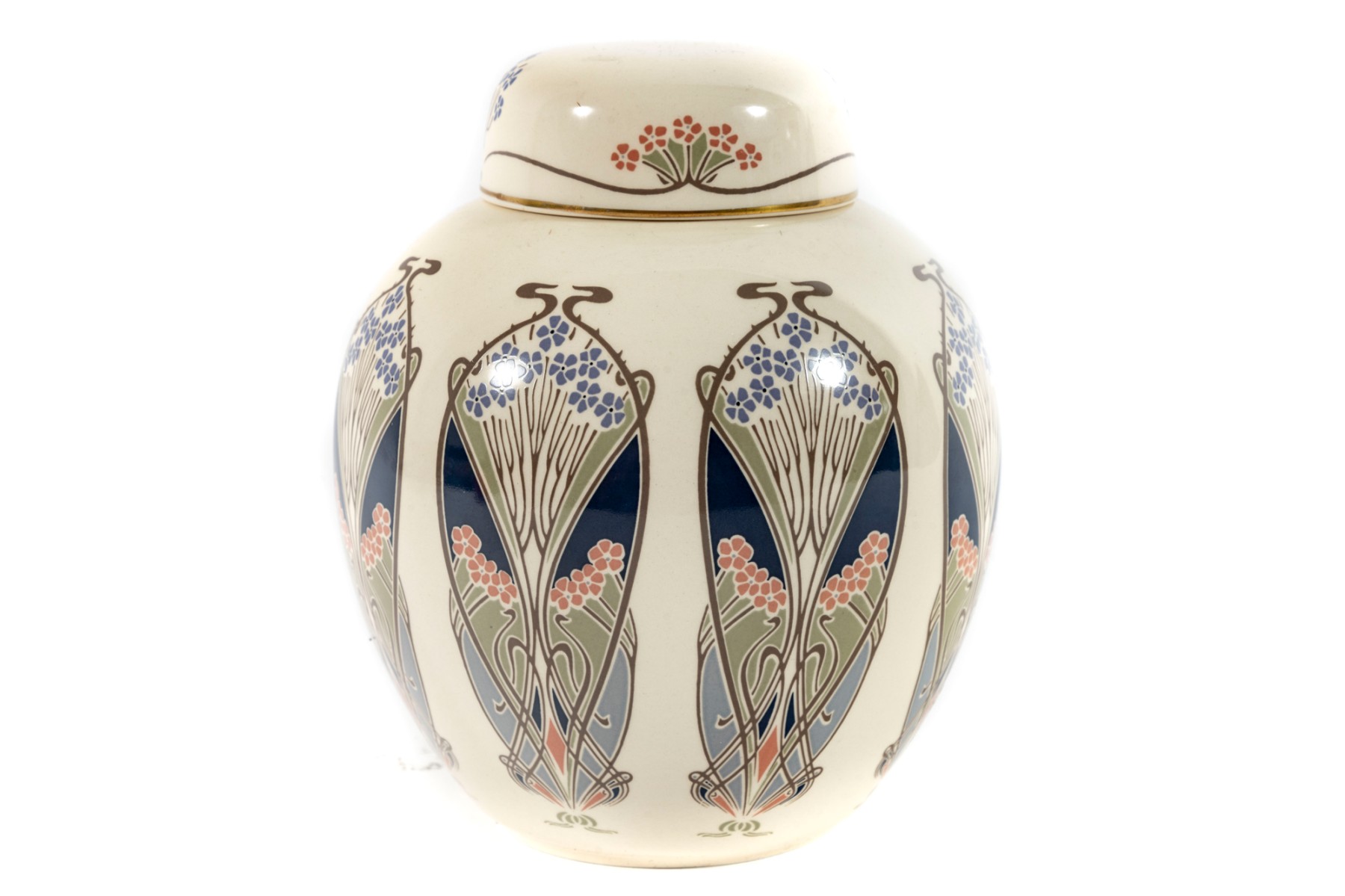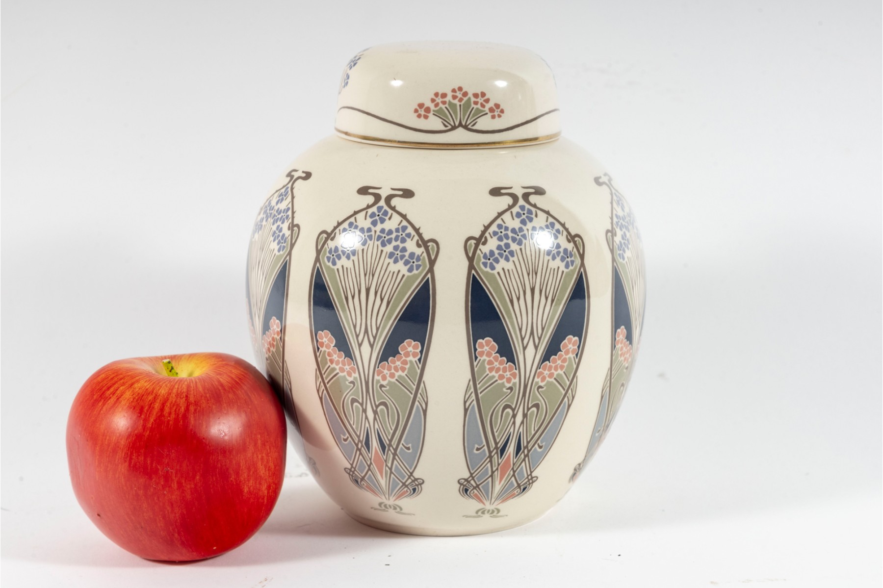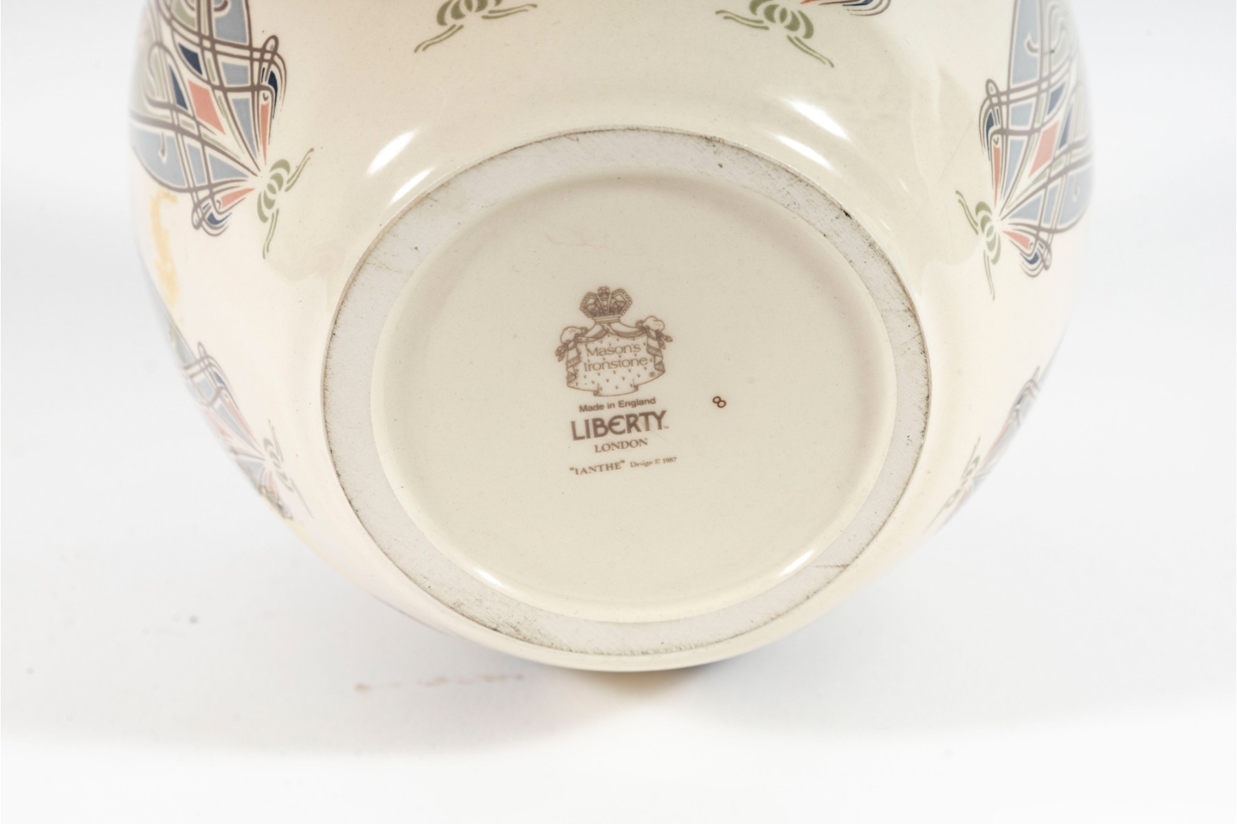 The 1987 Liberty London "Lanthe" Design lidded ginger jar produced by Mason's Ironstone China. Liberty London's 'Lanthe' design encapsulates Art Noveau in the form of repeating stencils along the exterior.