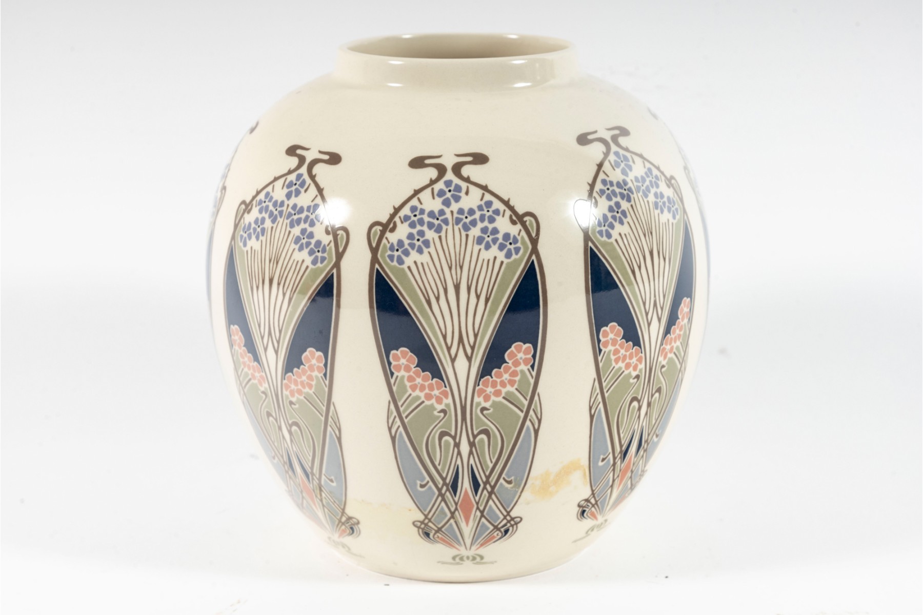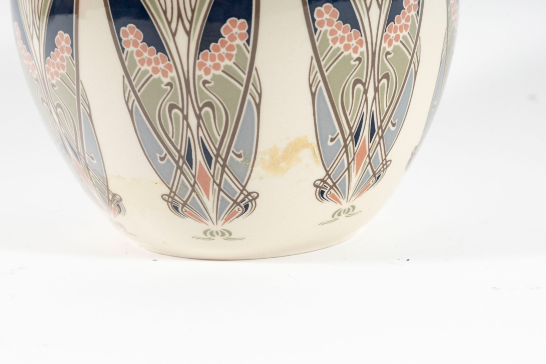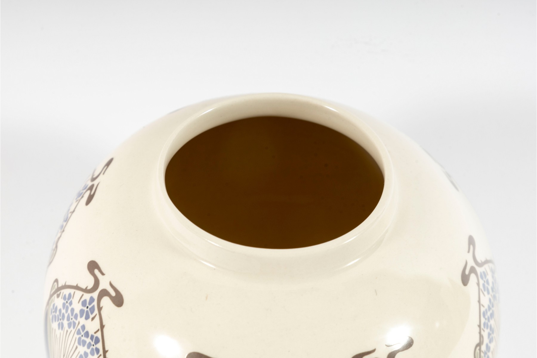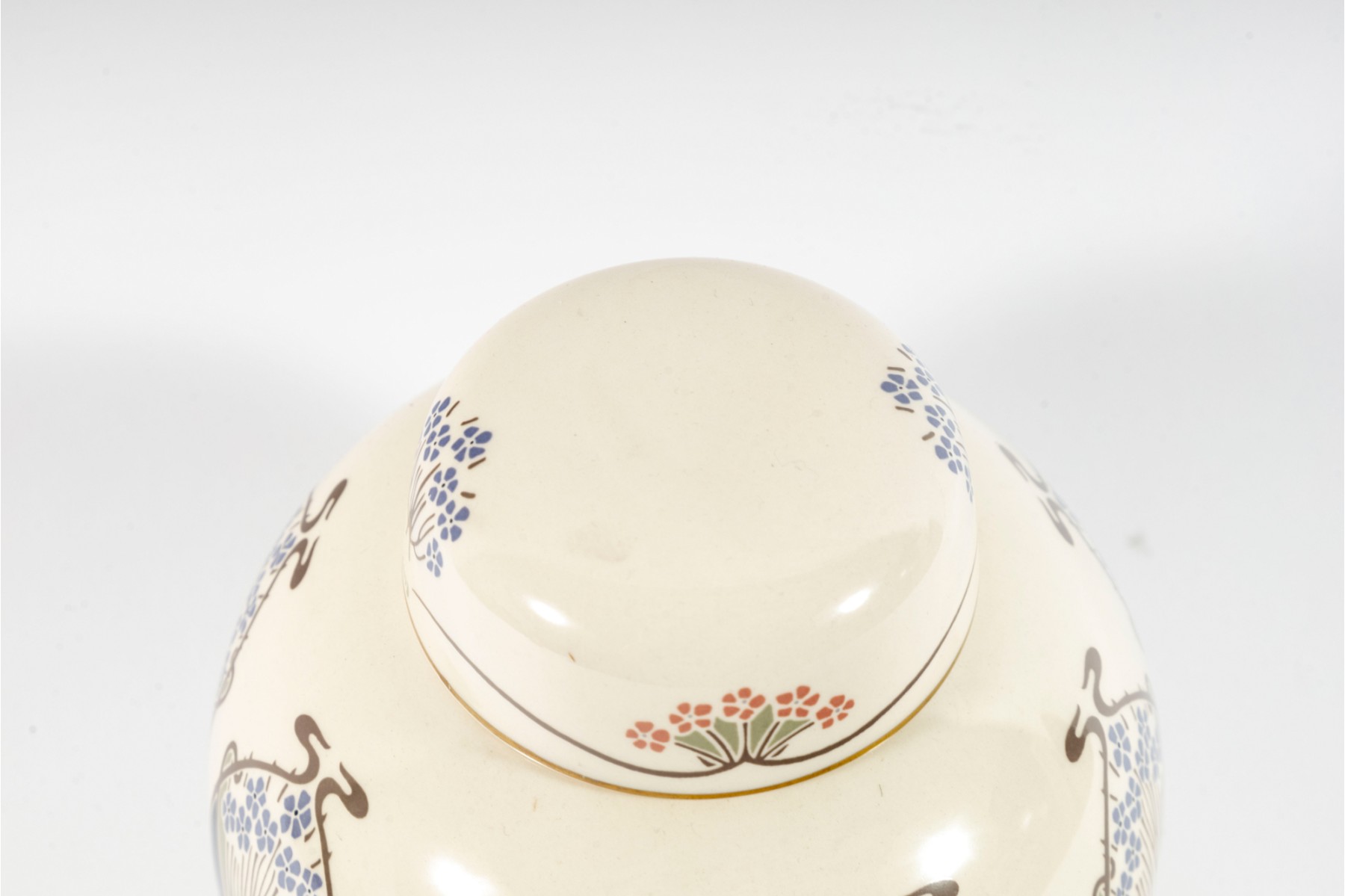 The 1987 Liberty London "Lanthe" Design lidded ginger jar produced by Mason's Ironstone China. Liberty London's 'Lanthe' design encapsulates Art Noveau in the form of repeating stencils along the exterior.