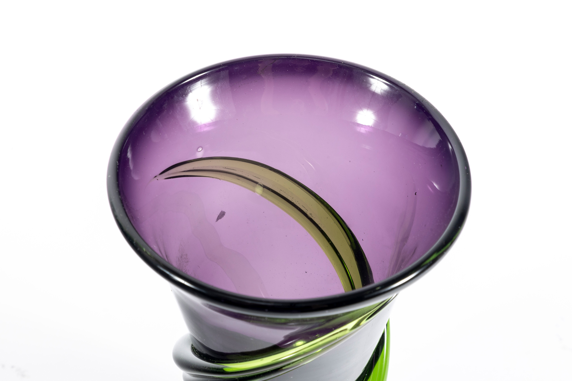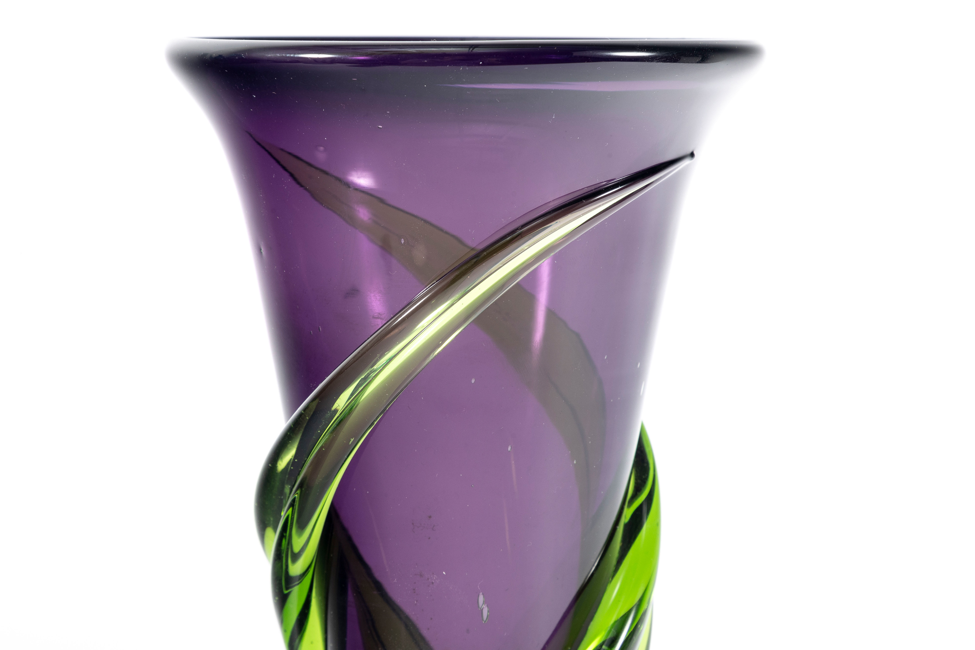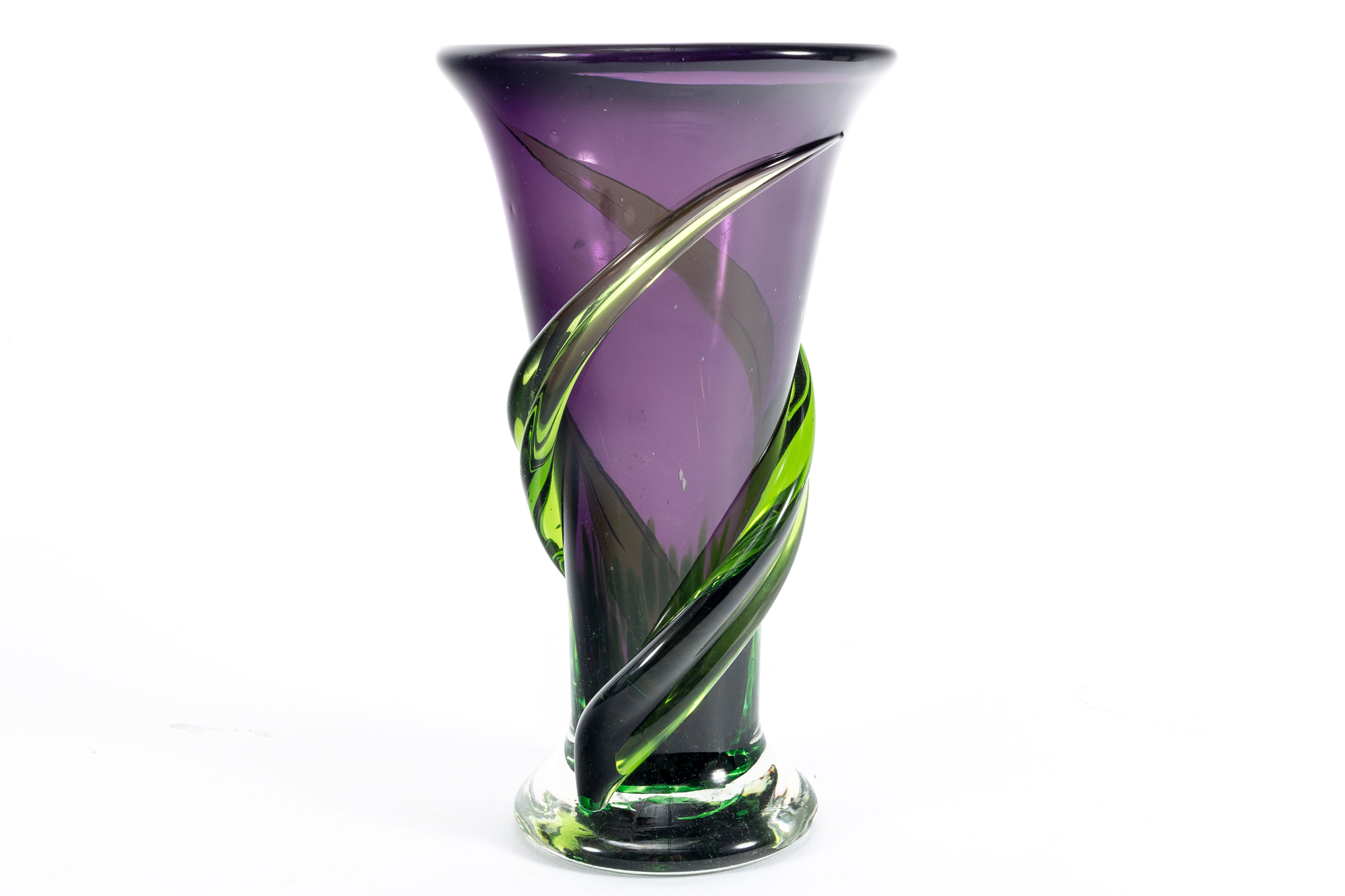 A beautiful 1990's hand-blown amethyst glass Teleflora vase, produced for the "Indulge Her Bouquet" arrangement. The exterior has been layered with swirls of green glass for an alluring contrast.