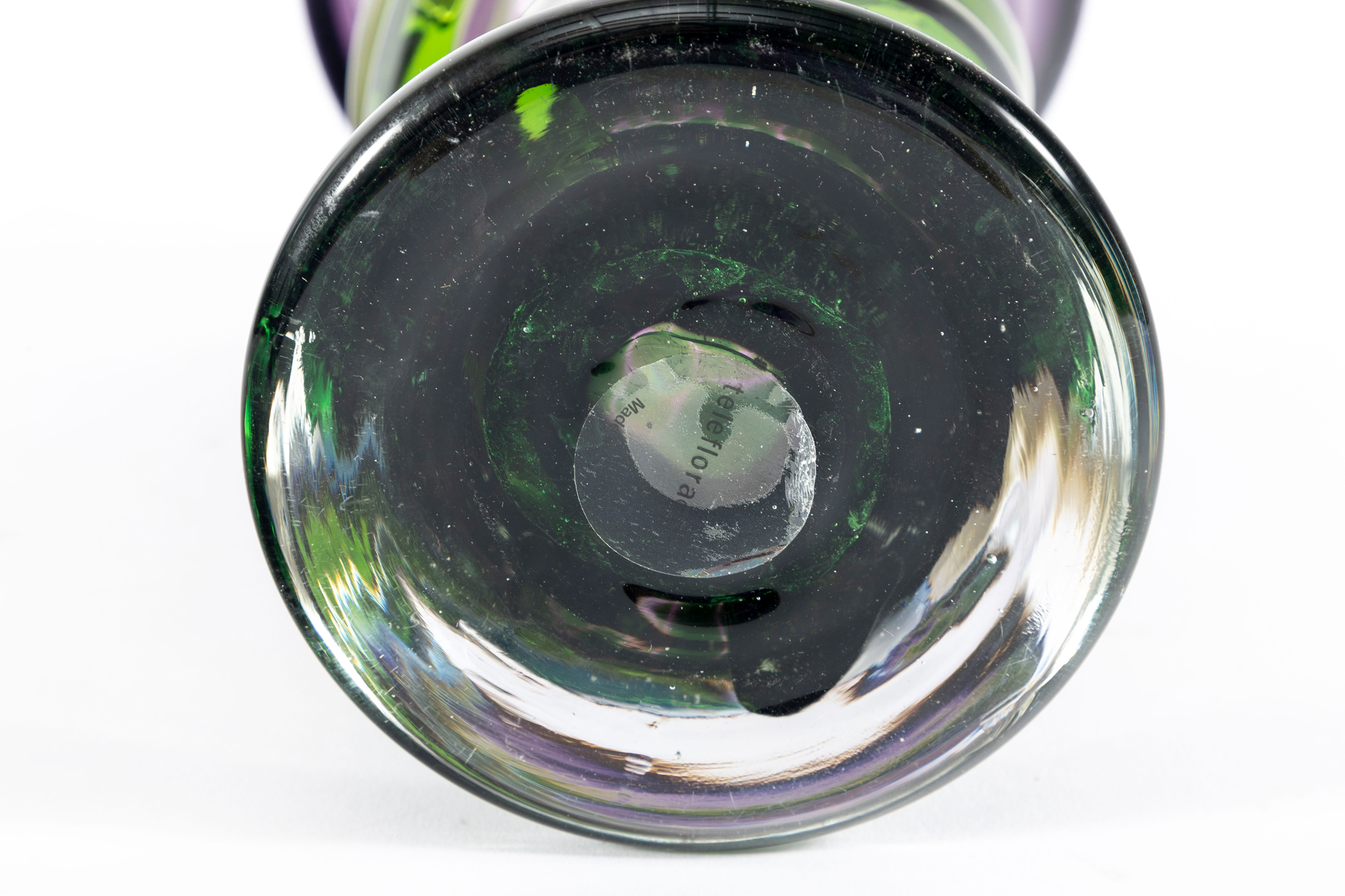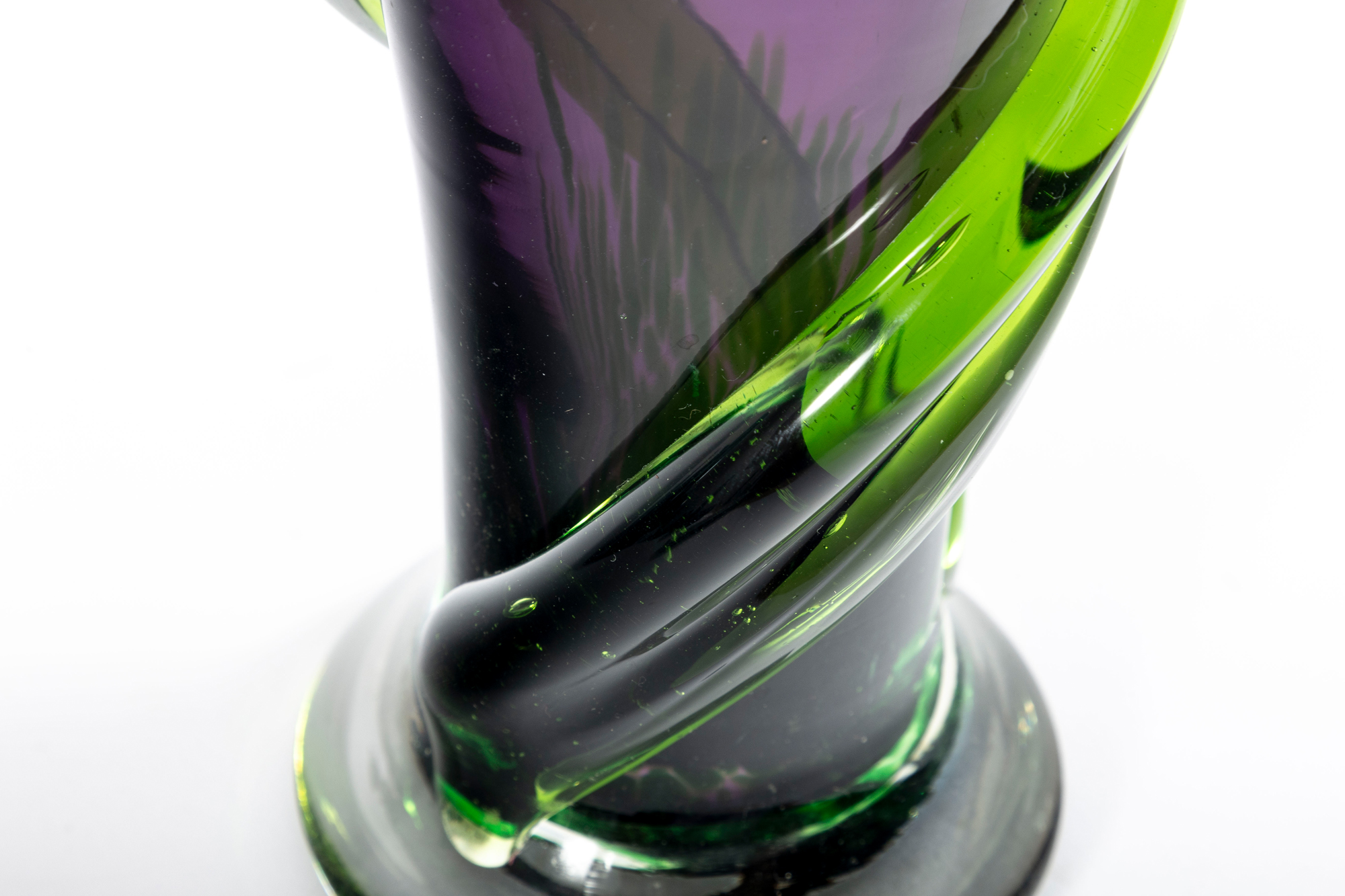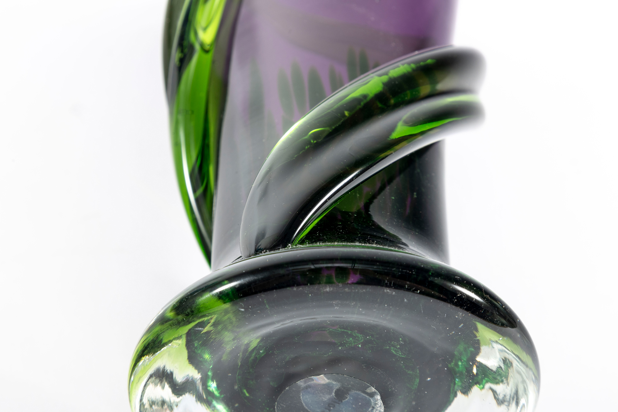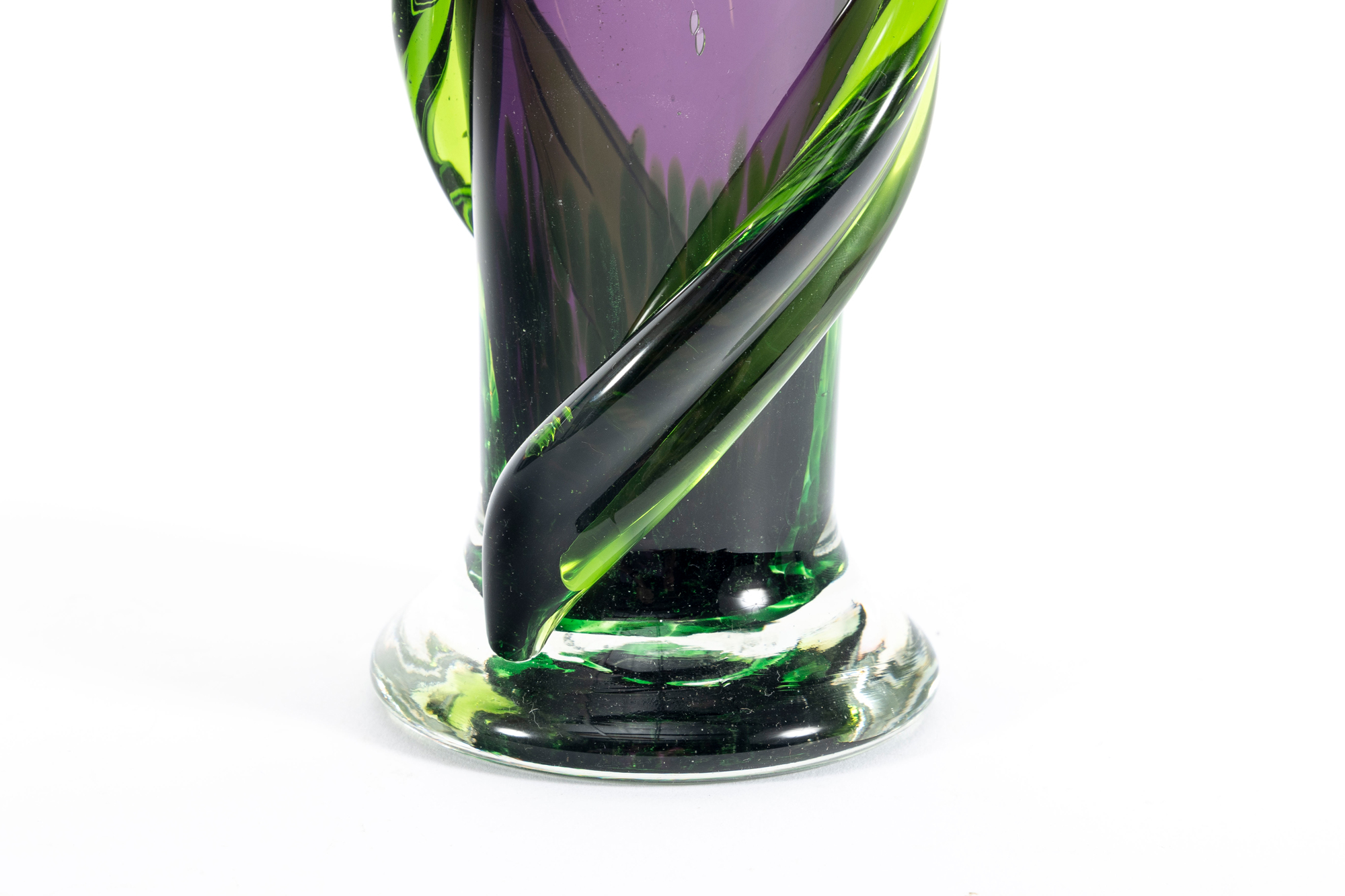 A beautiful 1990's hand-blown amethyst glass Teleflora vase, produced for the "Indulge Her Bouquet" arrangement. The exterior has been layered with swirls of green glass for an alluring contrast.