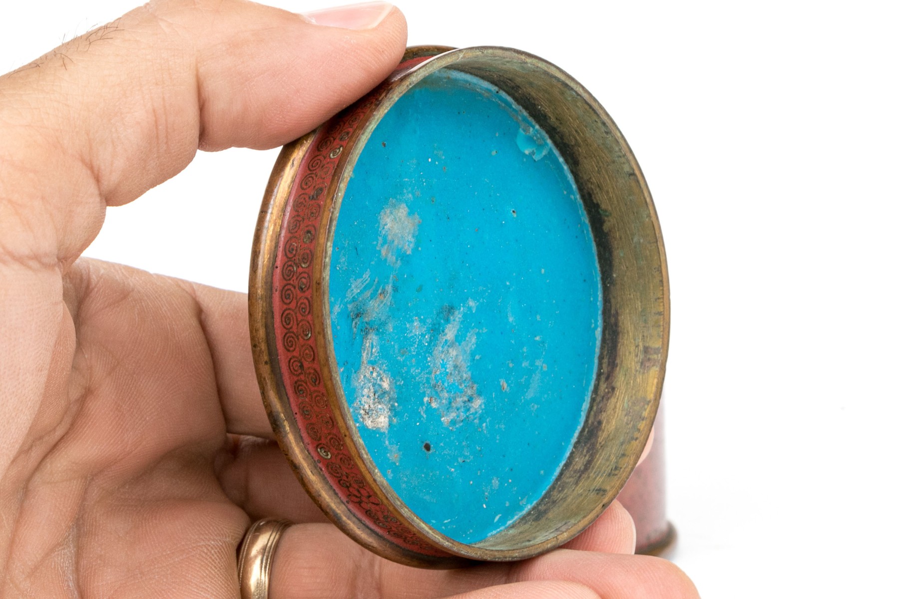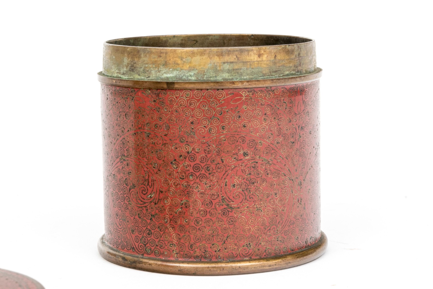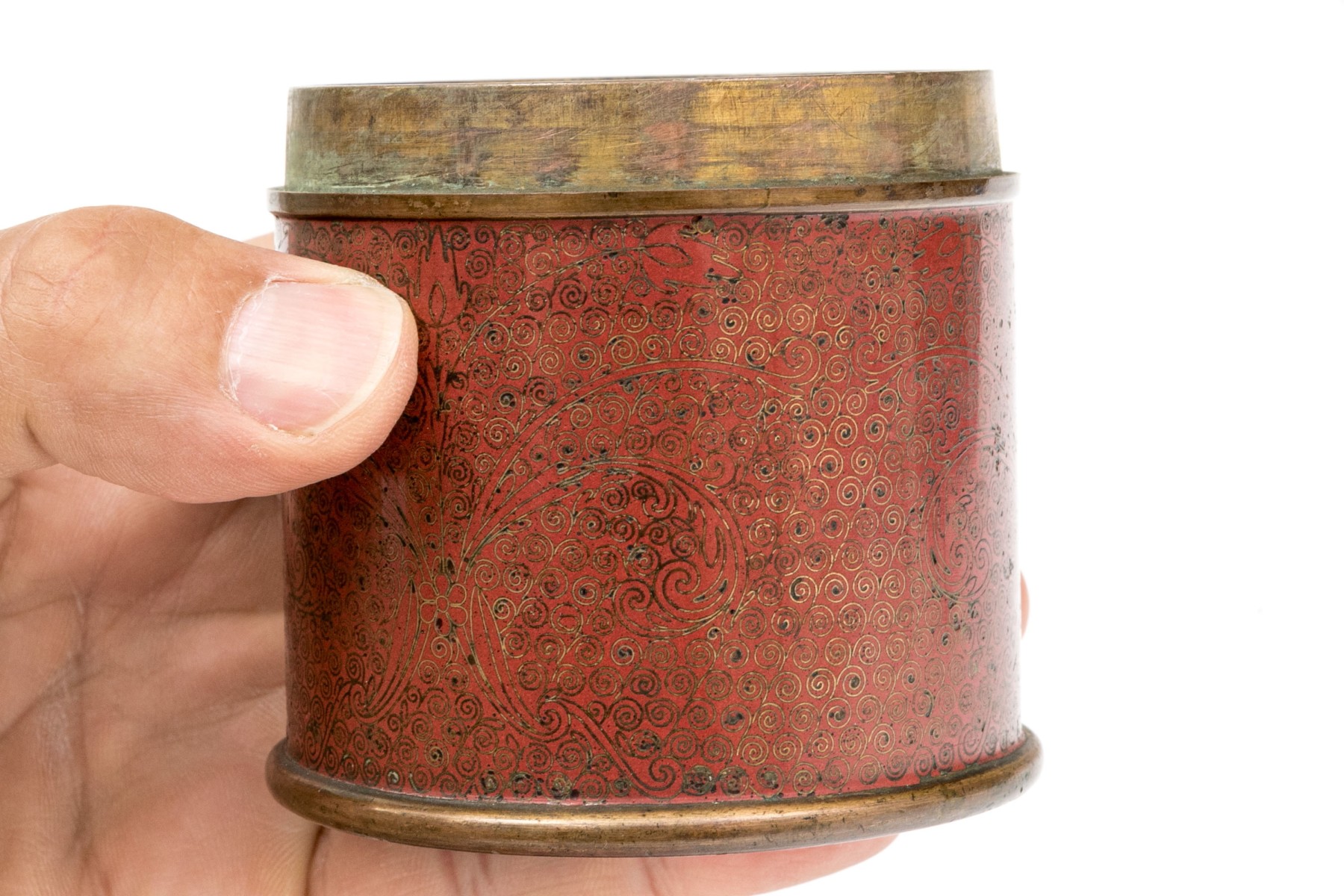 A gorgeous antique 19th century Chinese cloisonne lidded caddy or box in cylindrical form, sporting fine spirals around large foliate motifs in a striking earthy maroon hue. The interior of the lid is enameled in a vibrant turquoise hue.