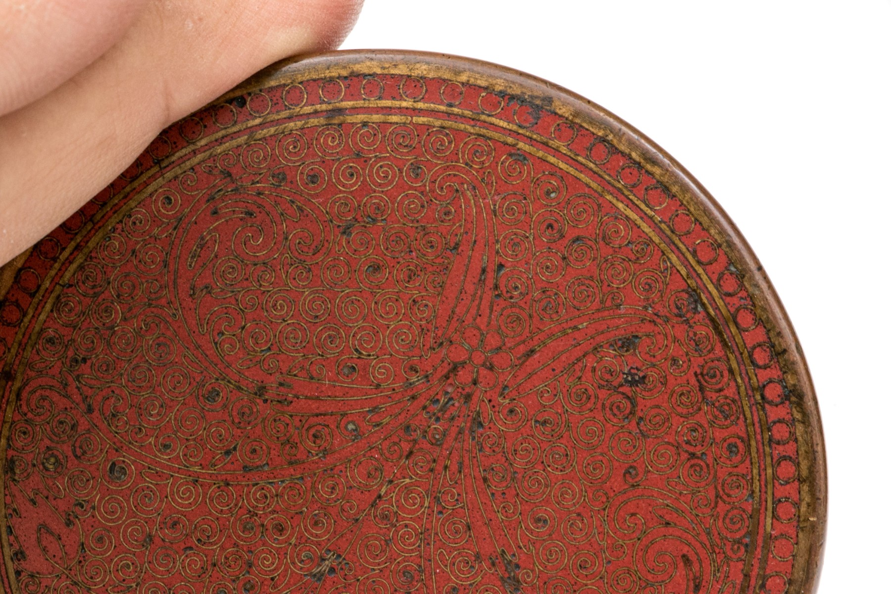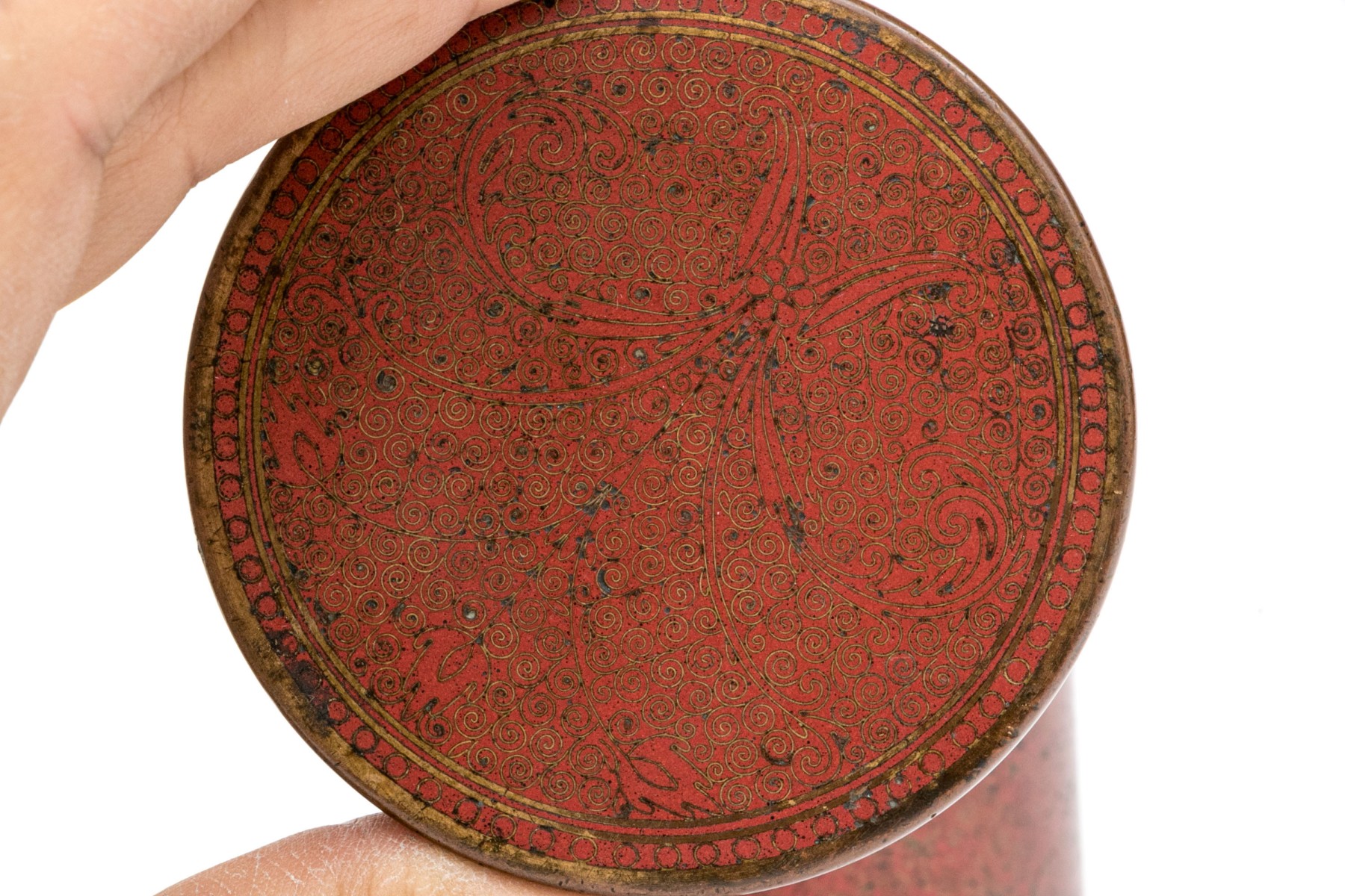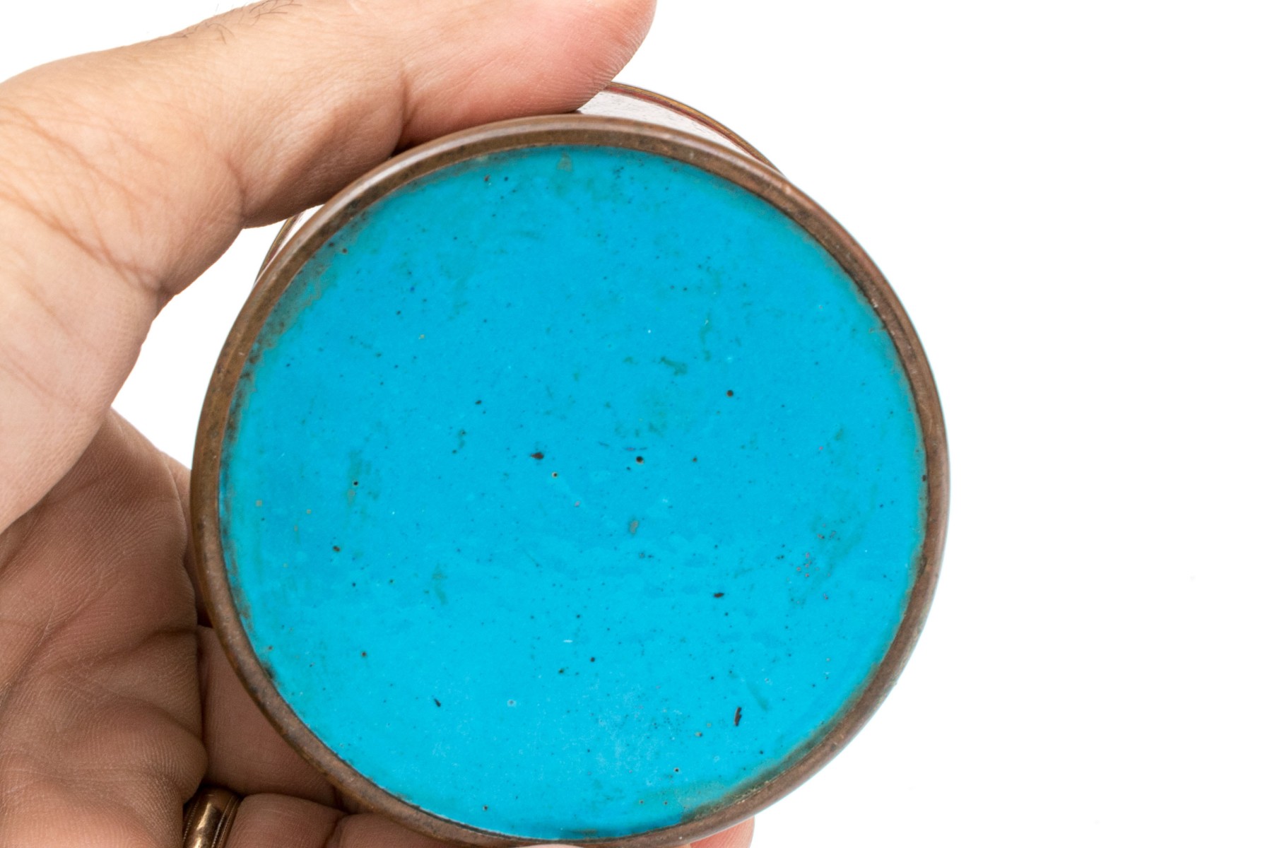 A gorgeous antique 19th century Chinese cloisonne lidded caddy or box in cylindrical form, sporting fine spirals around large foliate motifs in a striking earthy maroon hue. The interior of the lid is enameled in a vibrant turquoise hue.