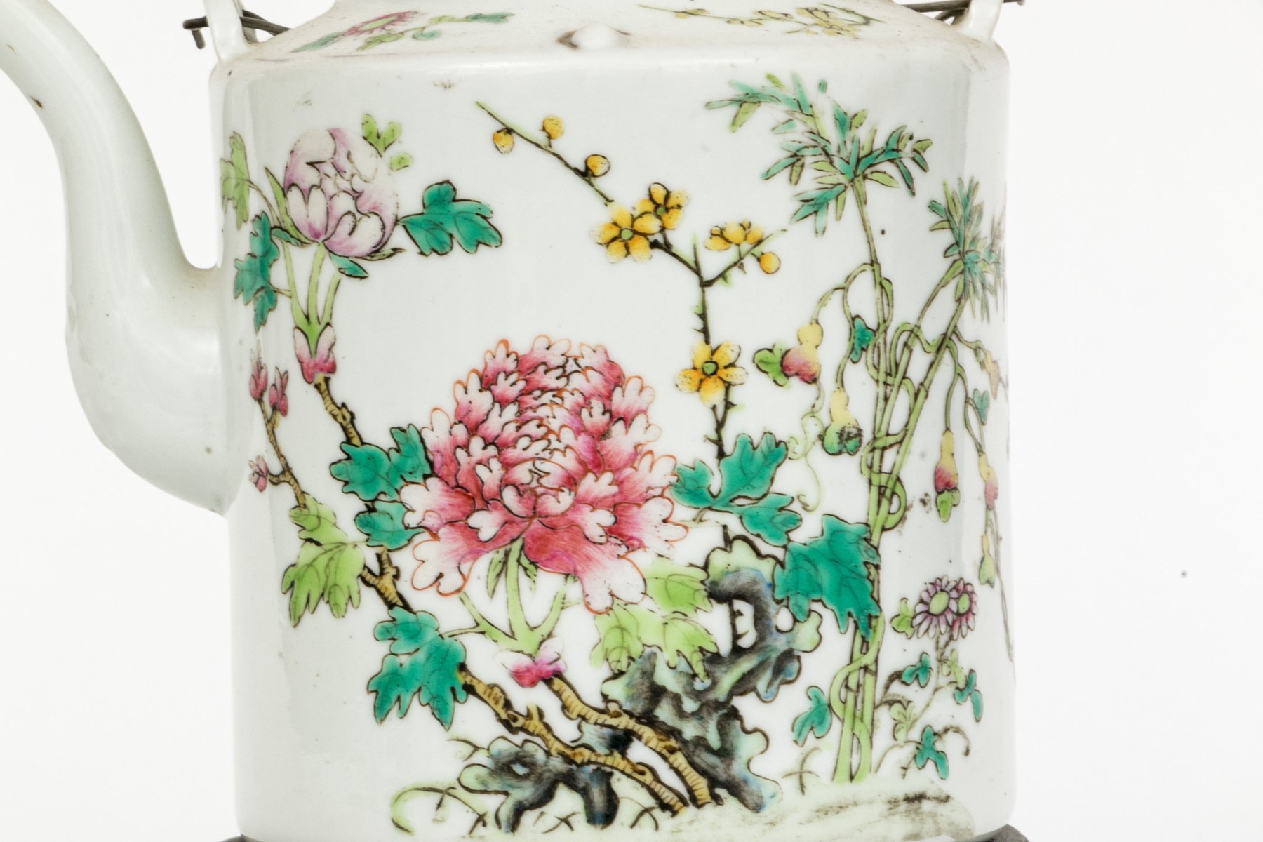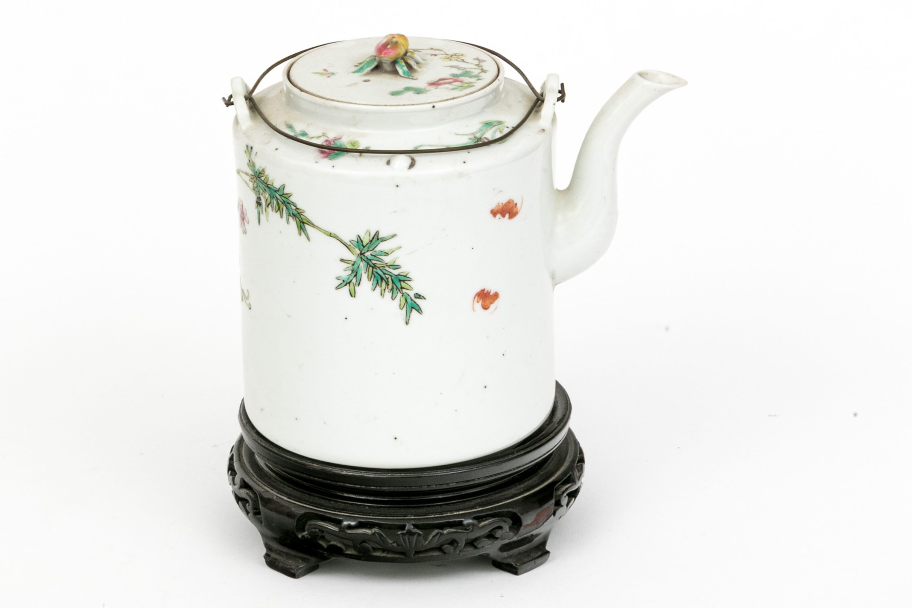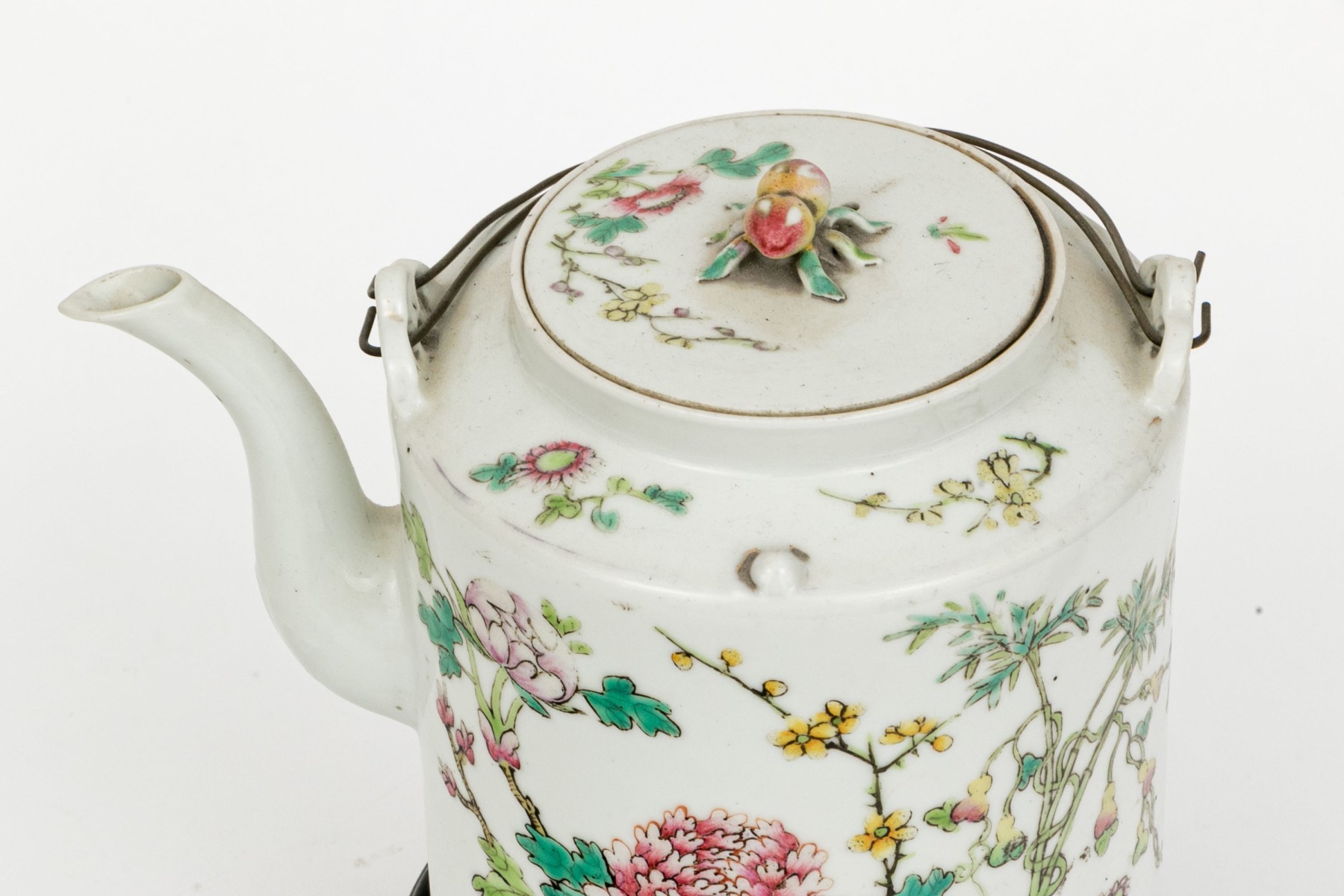 A gorgeous 19th century Chinese porcelain lidded teapot in cylindrical form with a handsomely curved spout. hand-decorated with vibrant famille rose flowering trees and foliage. The circular lid is adorned with a sculptural peach finial, complementing the floral motifs.