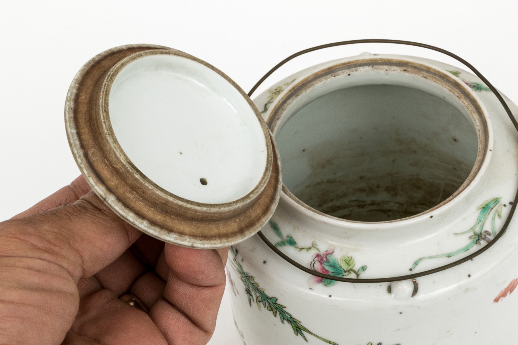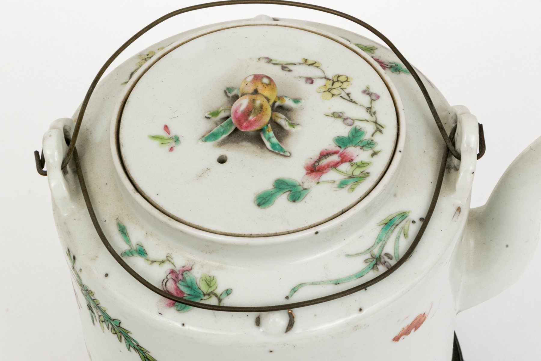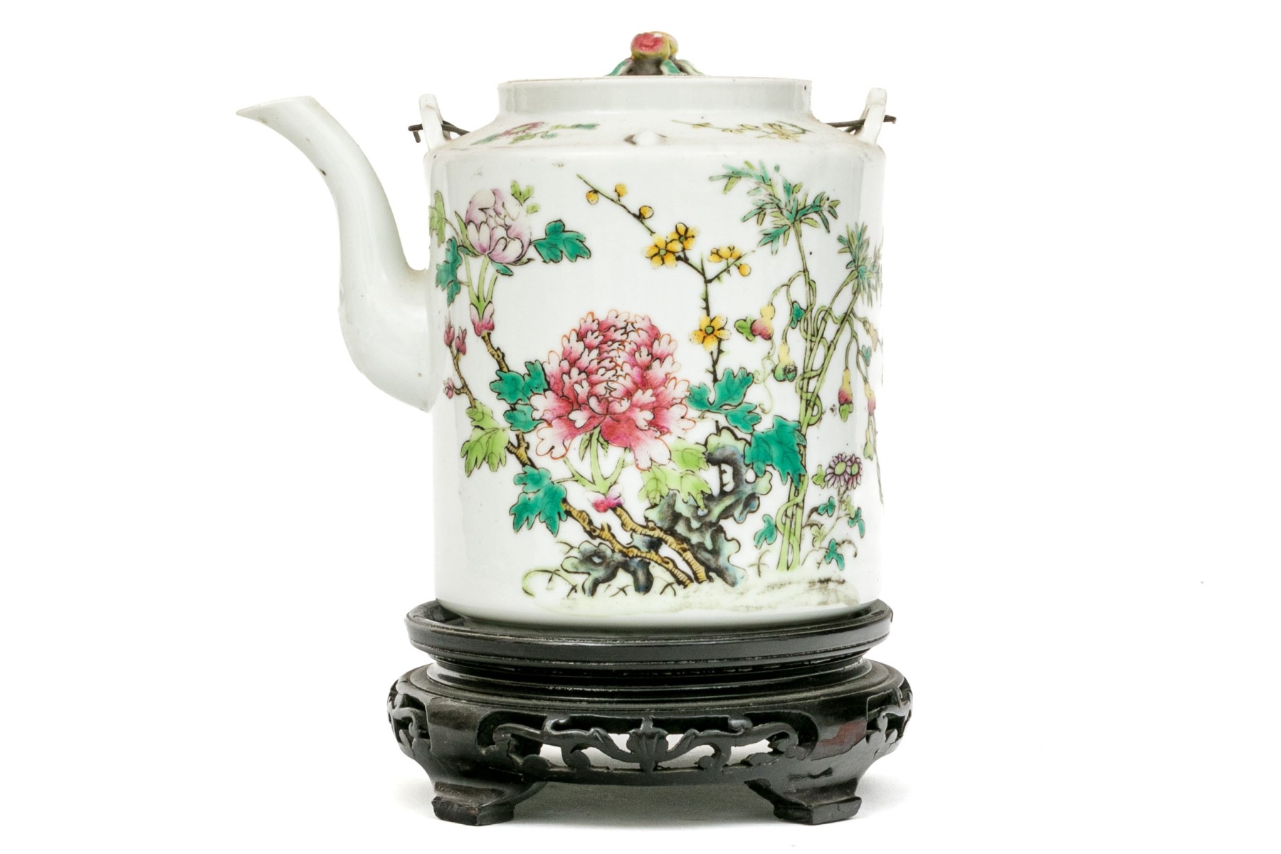 A gorgeous 19th century Chinese porcelain lidded teapot in cylindrical form with a handsomely curved spout. hand-decorated with vibrant famille rose flowering trees and foliage. The circular lid is adorned with a sculptural peach finial, complementing the floral motifs.
