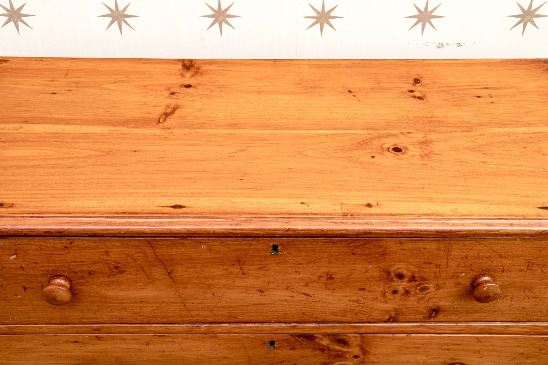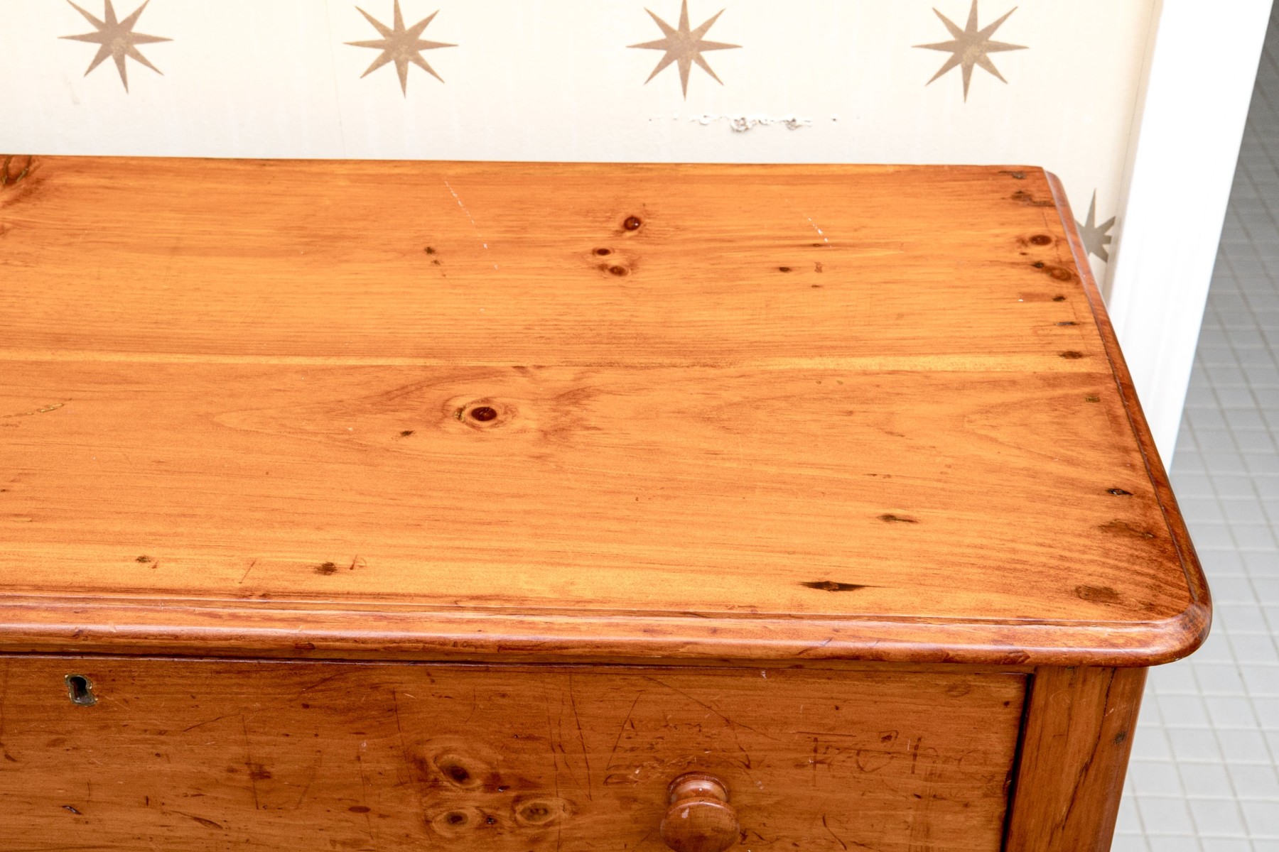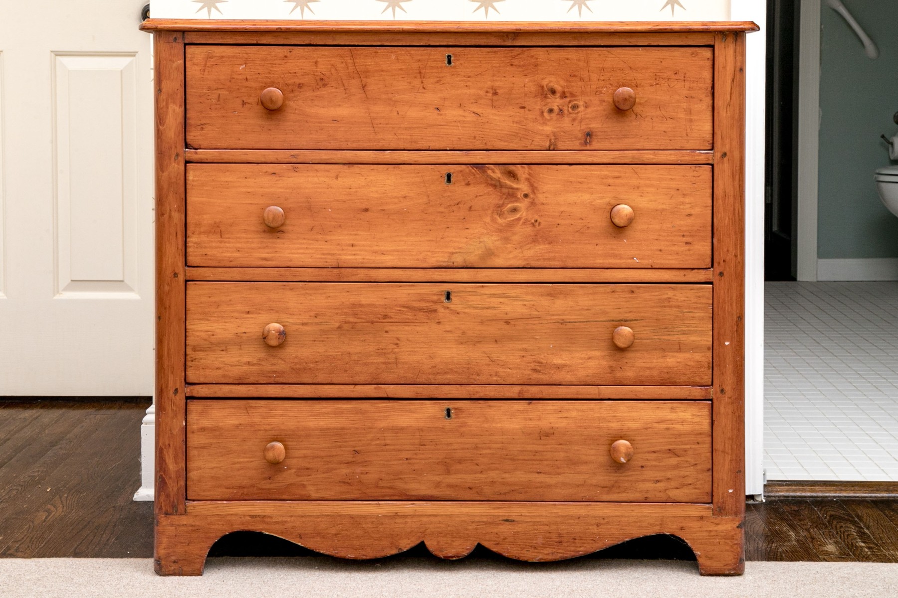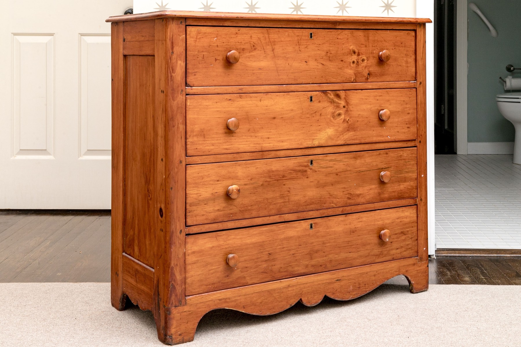 A lovely country chest of drawers circa 1850, finely constructed in warm brown pine. Features a rounded rectangular top with a beveled edge overhanging four drawers each adorned with simple knob handles. Raised on bracket feet flanking a scalloped apron.