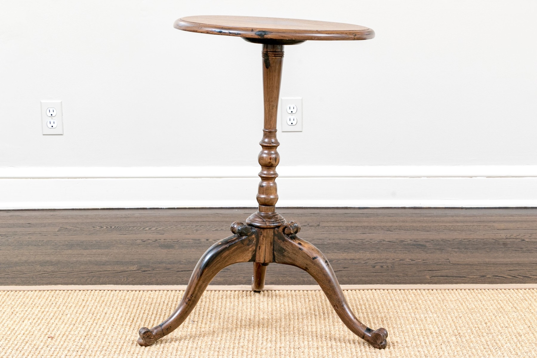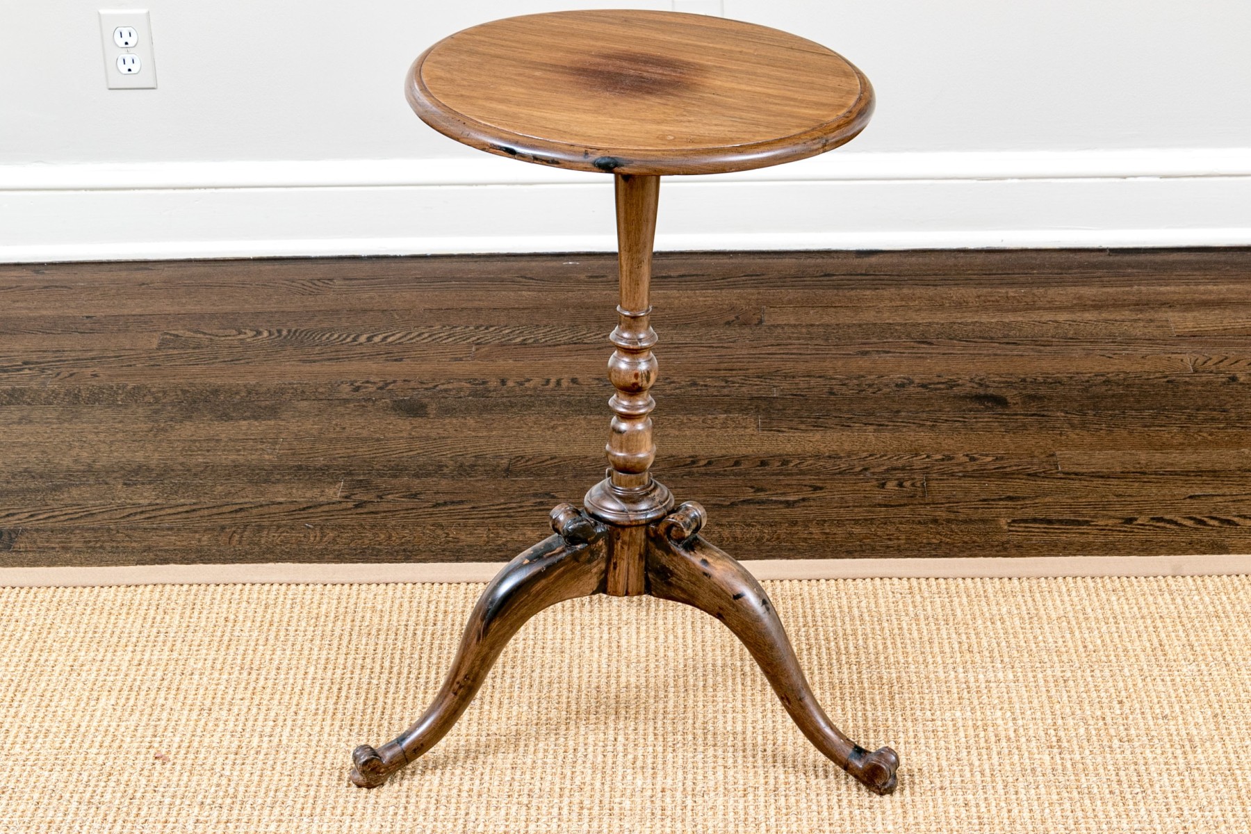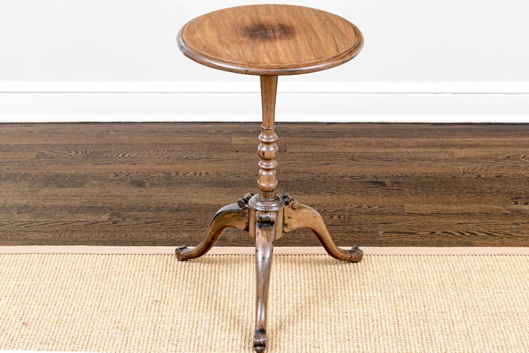 A delightful, classic 19th century candle stand in light brown finished rosewood, standing upon three curved legs with turned pedestal supporting the circular table top.
