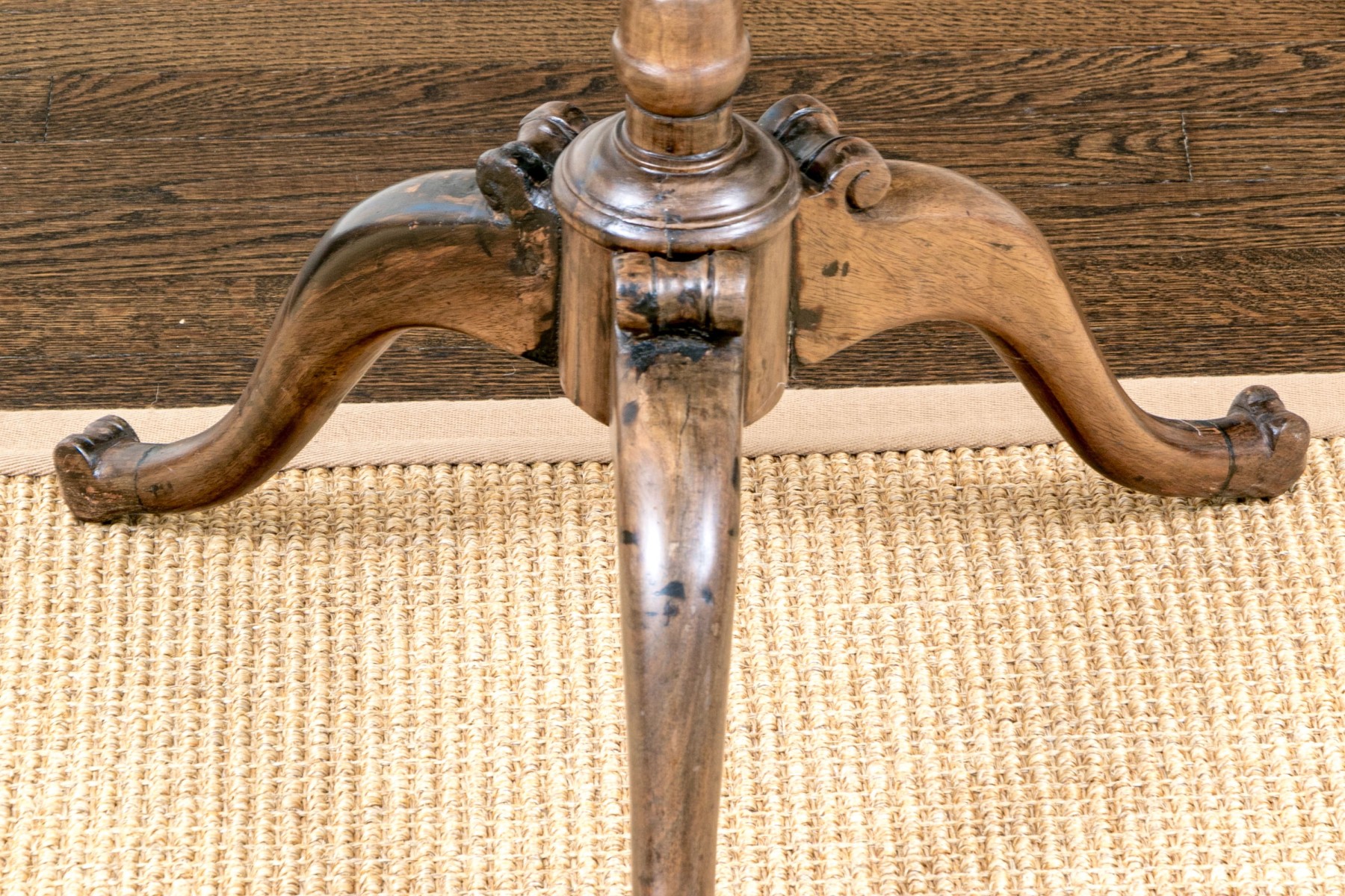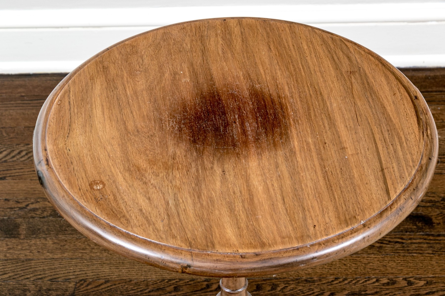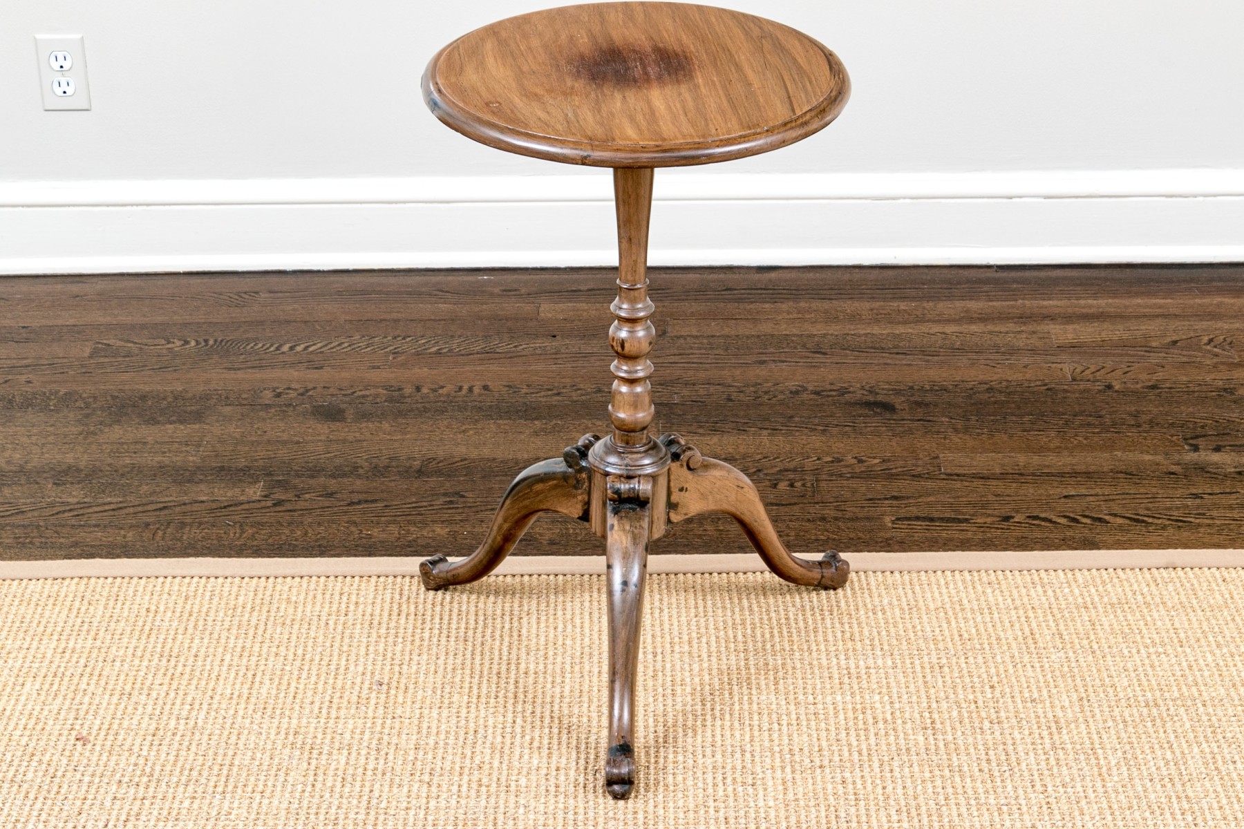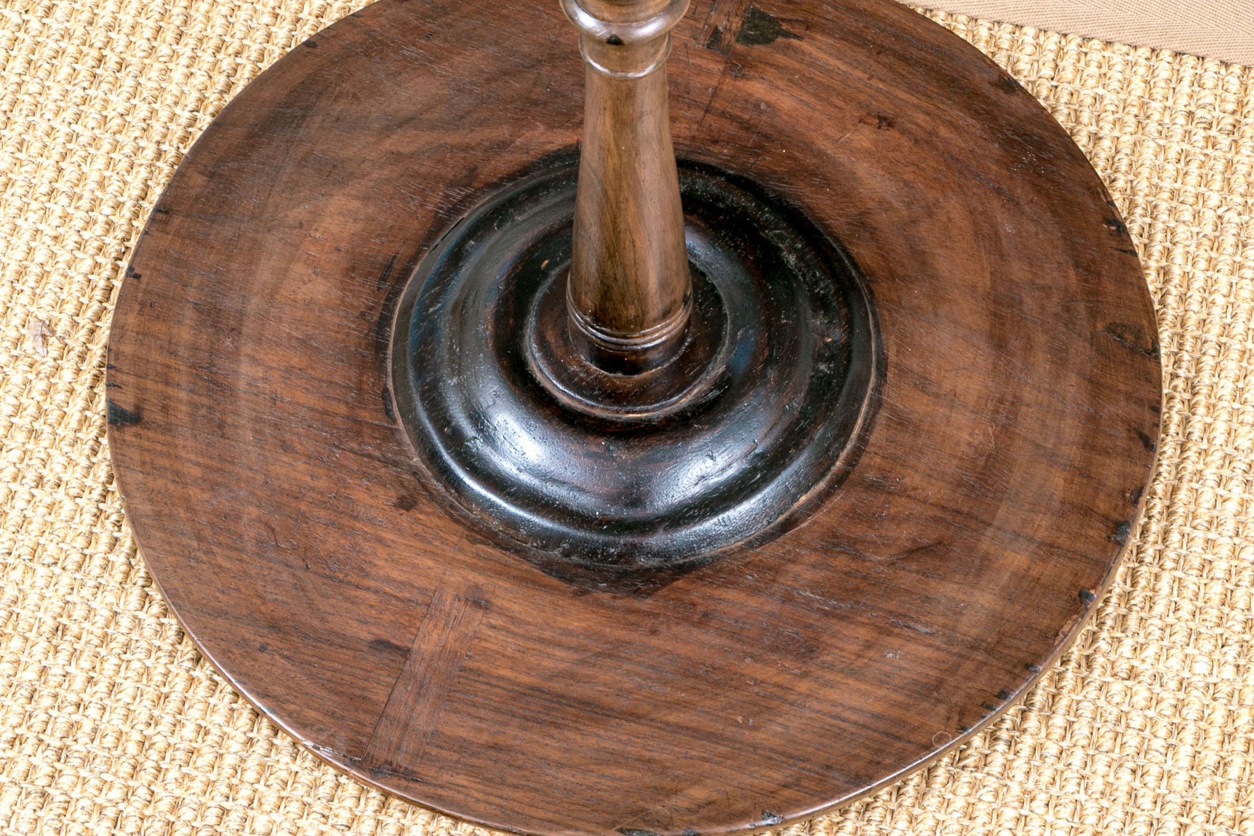 A delightful, classic 19th century candle stand in light brown finished rosewood, standing upon three curved legs with turned pedestal supporting the circular table top.