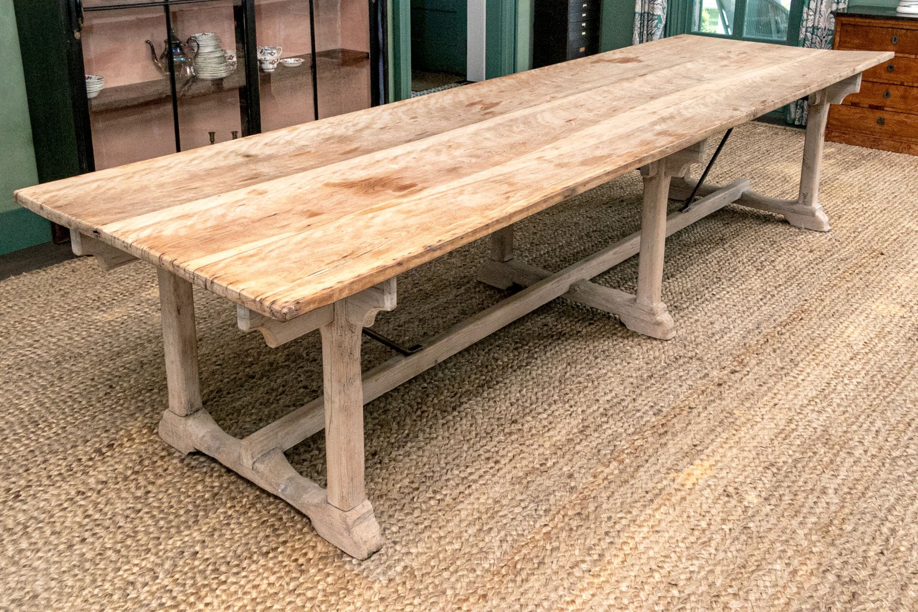 Sycamore and Pine Refectory Dining Table, English 1840. A extraordinary Antique Banquet Dining table featuring a long 11'6" planked rectangular top raised on six feet with three supports and trestle stretcher supports with iron brackets. The Table sits very solidly and can accommodate 12 or more people with ease.