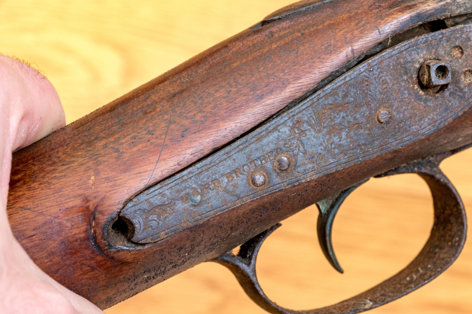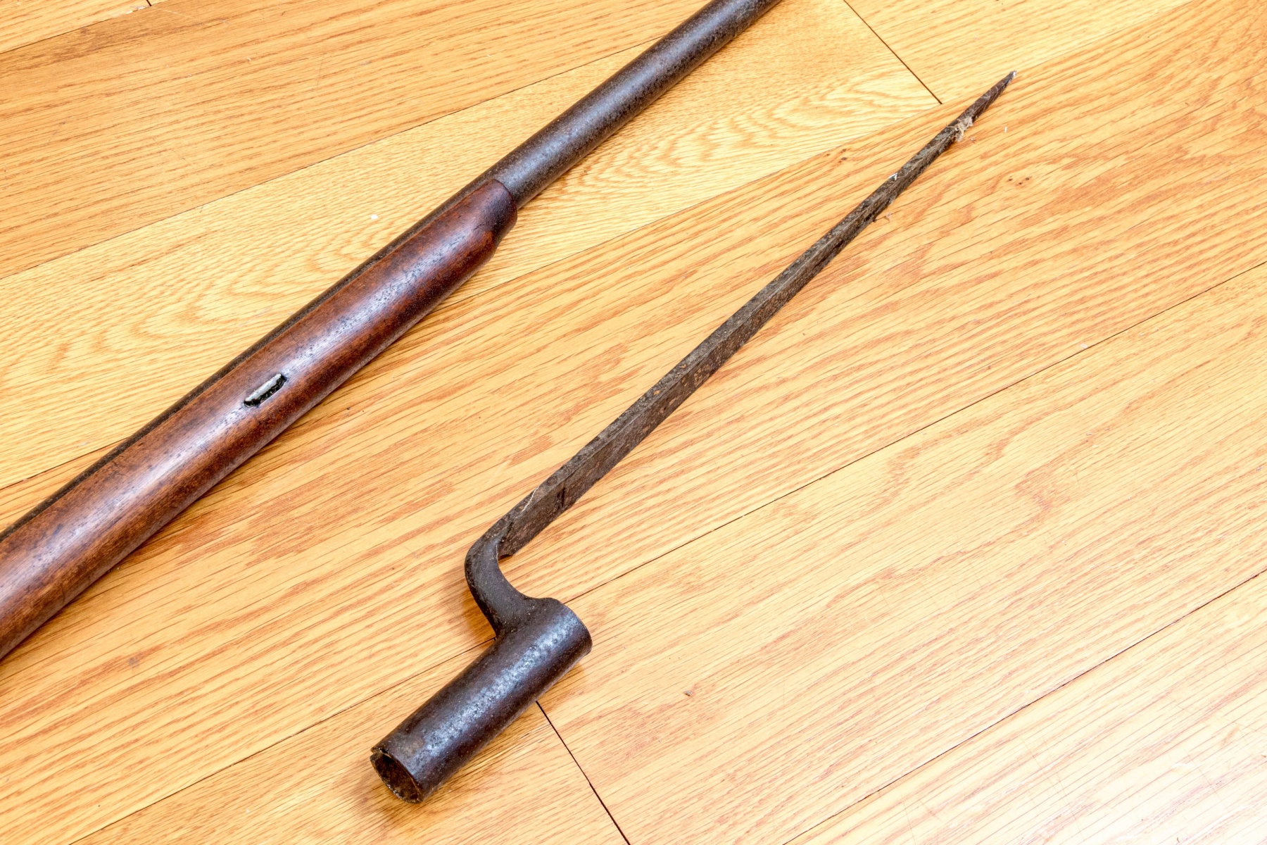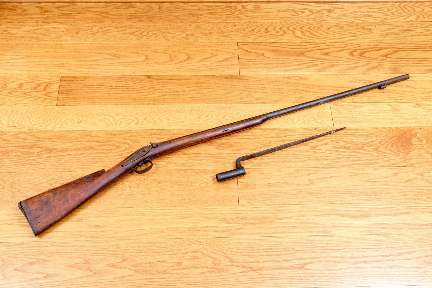 A 19th century Ford Brothers precision rifle with an iron and wood frame. Includes an attachable iron bayonet.