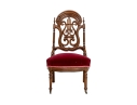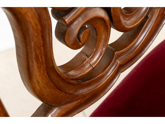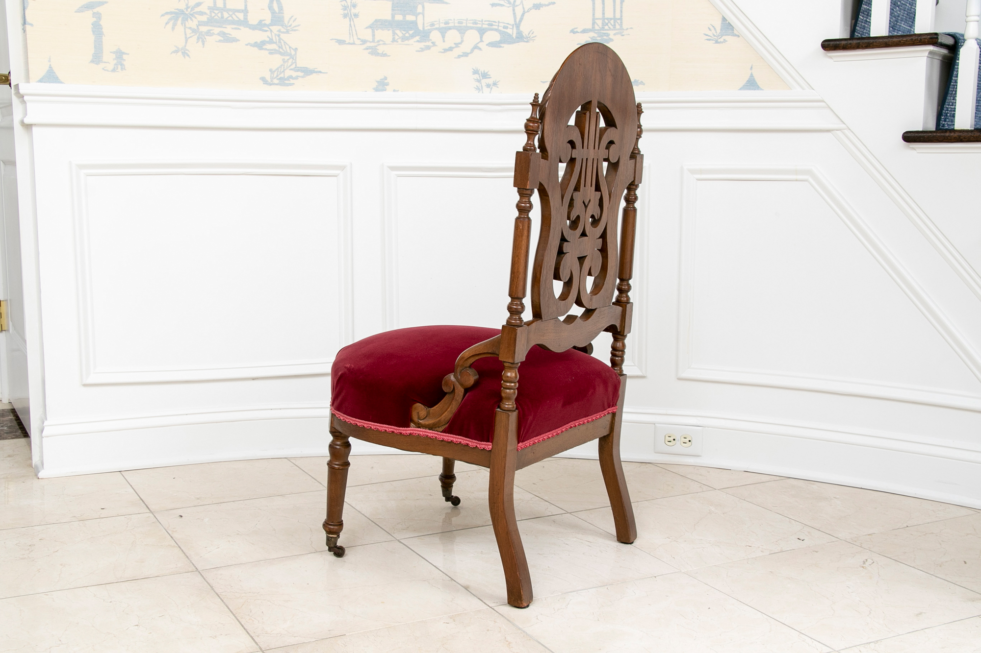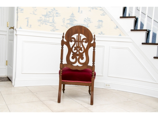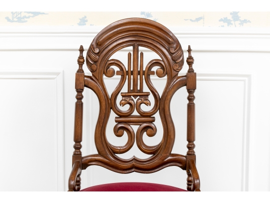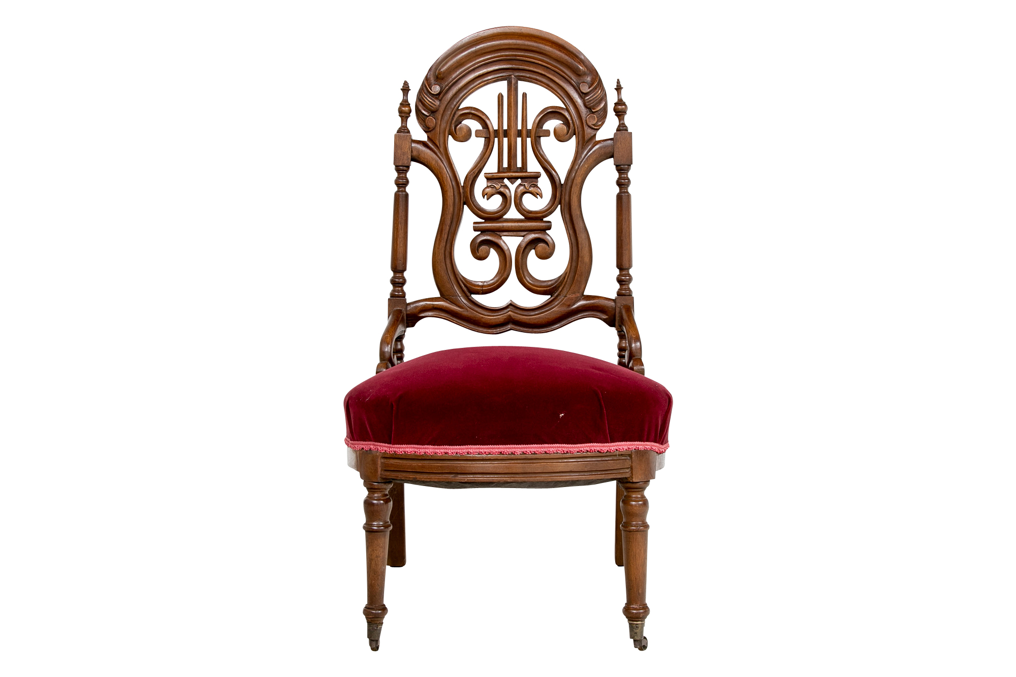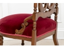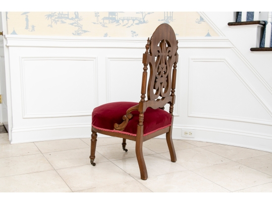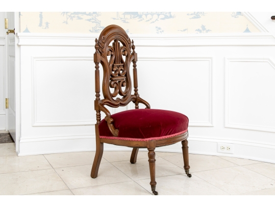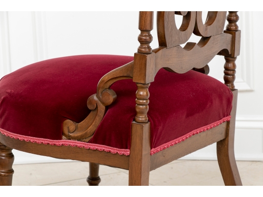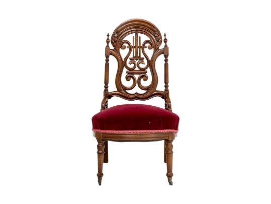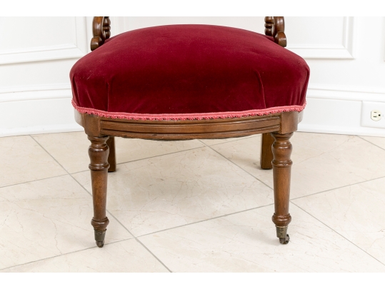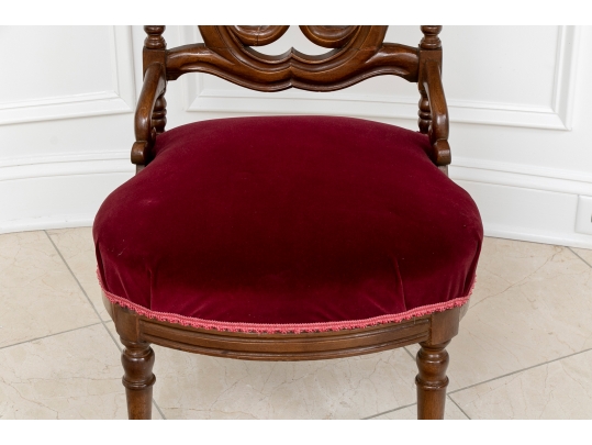 A charming chair with carved openwork arch top back with a center lyre with bird heads within a scrolled frame. The turned sides with finials, and lower scrolled attachments to the seat. Splayed turned front legs and curved square back ones. The low seat upholstered in a wine red velvet.