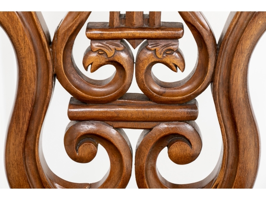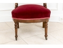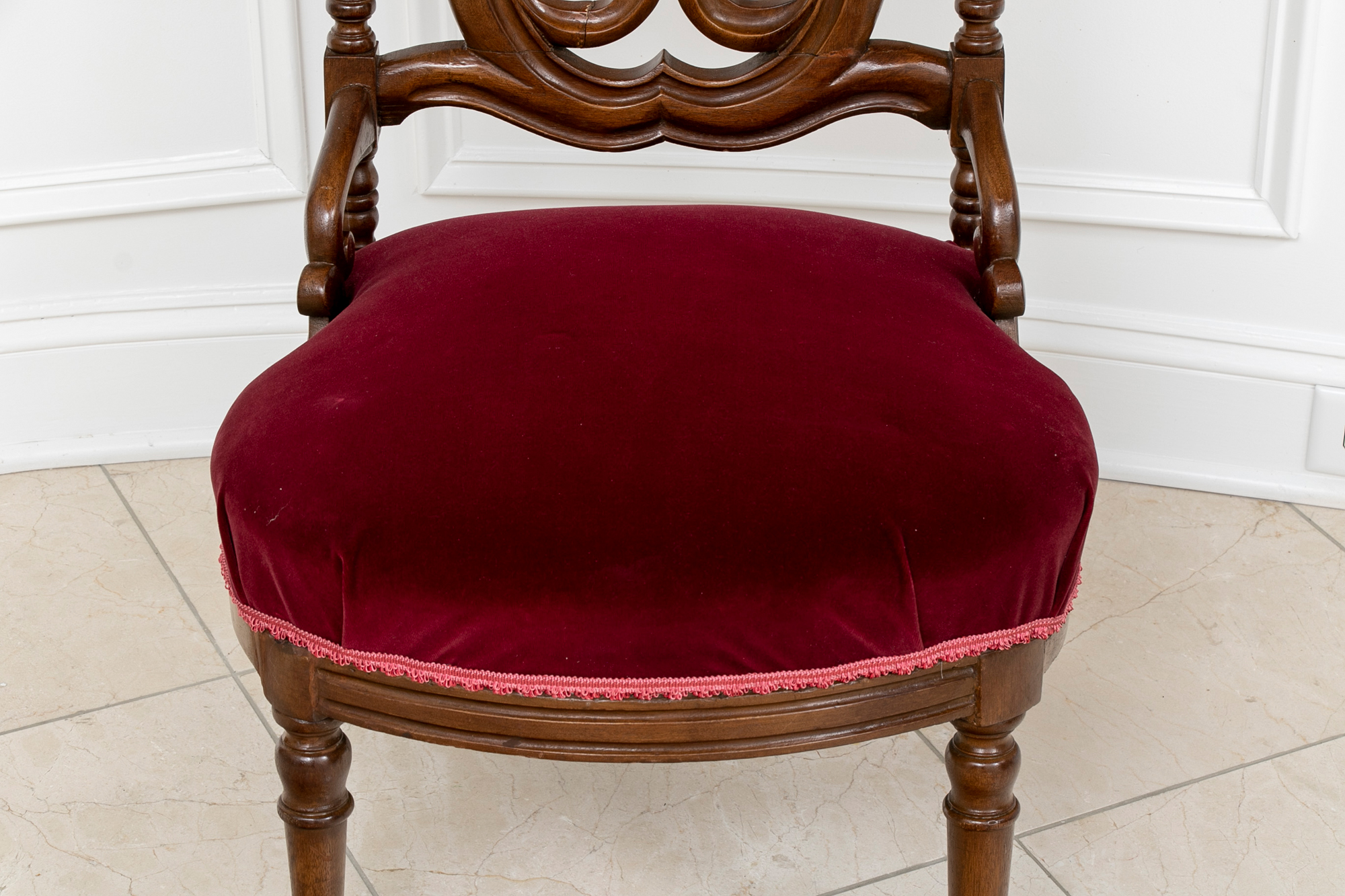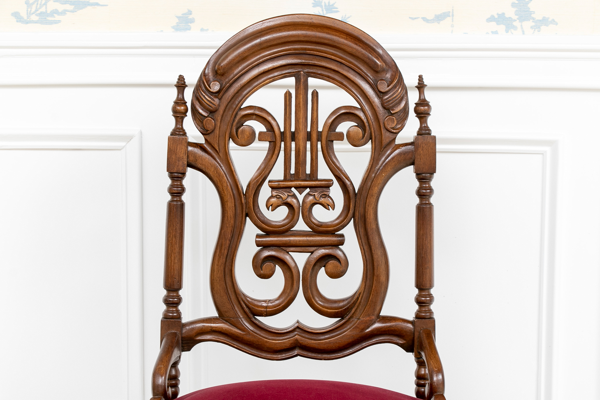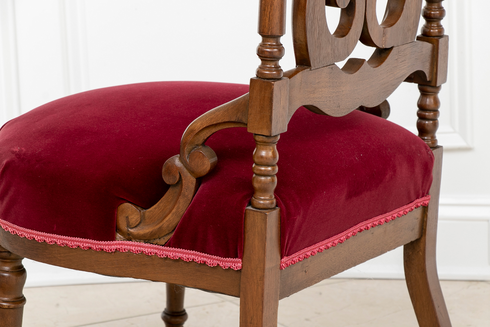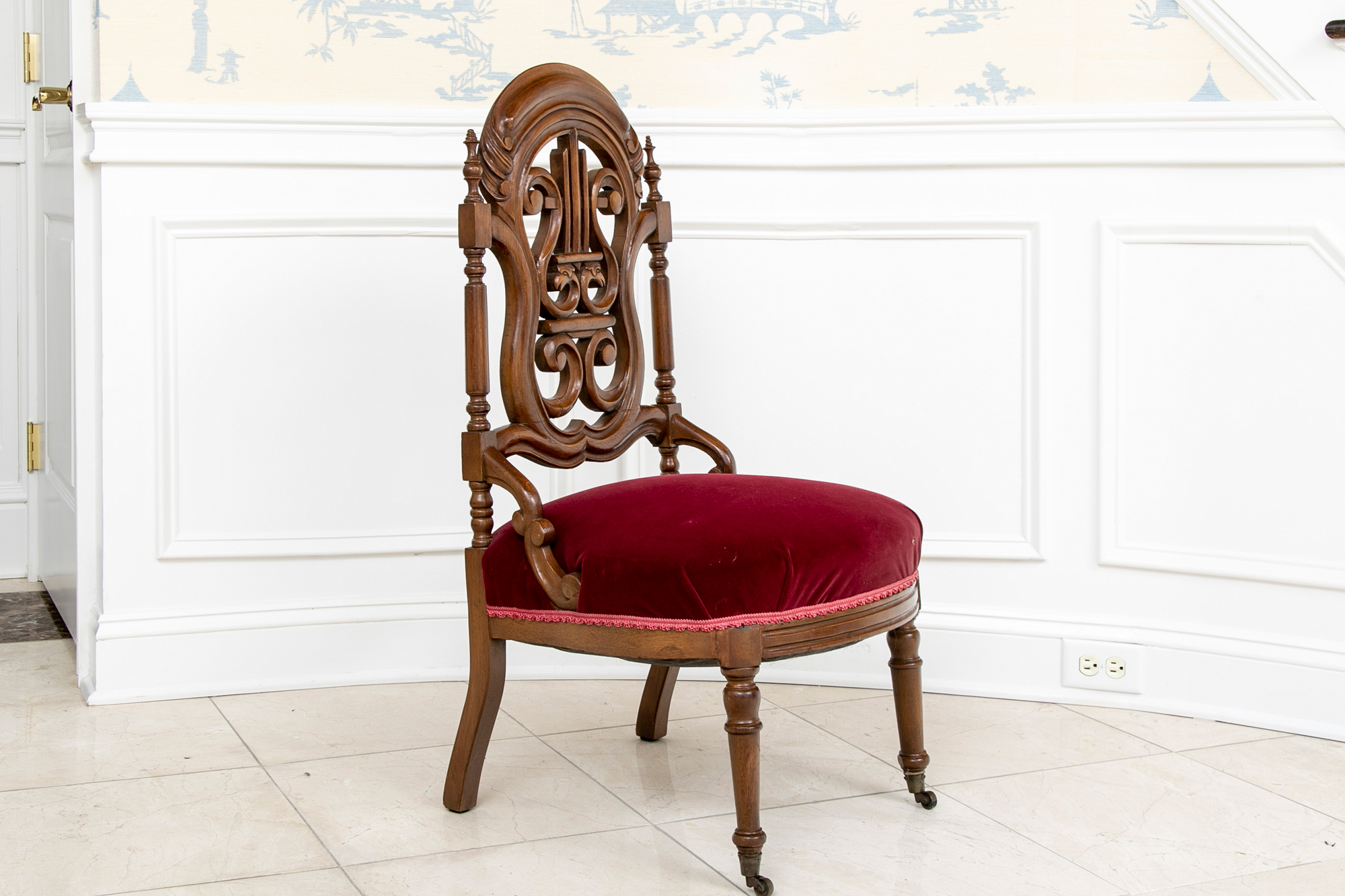 A charming chair with carved openwork arch top back with a center lyre with bird heads within a scrolled frame. The turned sides with finials, and lower scrolled attachments to the seat. Splayed turned front legs and curved square back ones. The low seat upholstered in a wine red velvet.
