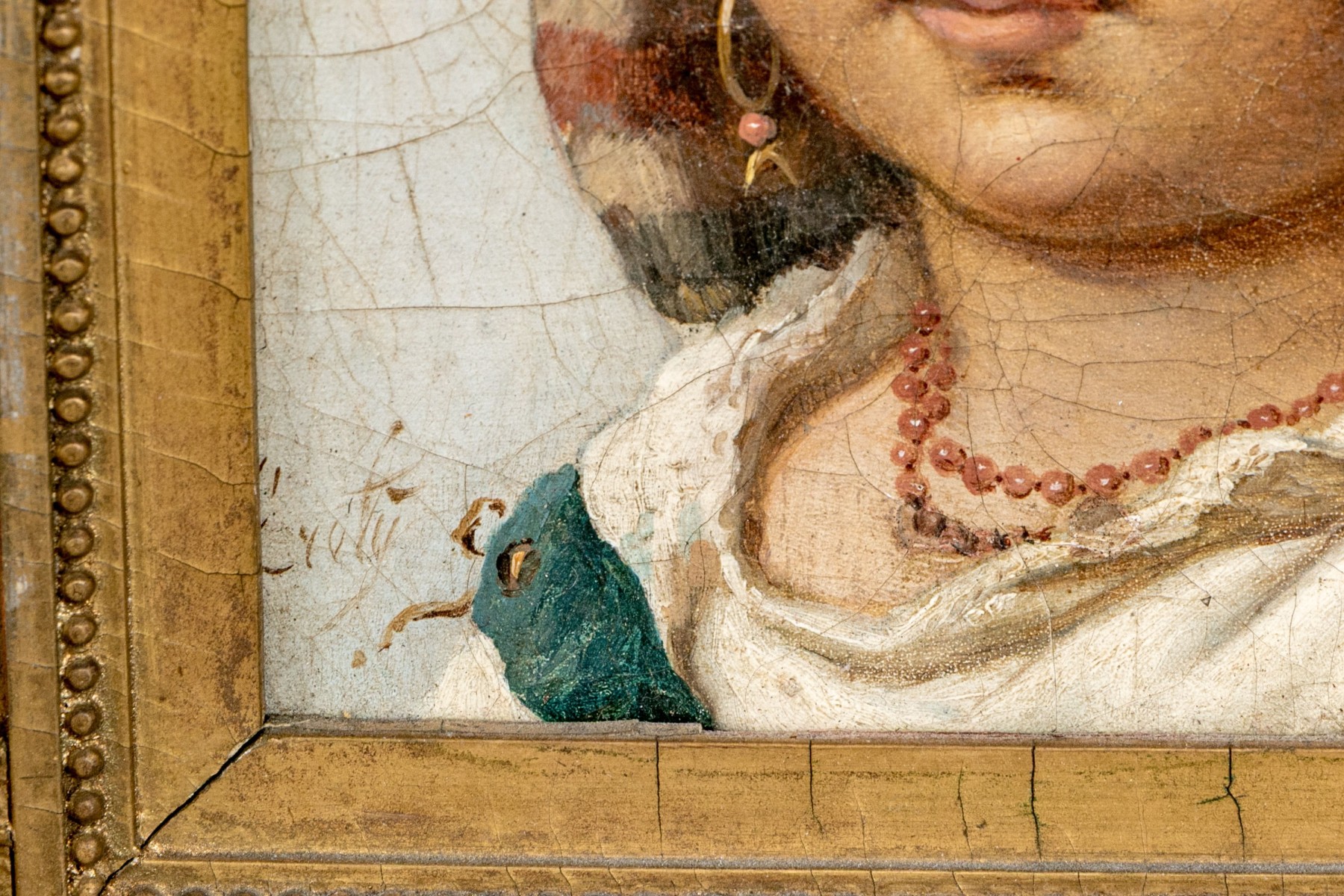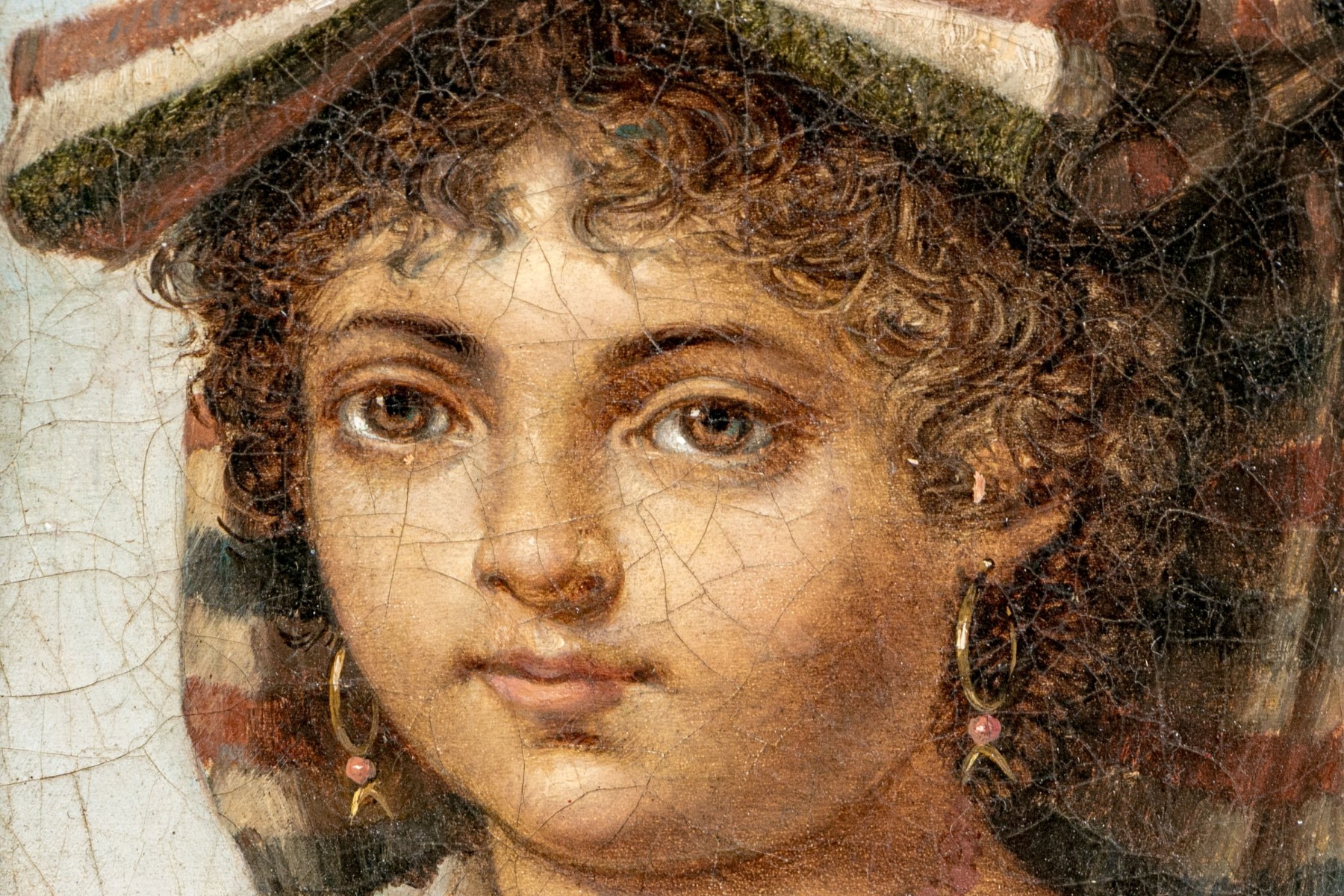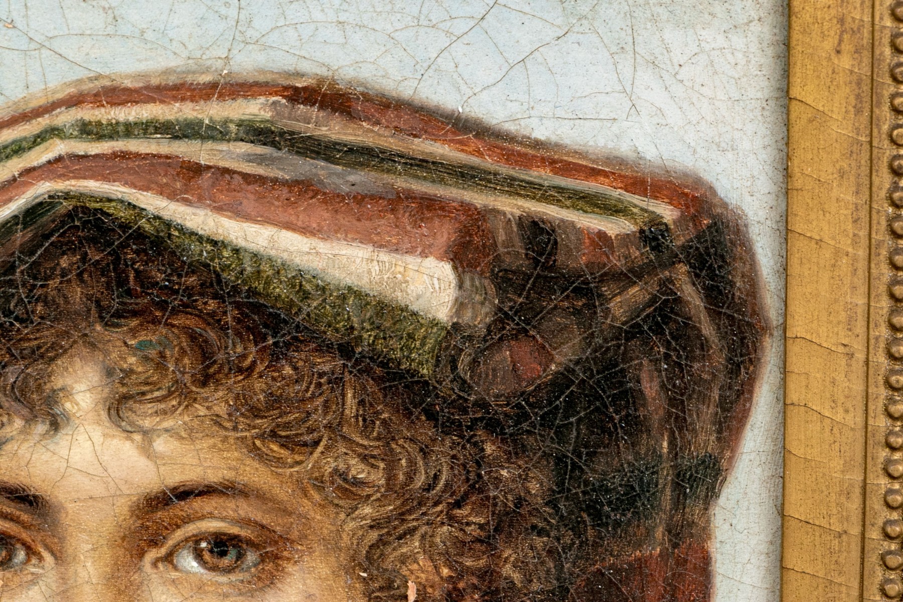 A delightful 19th century Italian school oil painting on canvas depicting a portrait of a young woman with curly brunette hair wearing a folded over headdress in cream, red, and green striped fabric. The woman wears gold hoop earrings and layered necklaces with a white dress and teal green apron straps against a pale blue sky. Signed lower left.