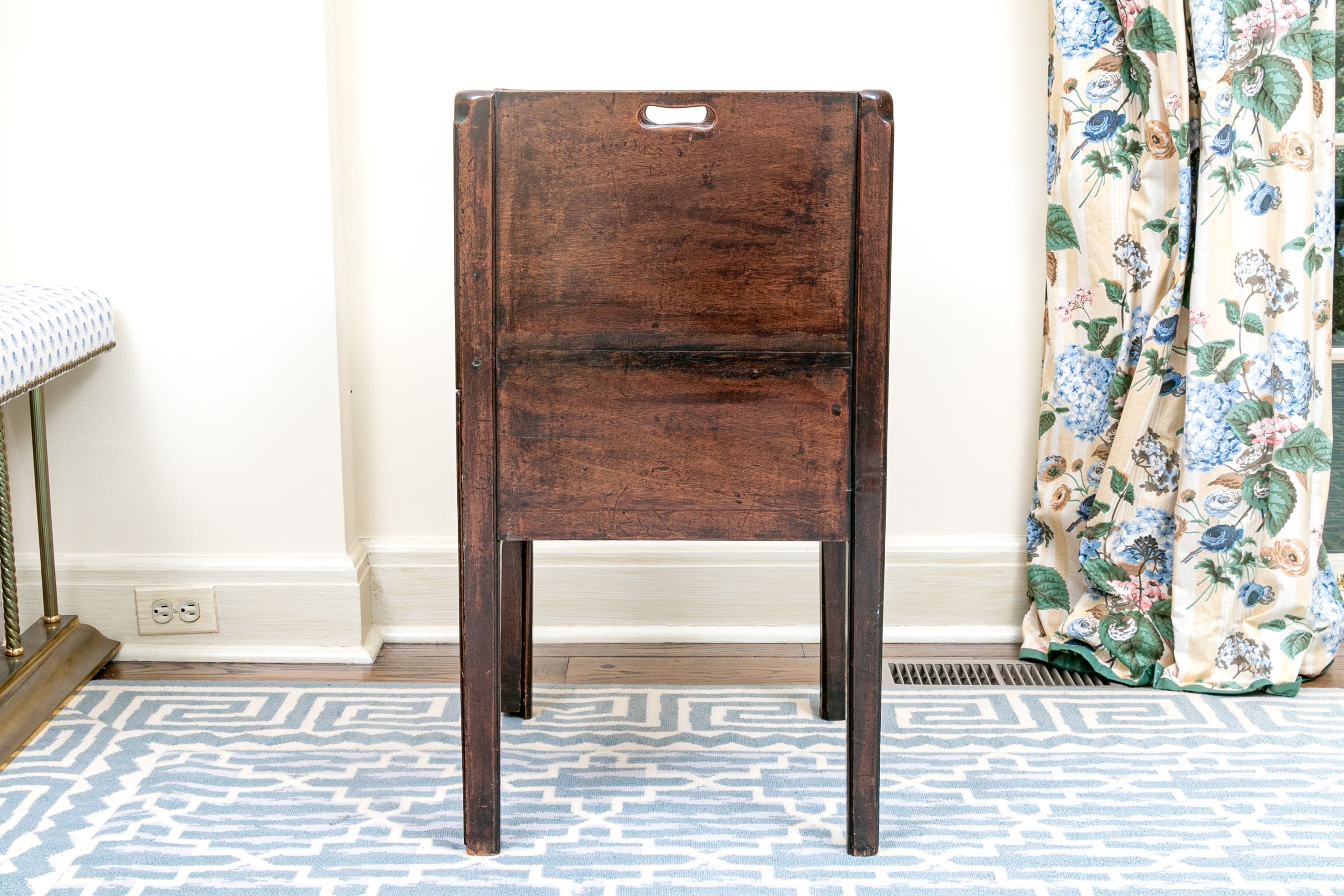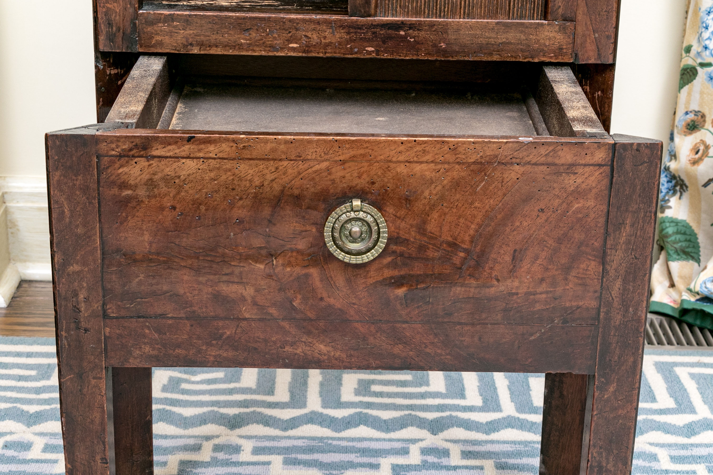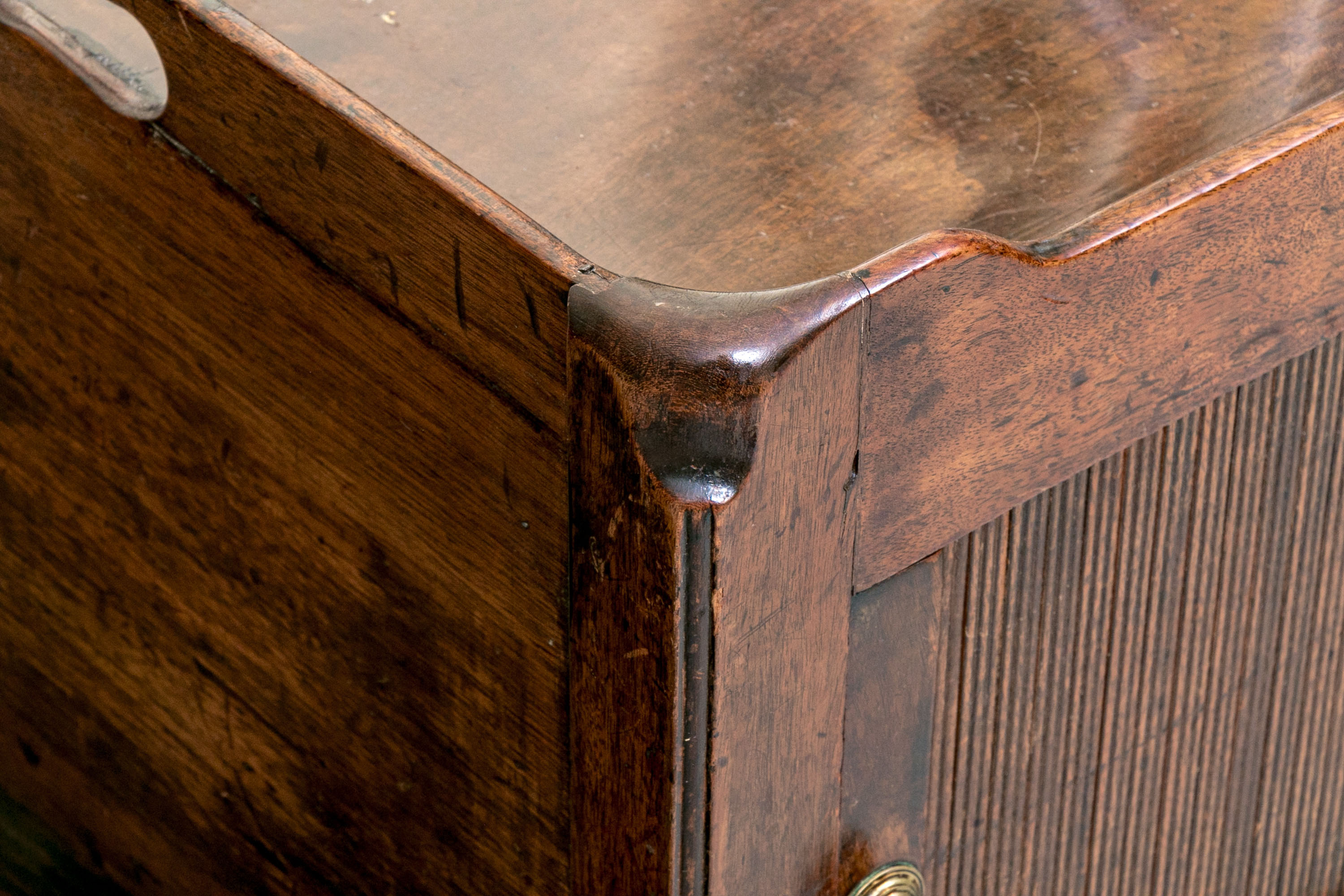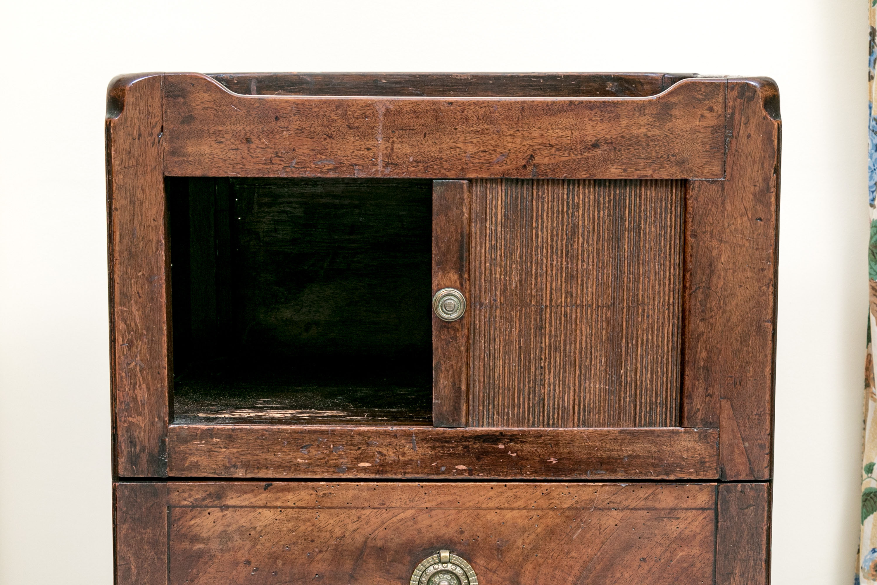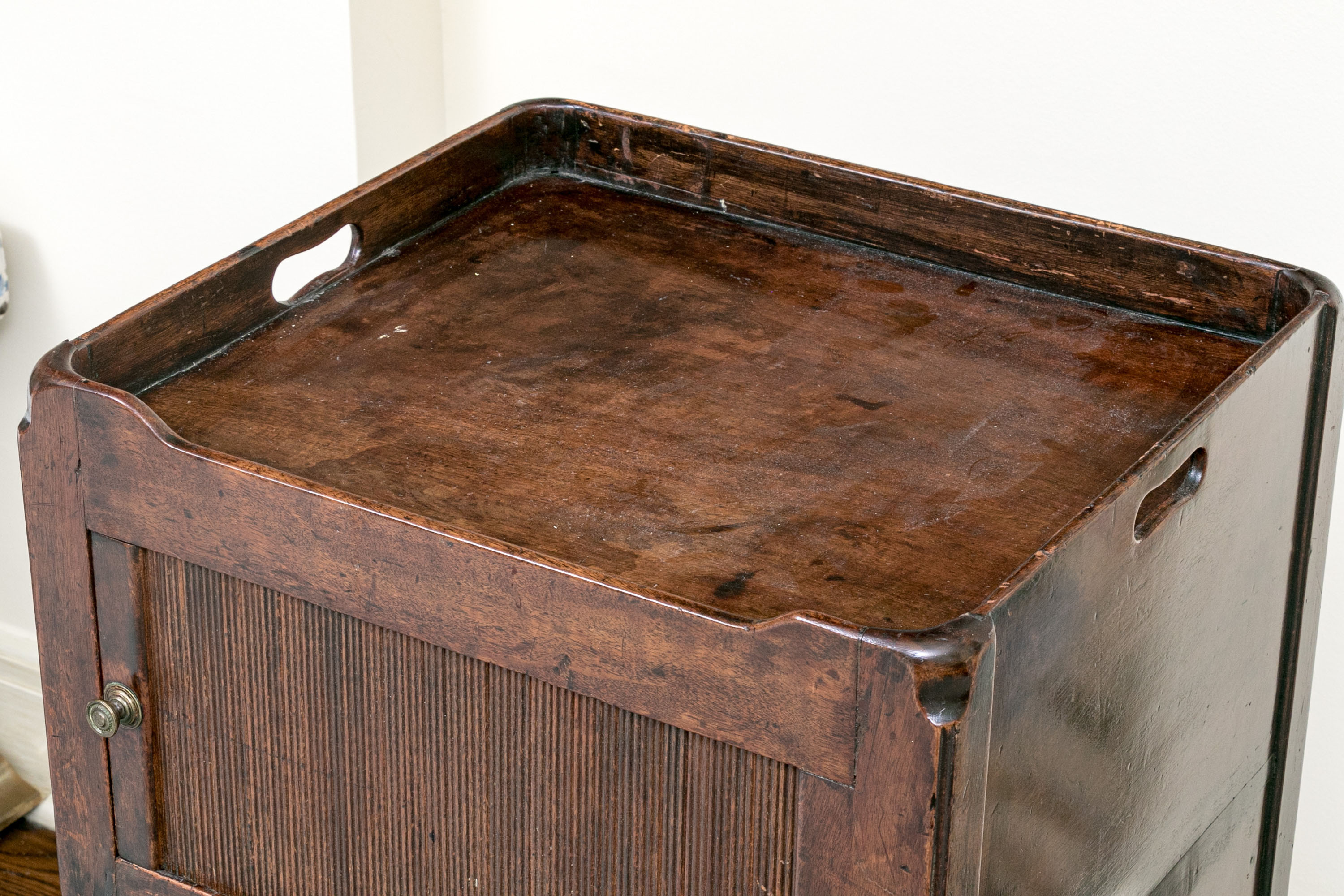 The bedside cabinet or wash stand stands upon four squared legs with a lower drawer with circular brass pull below a cabinet space with tambour door having a brass knob. Above the table top with gallery all around with two intrinsic cut out handles.