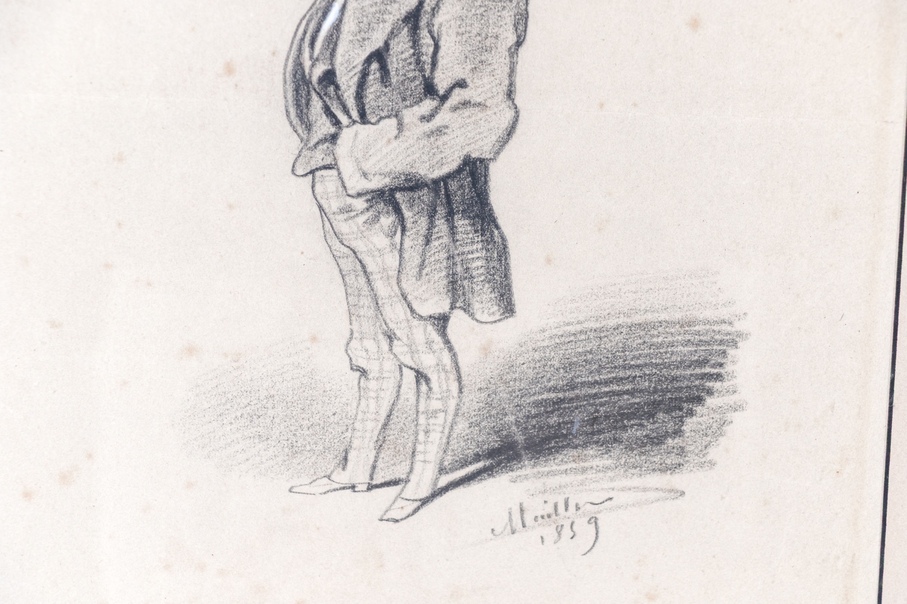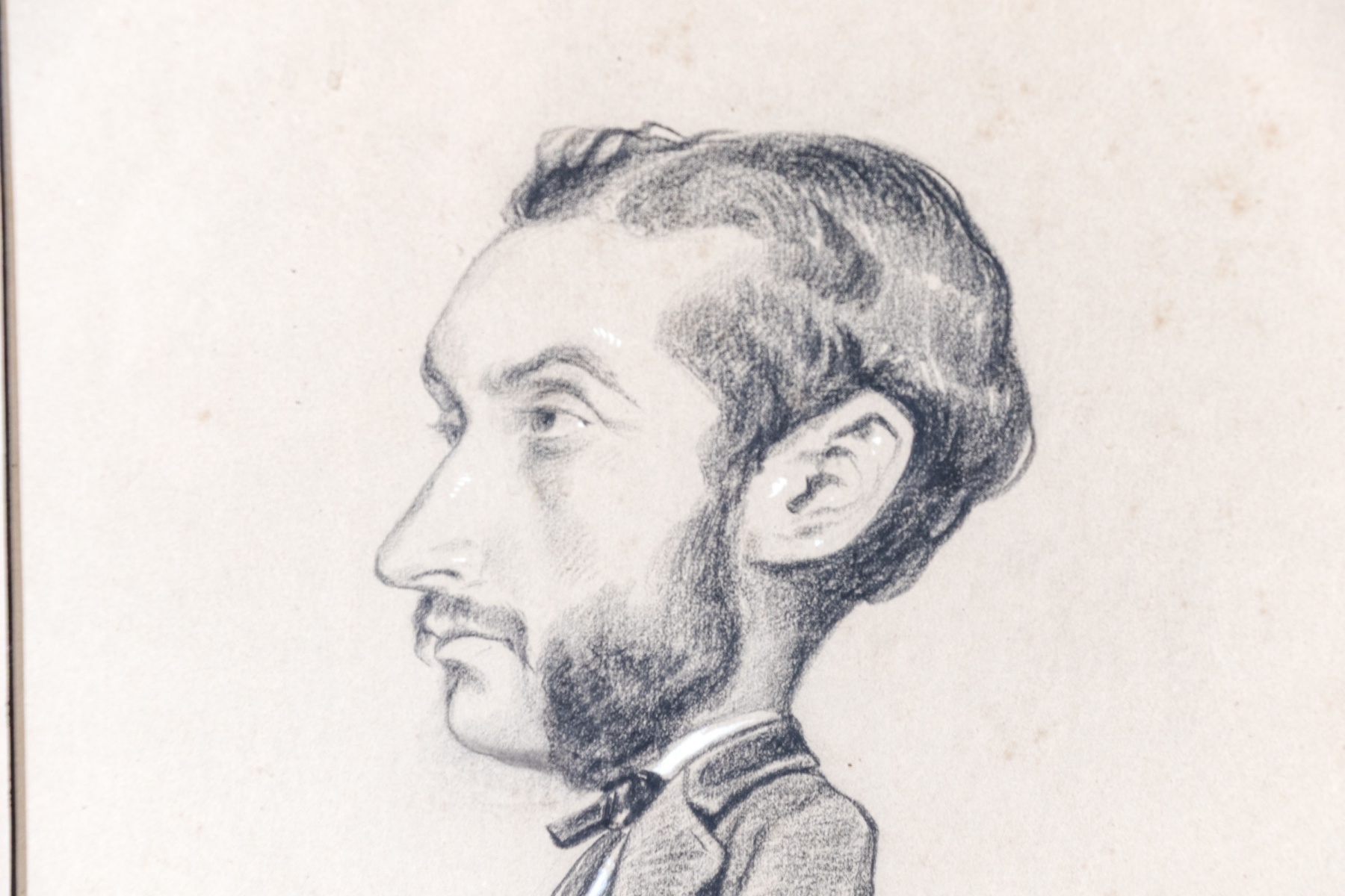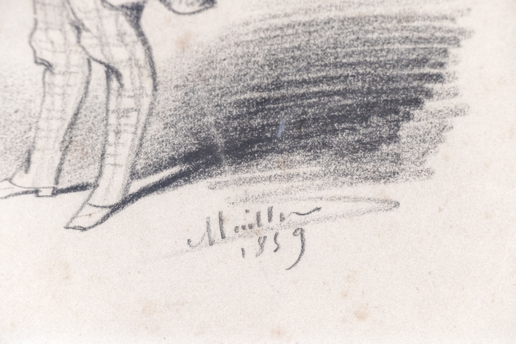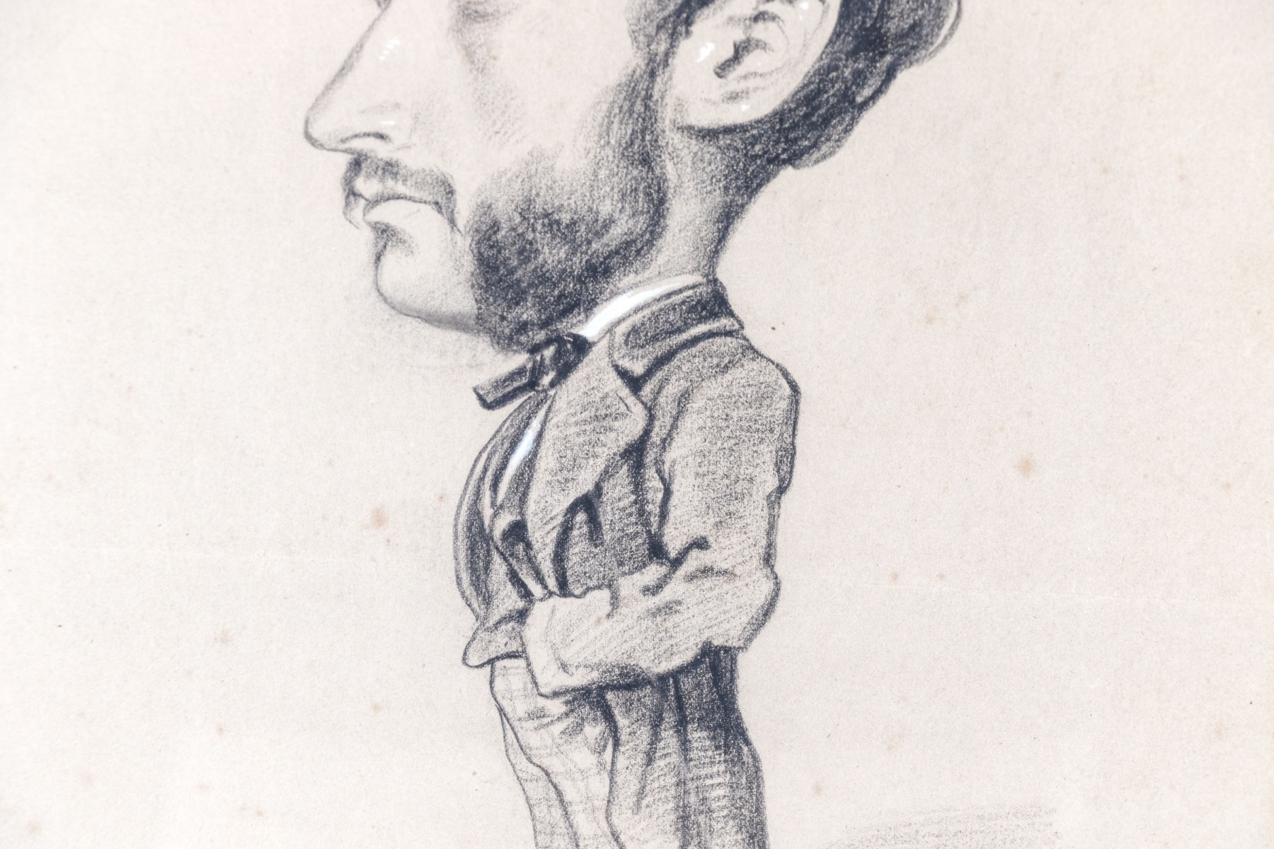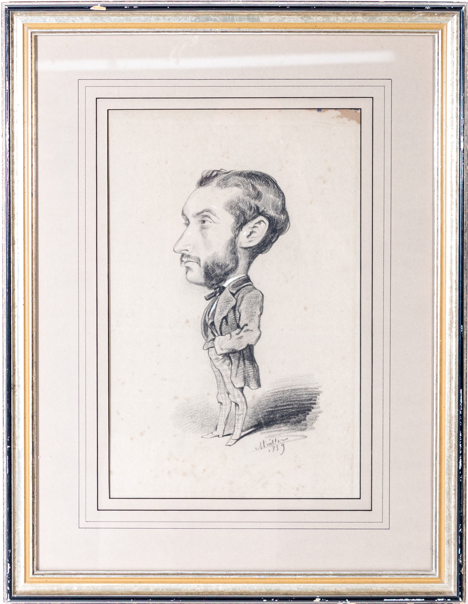 Signed indistinctly and dated 1859 lower right. The drawing in charcoal and gouache on paper, depicts a well dressed gentle man in profile. Custom matted, framed and glazed.