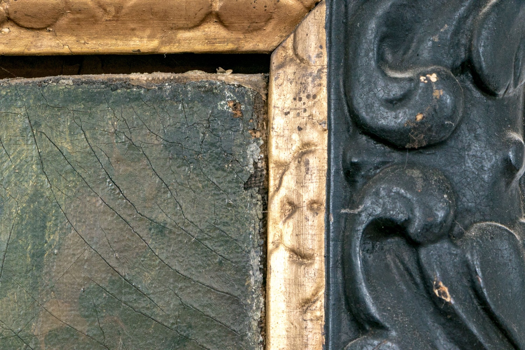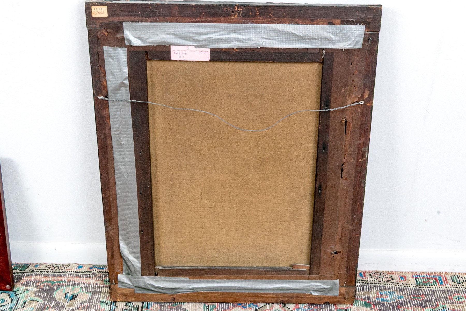 Fine craquelure throughout commensurate with age. The canvas is slightly off in the frame leaving a small gap along the top; secured with duct tape on the verso. Gentle finish wear to the frame. Overall presents very nicely.