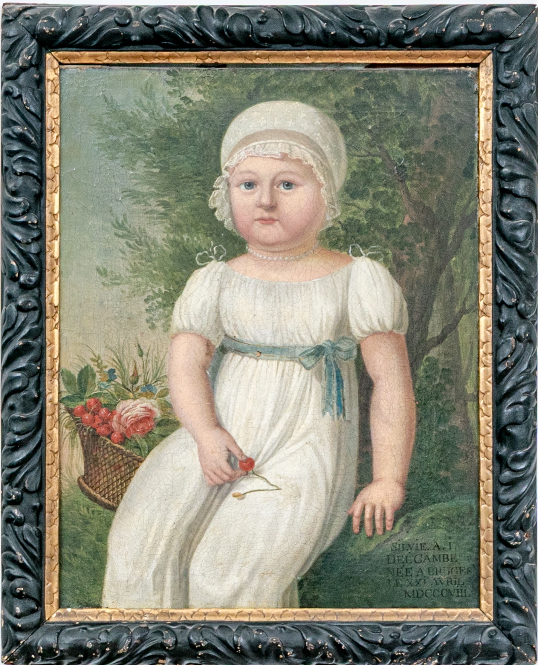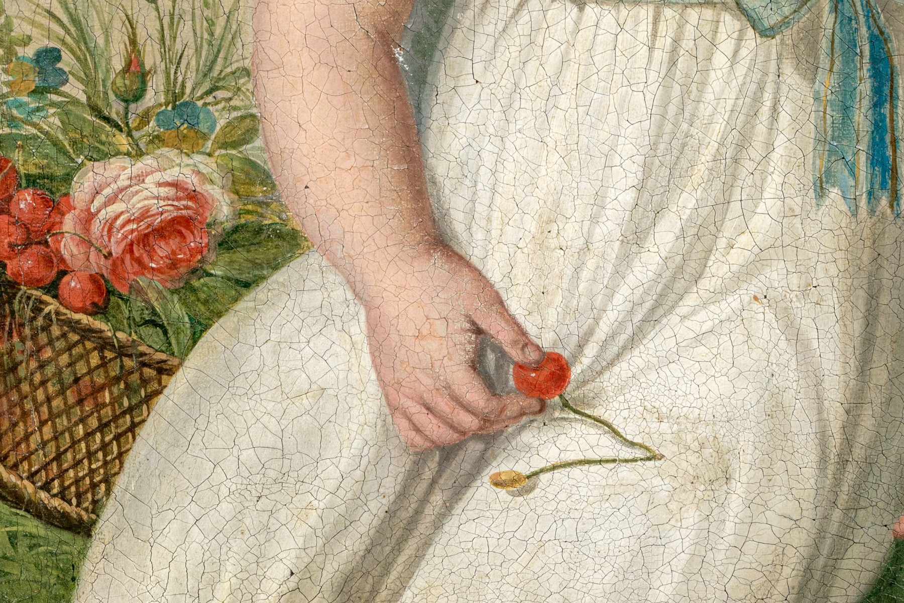 A charming 19th century oil painting on canvas depicting a portrait of a child wearing a bonnet, pearl necklace, and white Regency style dress with a blue ribbon. The girl sits on a grassy mound next to a basket of flowers and fruit, holding a single cherry on her lap.