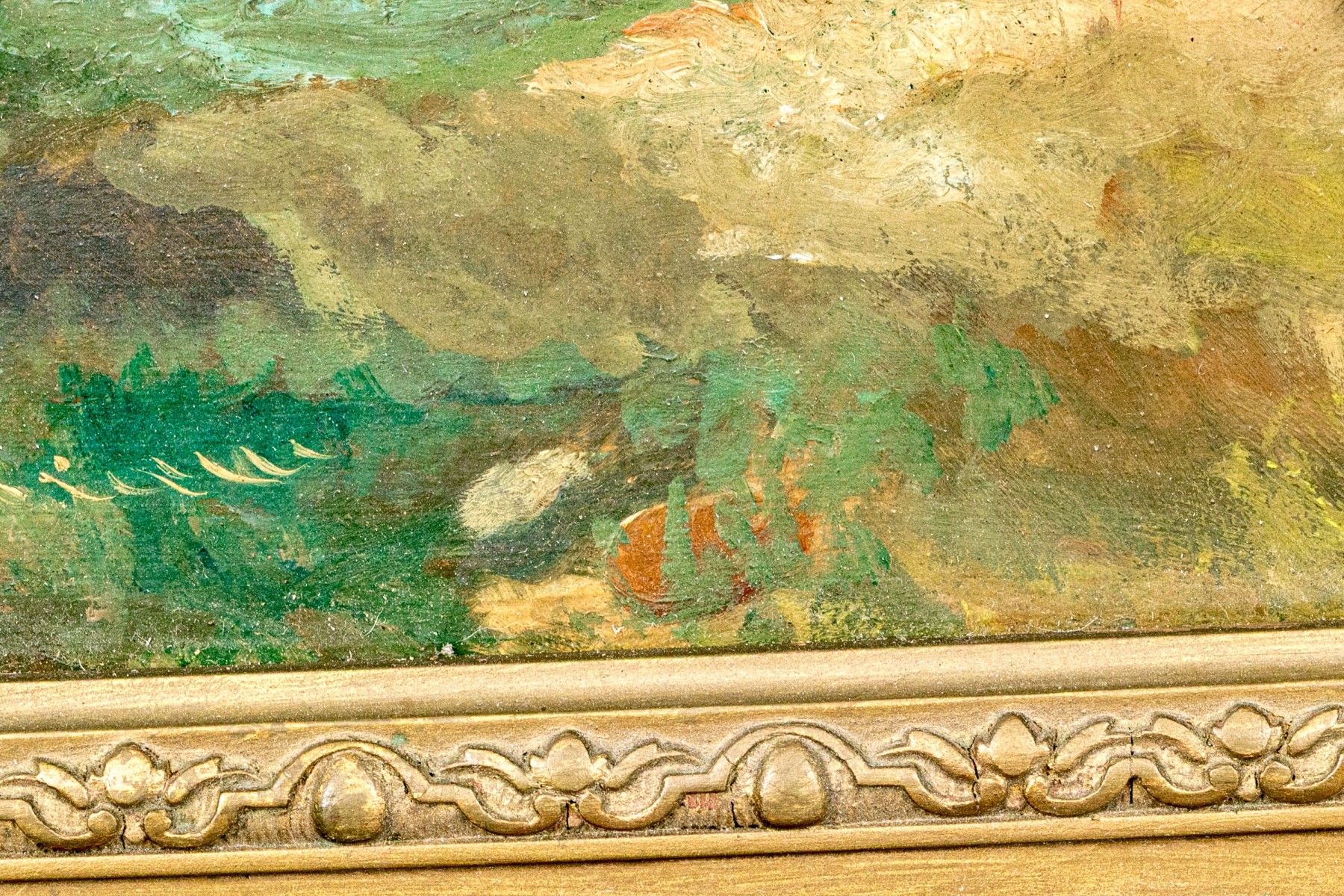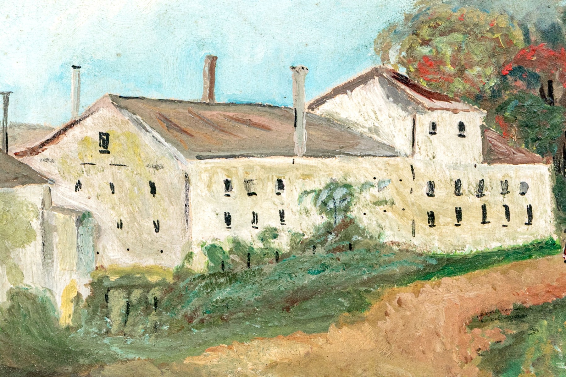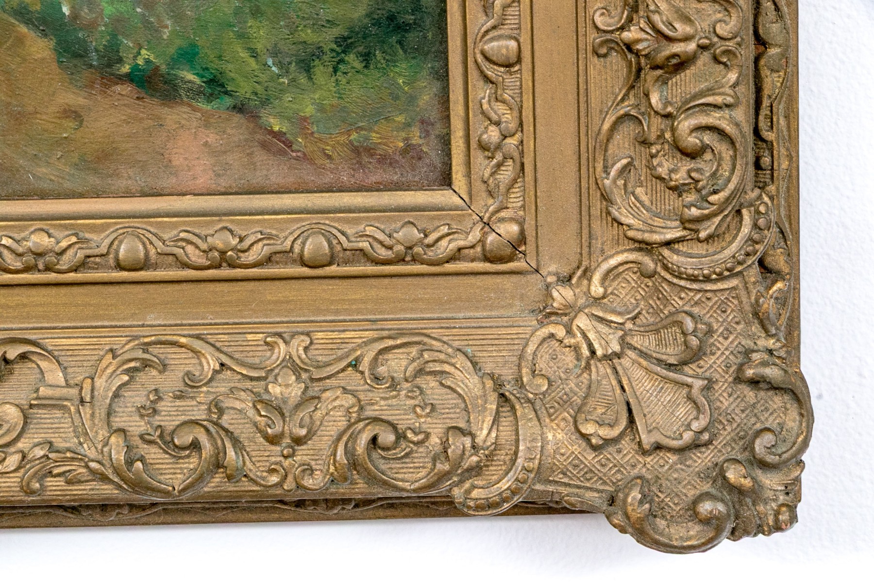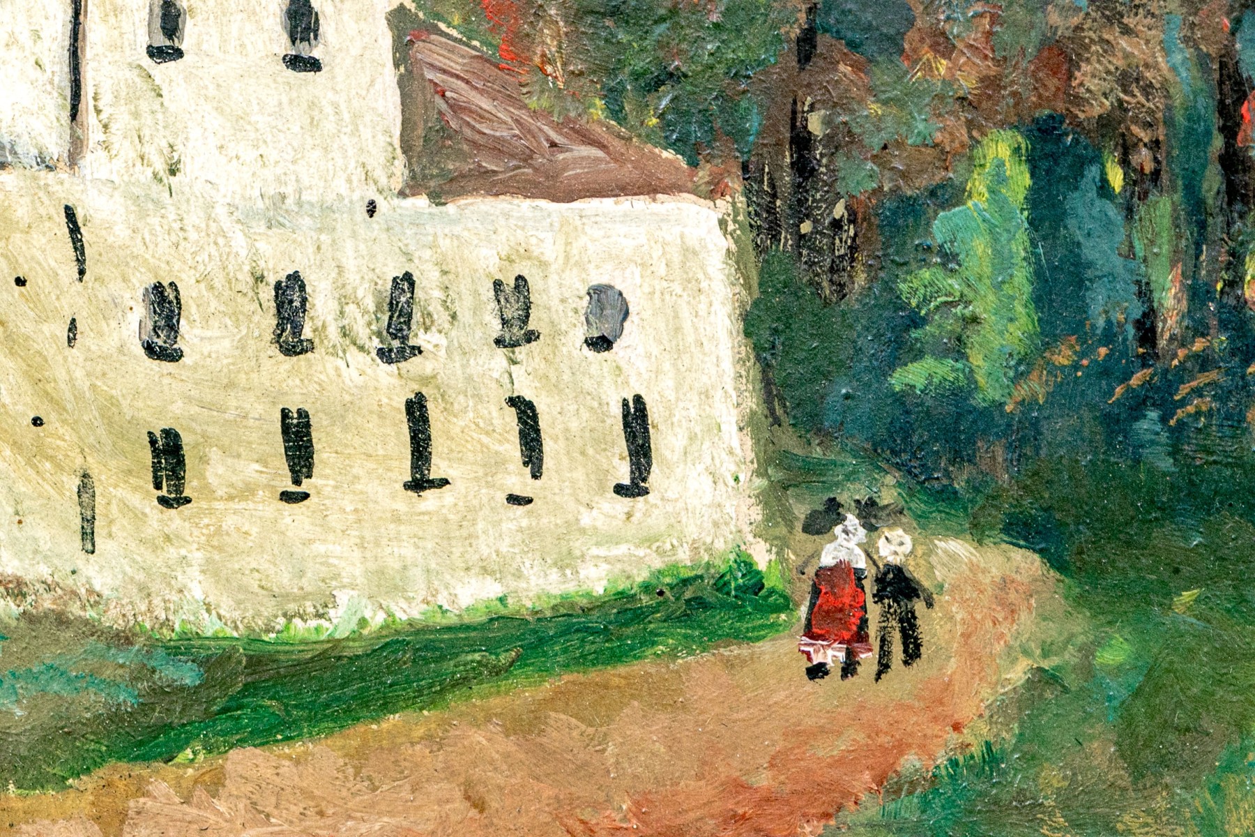 A charming antique oil painting on board depicting a couple walking down a dirt path outside of a town with brown-roofed white buildings to the left and autumnal foliate to the right, all beneath a clouded, vibrant blue sky.. Appears to be unsigned.