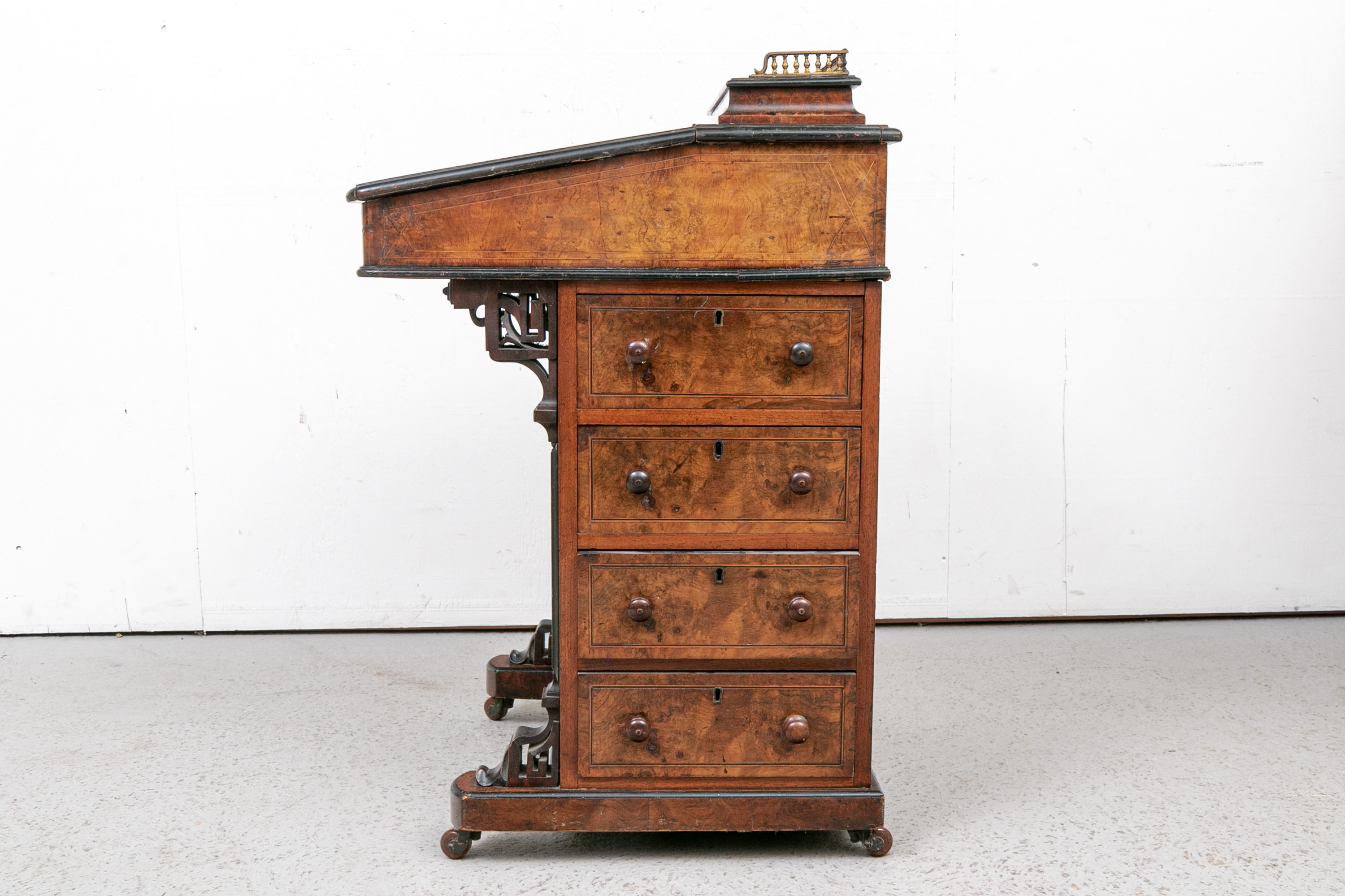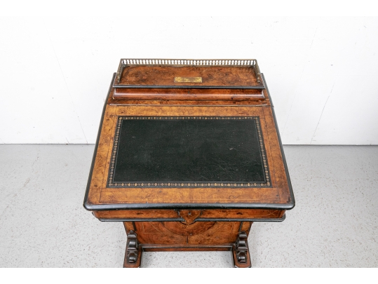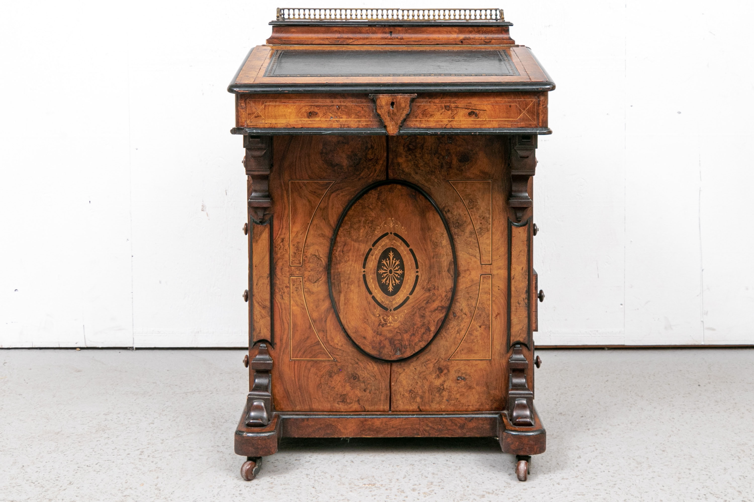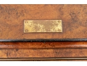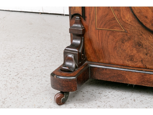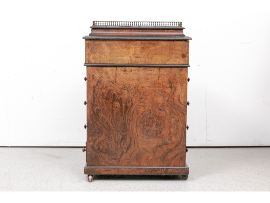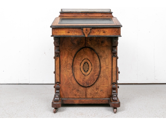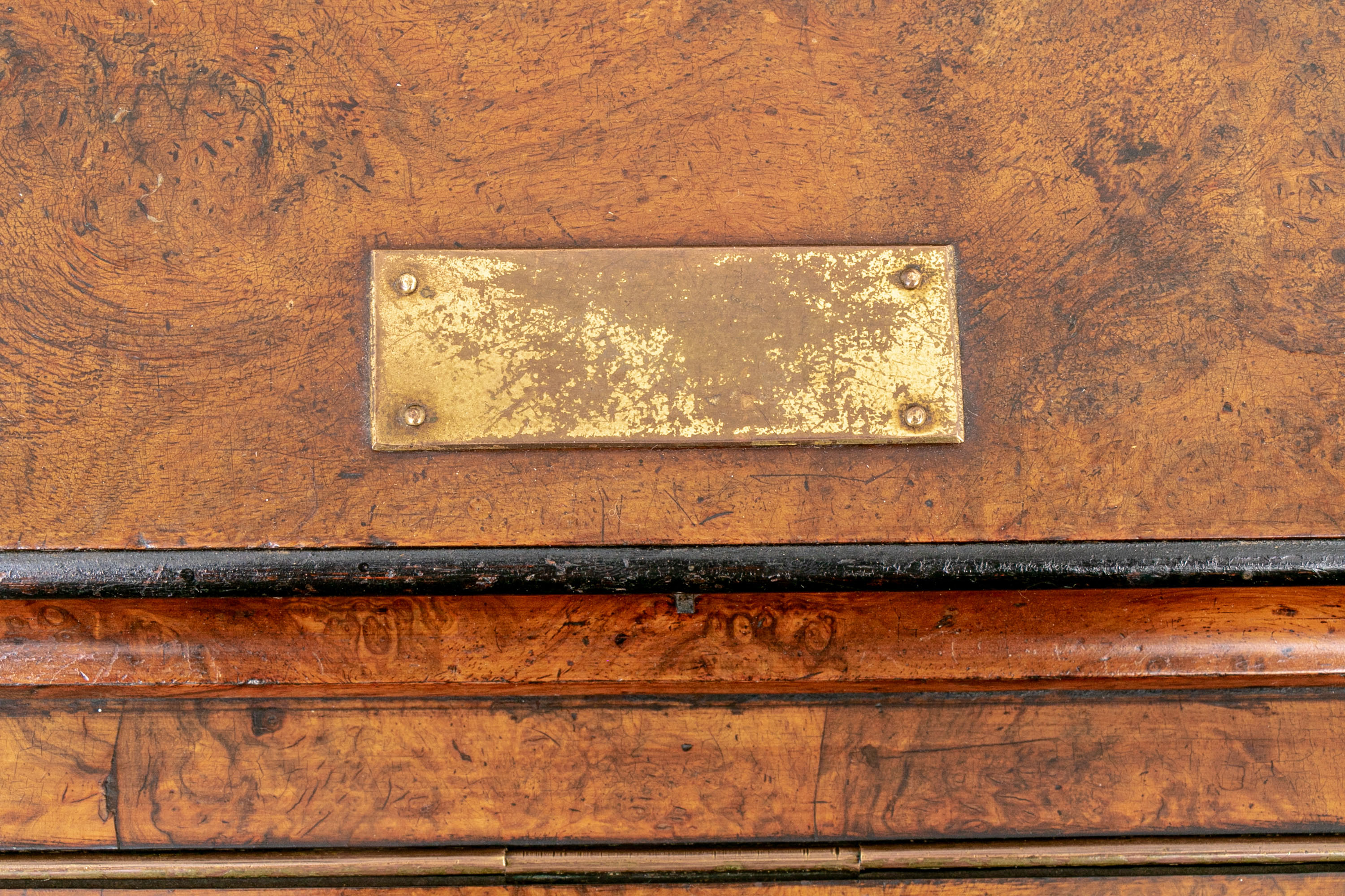 A fine Captain’s Desk in particularly well chosen and colorful Burl wood with string inlaid details and ebonized moldings. The very top with a 3/4 brass gallery and worn brass plaque over a black tooled leather slant front that lifts up. The interior in satinwood with two short drawers. The apron with a wood escutcheon (lacking a key). Both sides with four small drawers (lacking keys), The lower front case with a carved decorative oval panel, the whole raised on extended front legs with a darker scrolled carved detail. All legs on wooden castors.