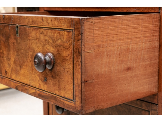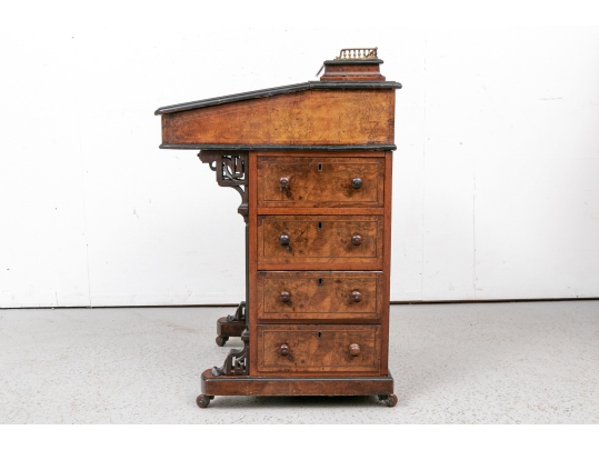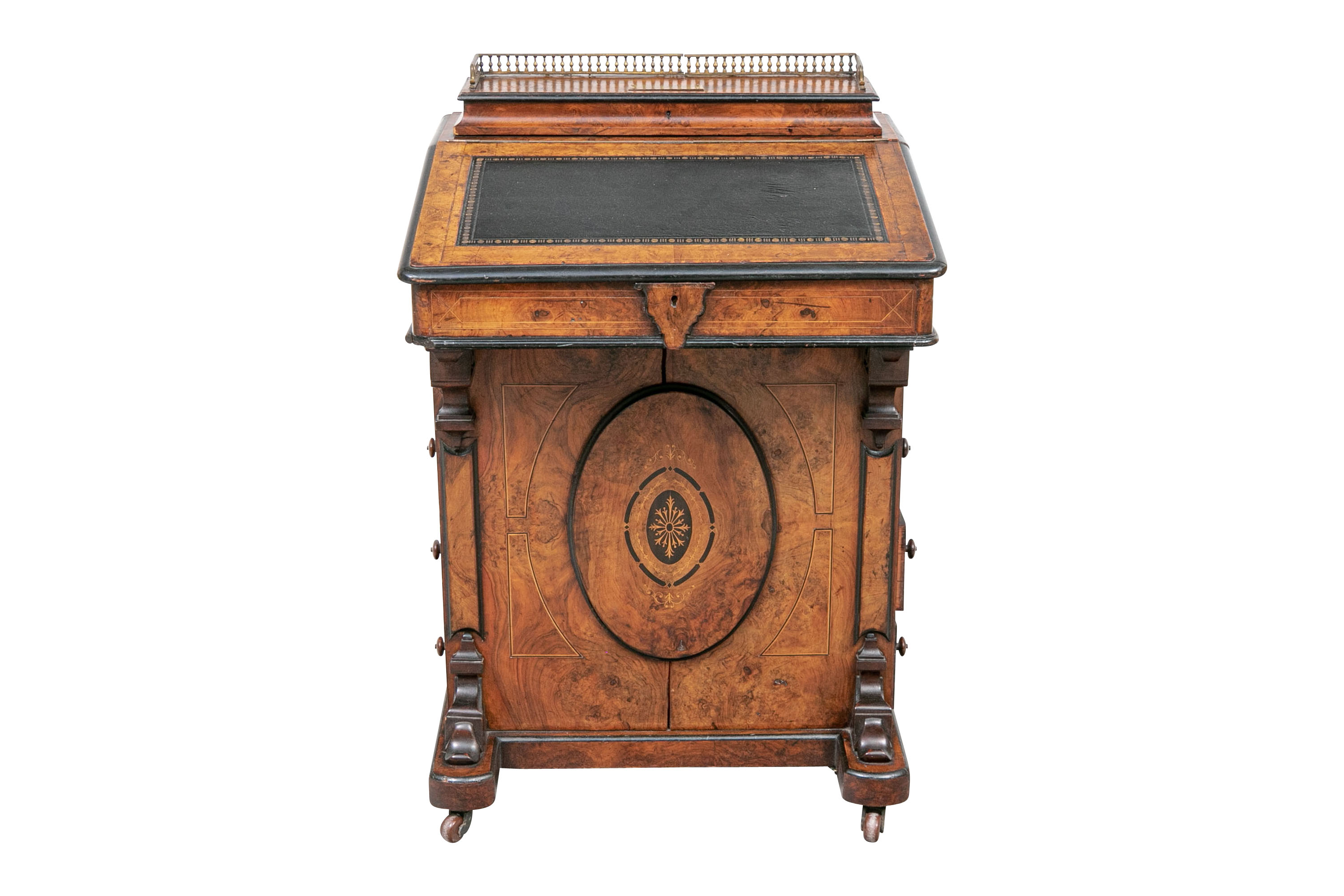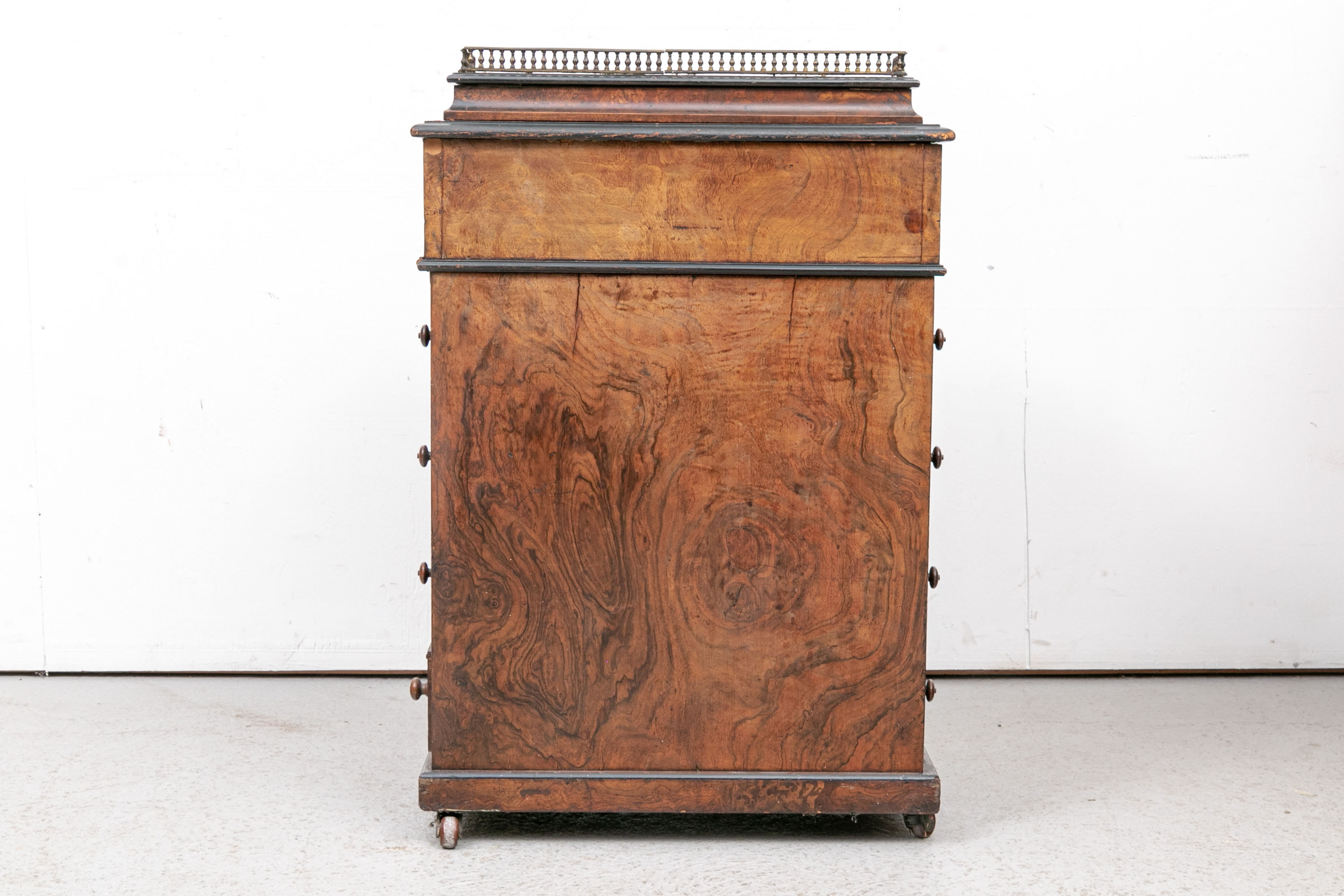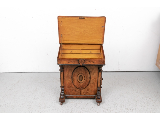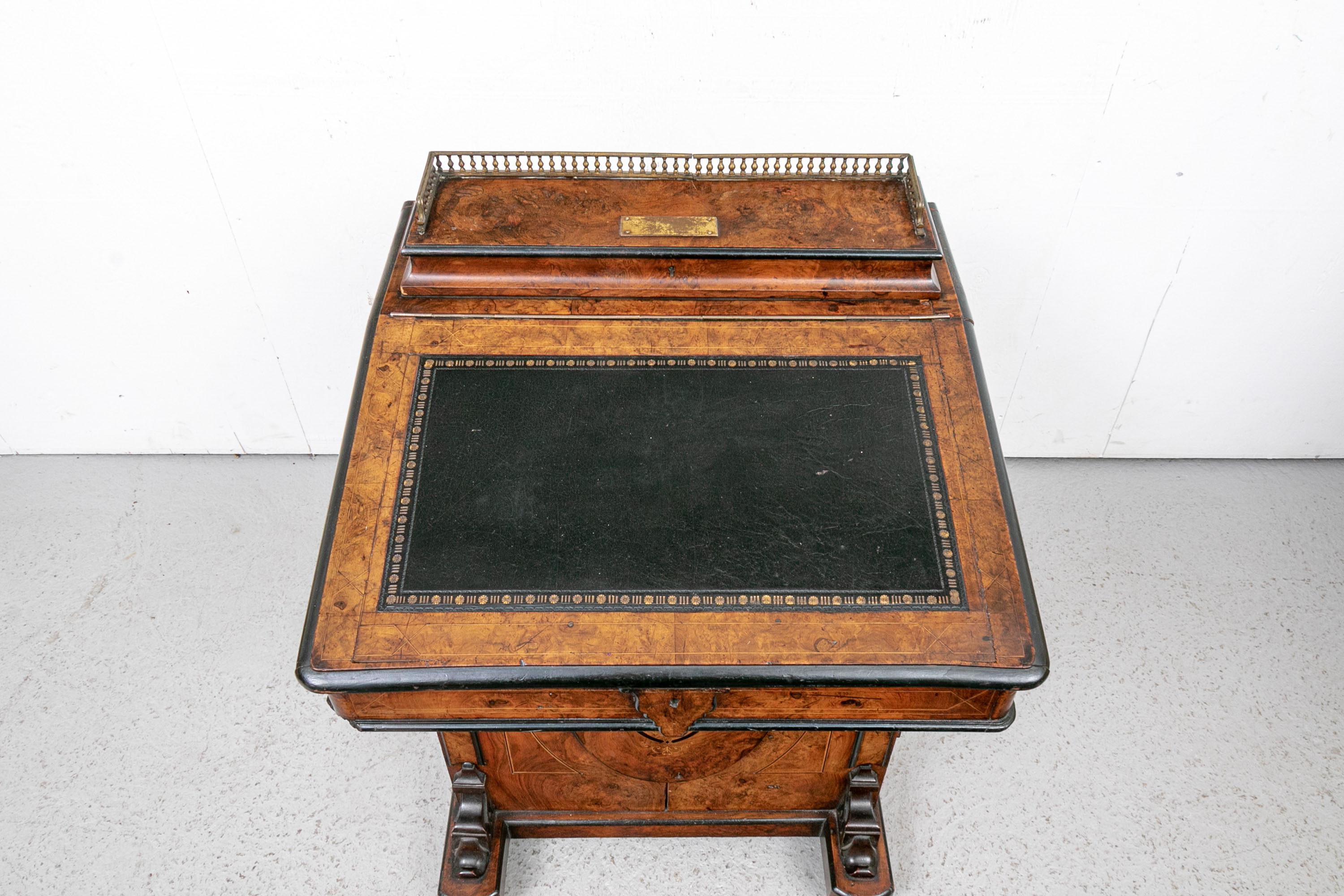 A fine Captain’s Desk in particularly well chosen and colorful Burl wood with string inlaid details and ebonized moldings. The very top with a 3/4 brass gallery and worn brass plaque over a black tooled leather slant front that lifts up. The interior in satinwood with two short drawers. The apron with a wood escutcheon (lacking a key). Both sides with four small drawers (lacking keys), The lower front case with a carved decorative oval panel, the whole raised on extended front legs with a darker scrolled carved detail. All legs on wooden castors.