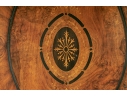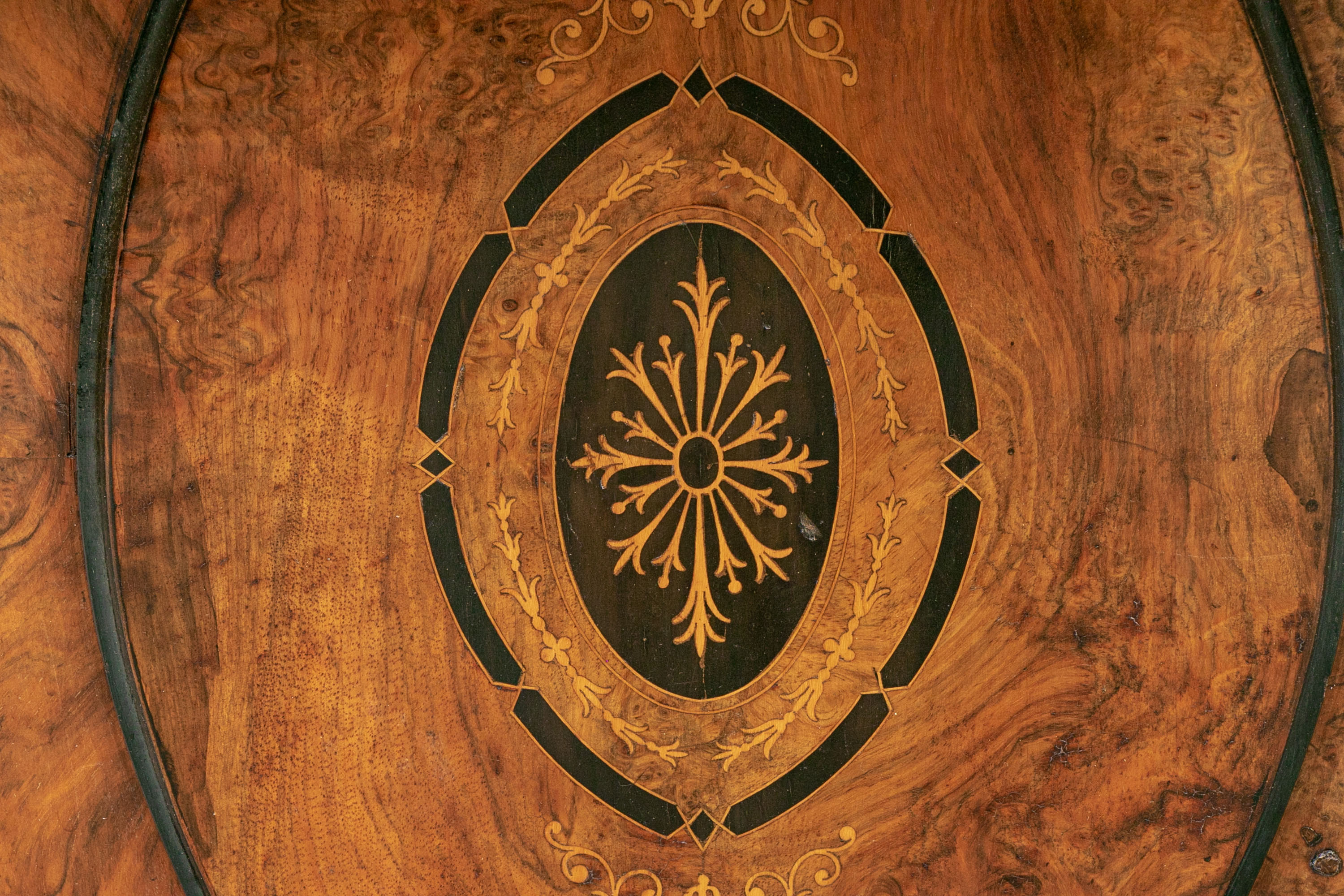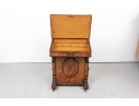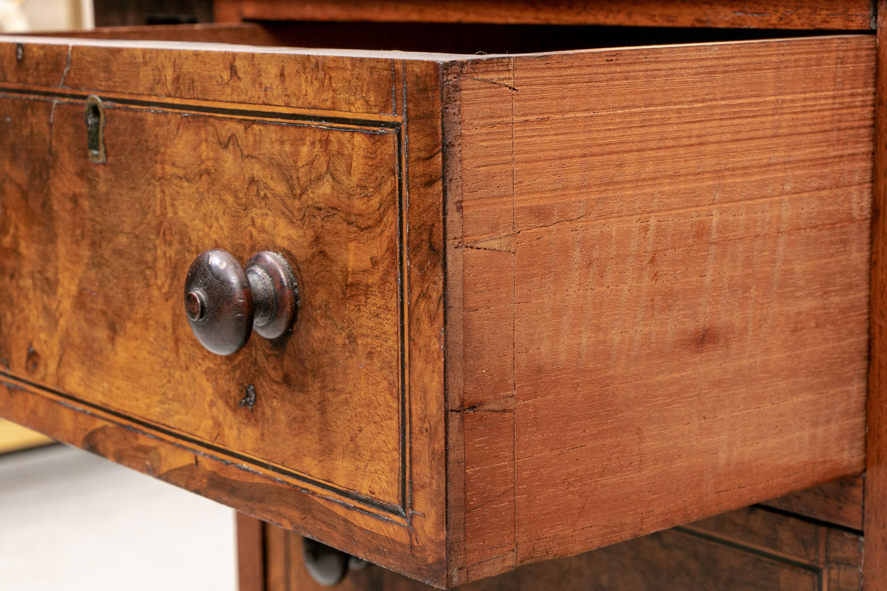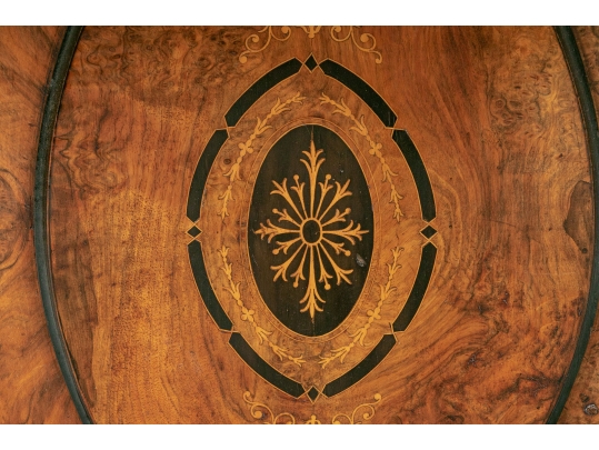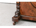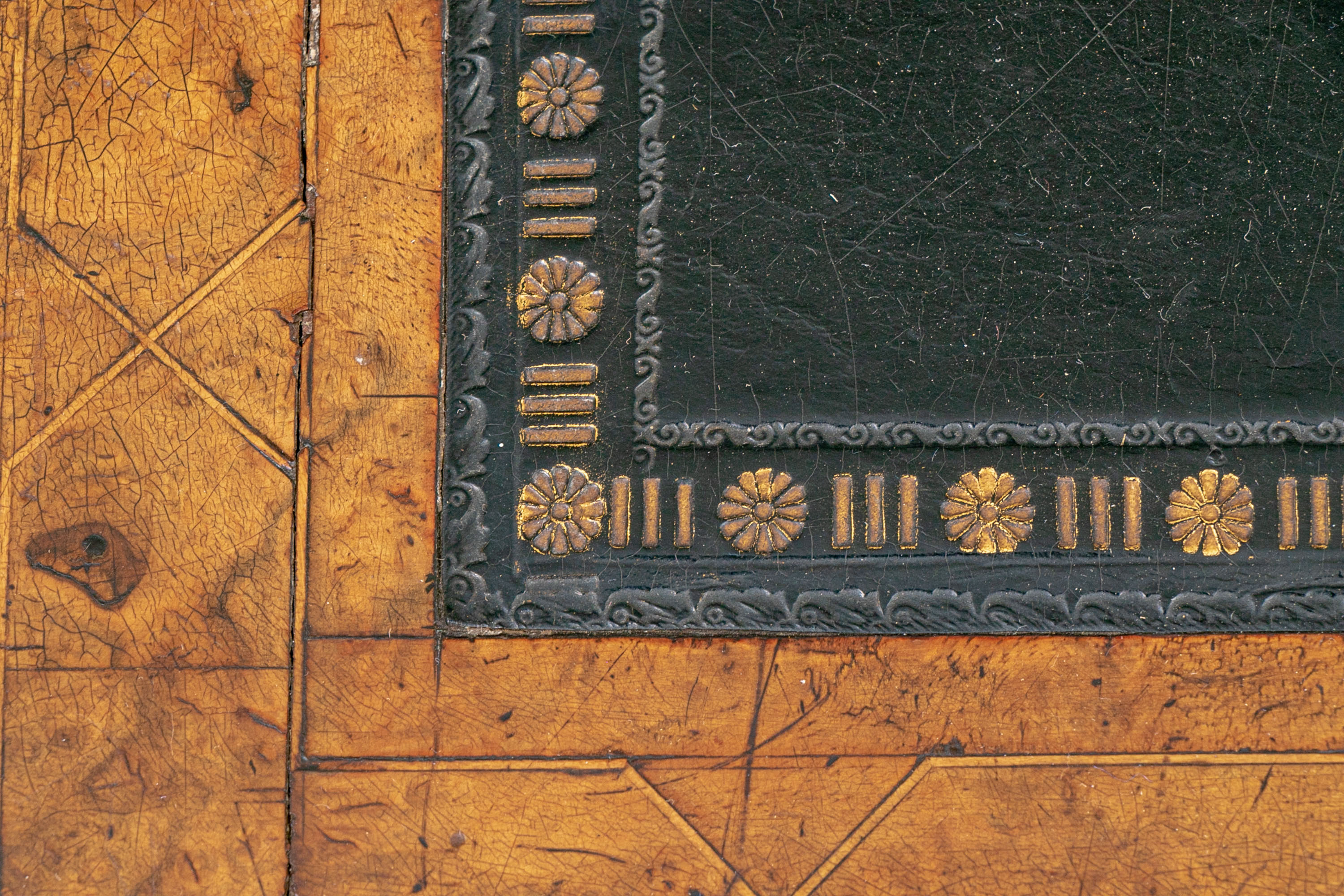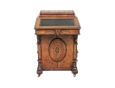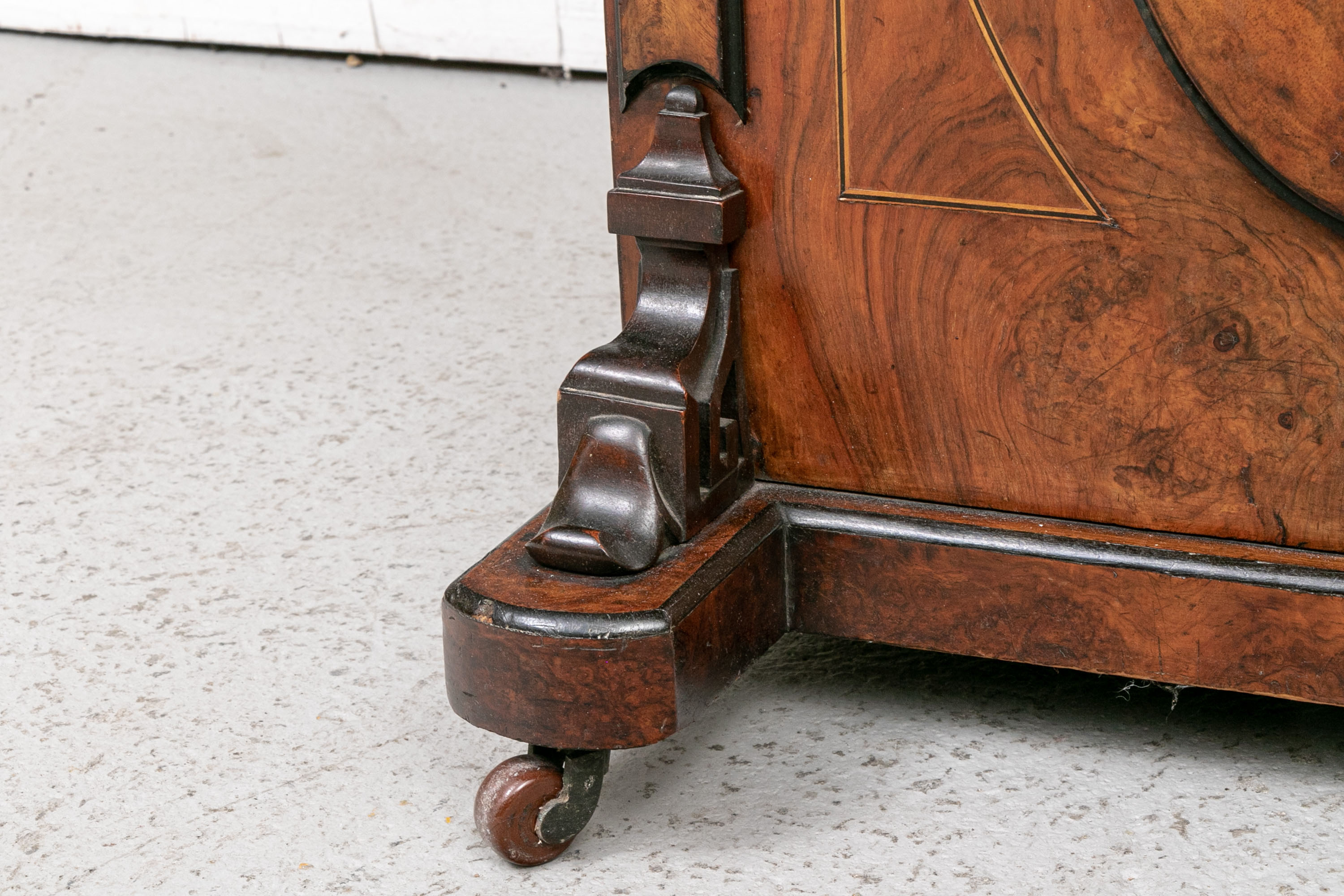 A fine Captain’s Desk in particularly well chosen and colorful Burl wood with string inlaid details and ebonized moldings. The very top with a 3/4 brass gallery and worn brass plaque over a black tooled leather slant front that lifts up. The interior in satinwood with two short drawers. The apron with a wood escutcheon (lacking a key). Both sides with four small drawers (lacking keys), The lower front case with a carved decorative oval panel, the whole raised on extended front legs with a darker scrolled carved detail. All legs on wooden castors.