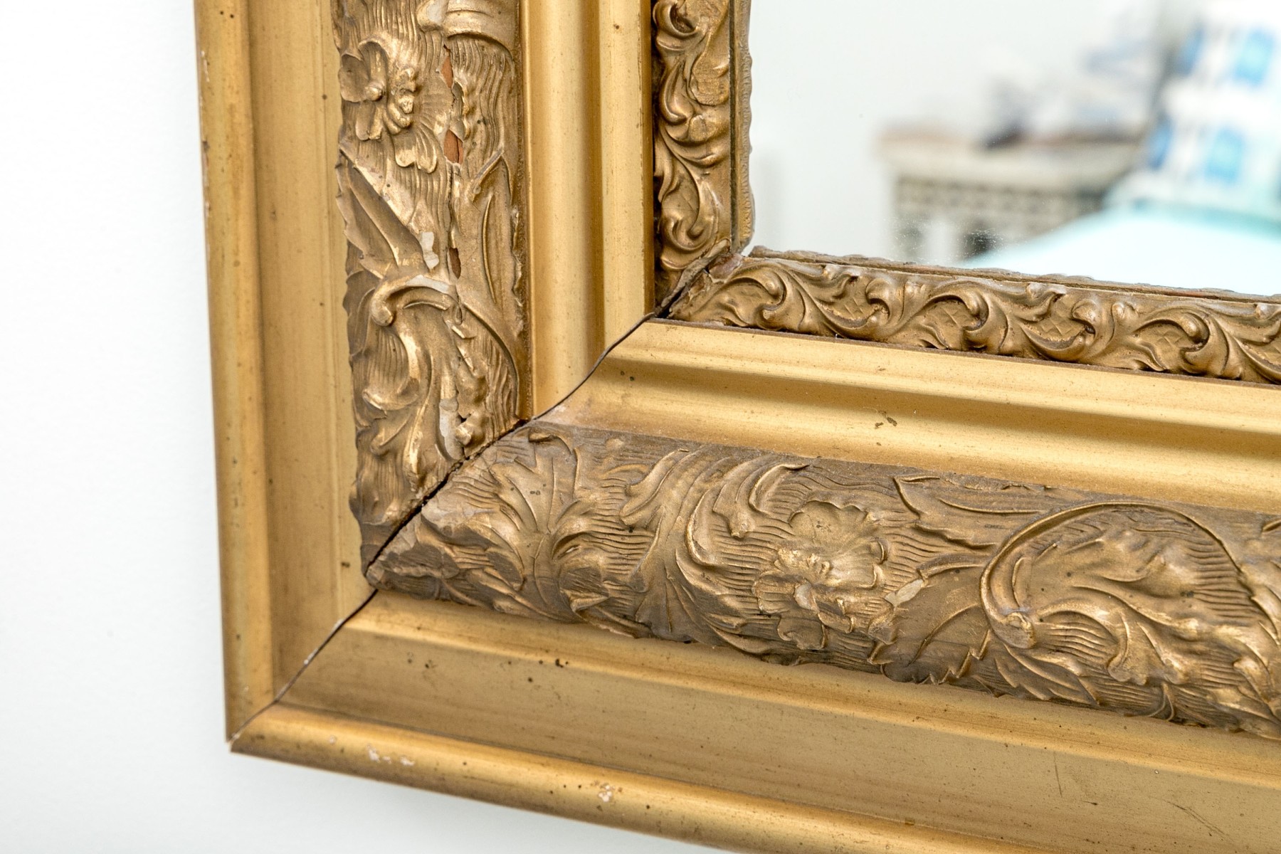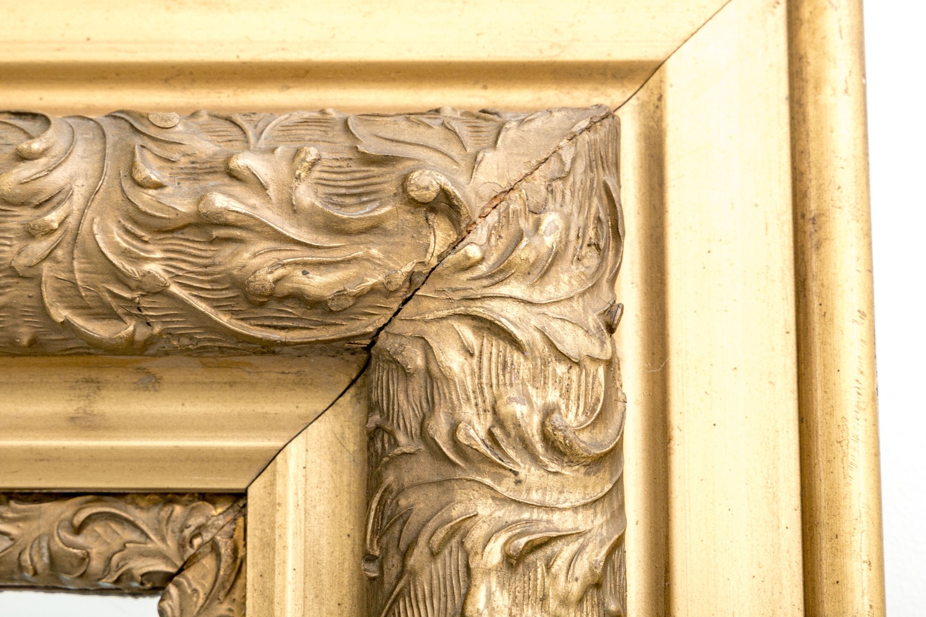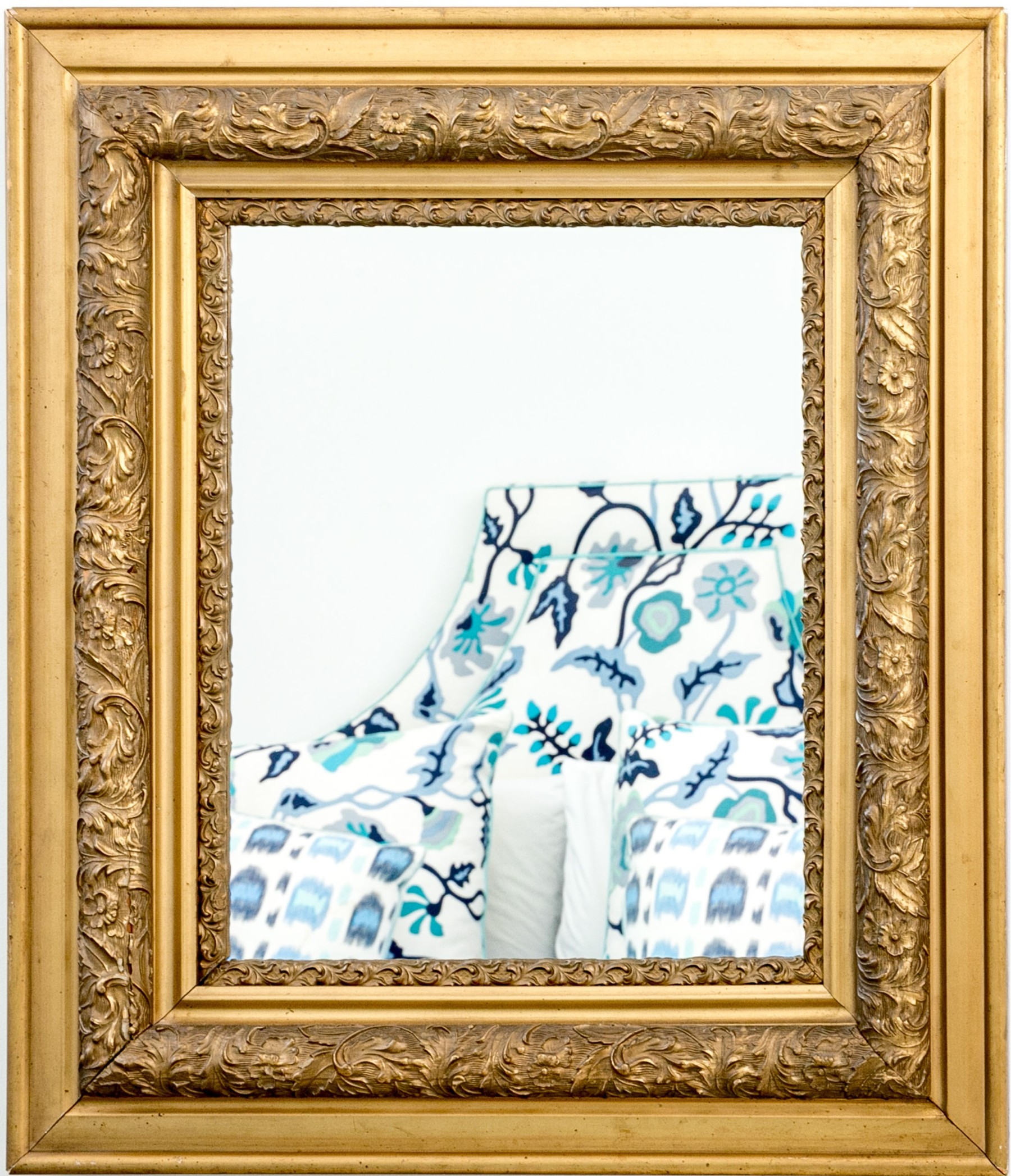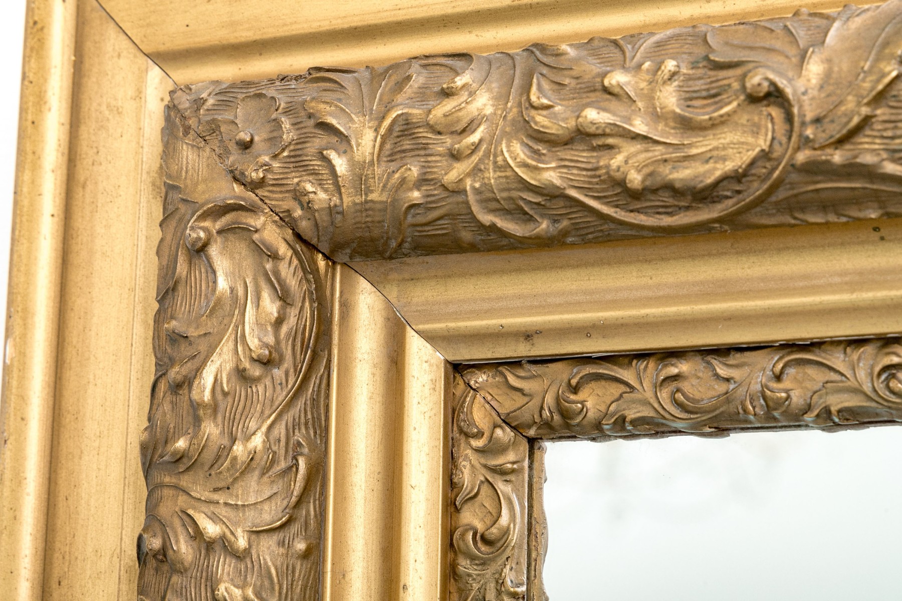 An excellent late 19th century American mirror showcasing a rectangular center in a gorgeous frame with alternating bands of smooth beveled trims and rich carved gesso relief detailed by elegant swirling acanthus leaves.