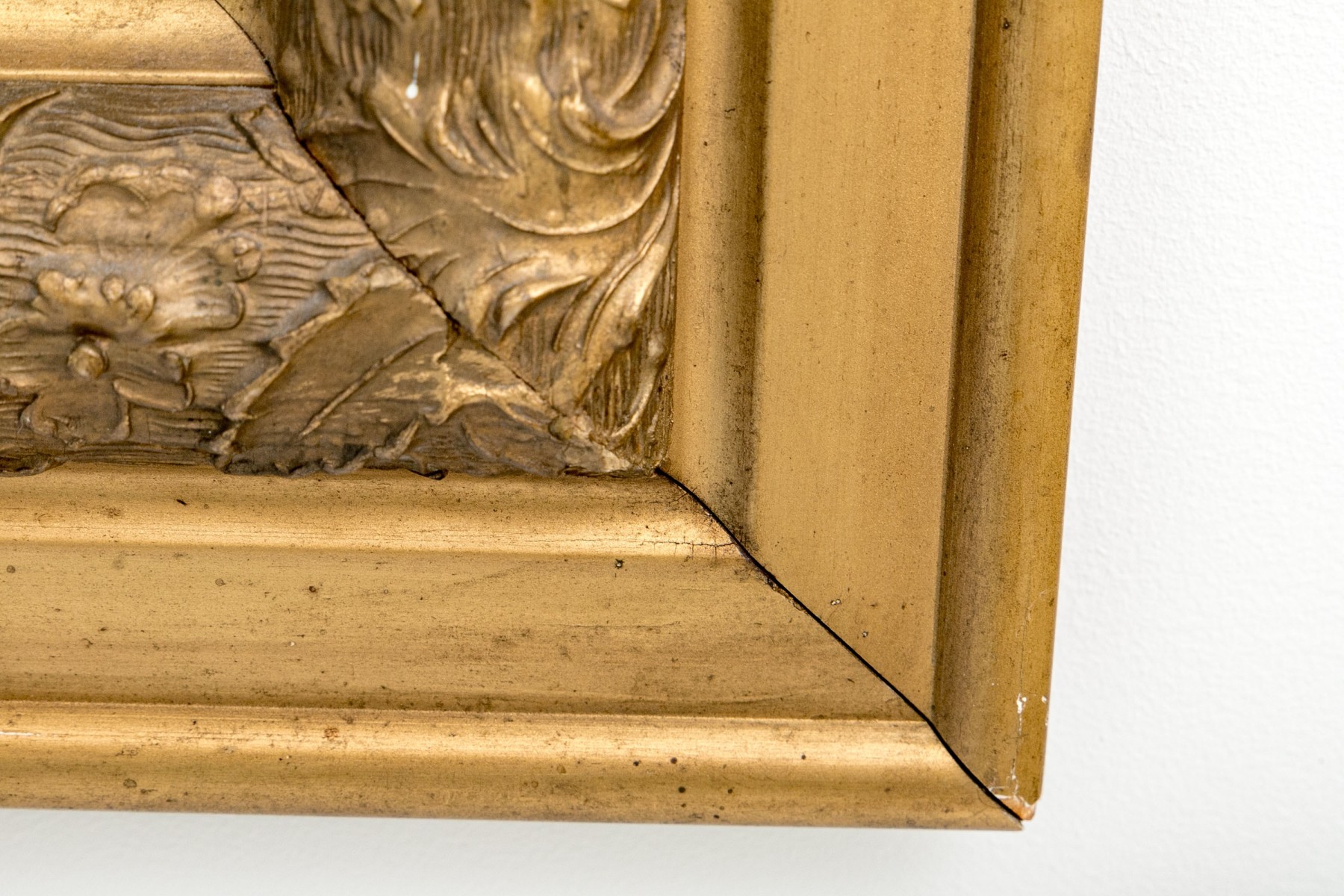 Presents well overall. Light finish wear and minor spots of loss and wear to the gesso relief.