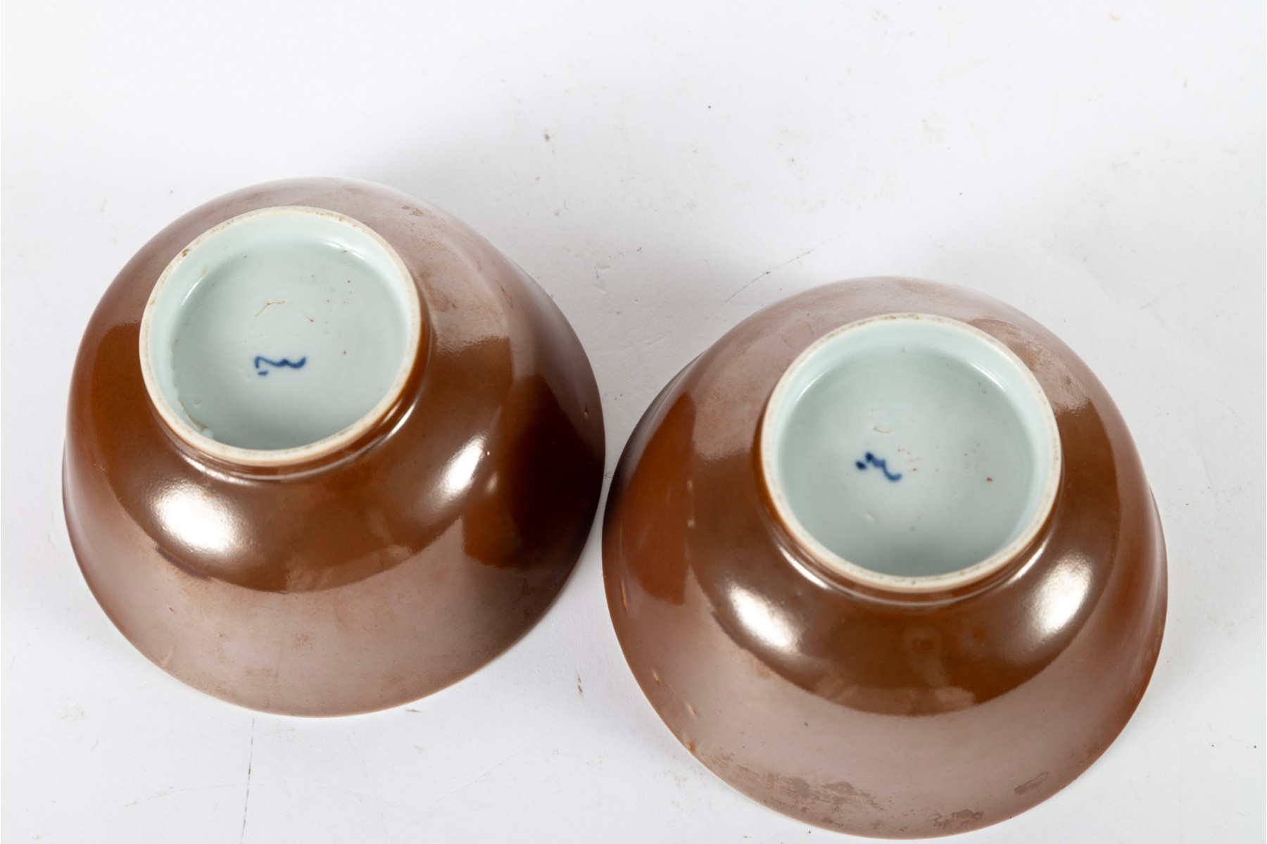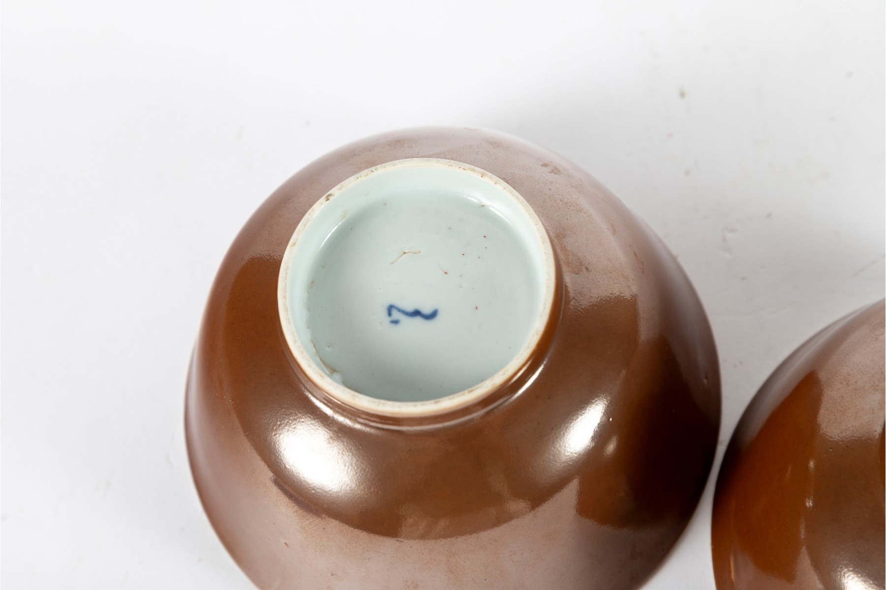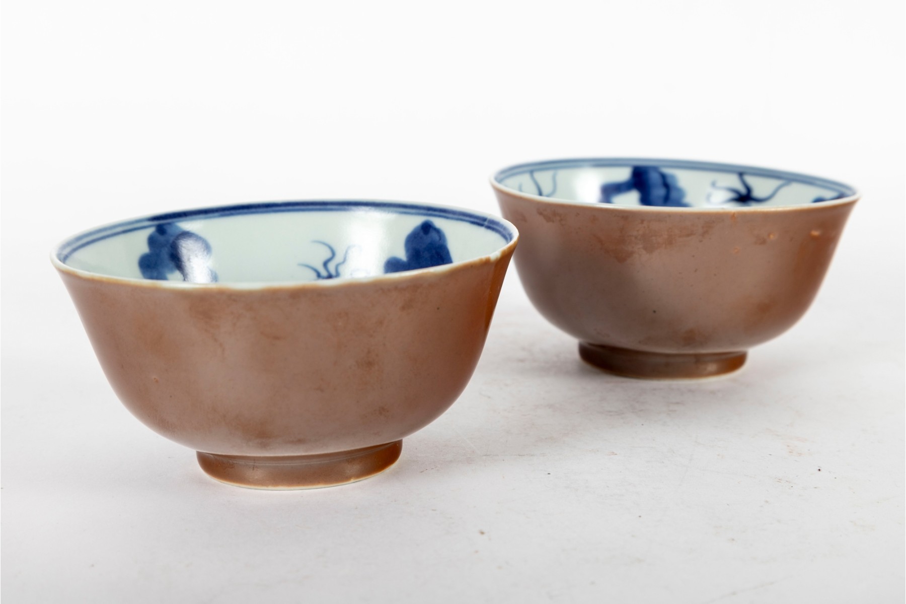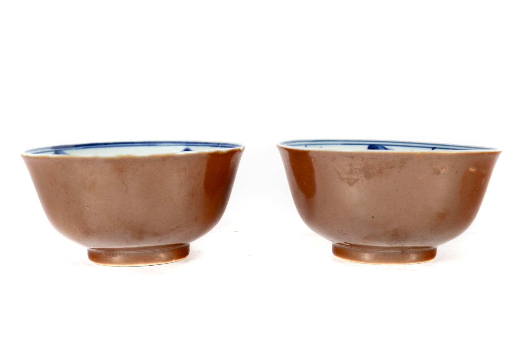 A matched pair of 19th century Chinese Batavian ware porcelain bowls, each featuring underglaze blue Jin-Yu-Man-Tang pattern on the interior, while the exteriors are covered in the characteristic rich brown Batavian glaze, creating a striking contrast.