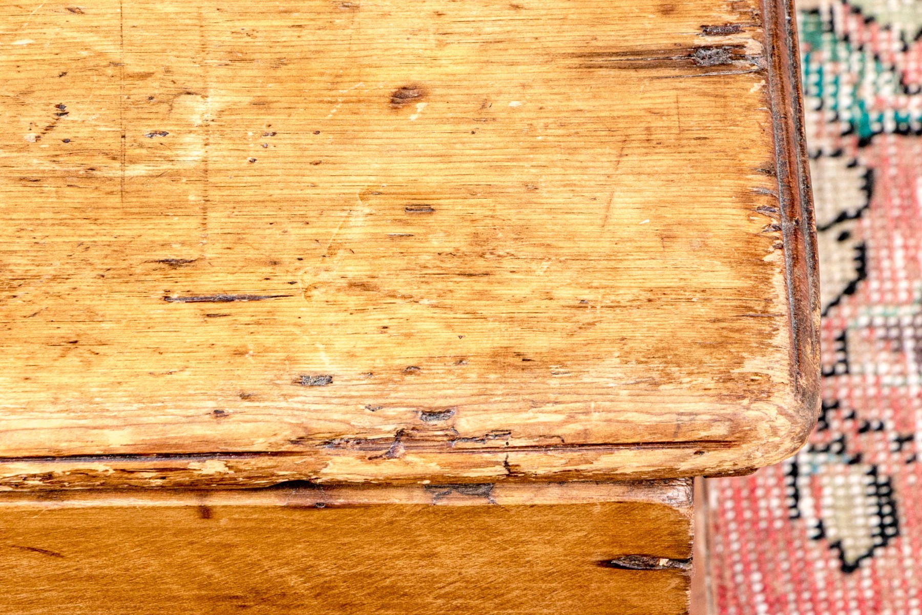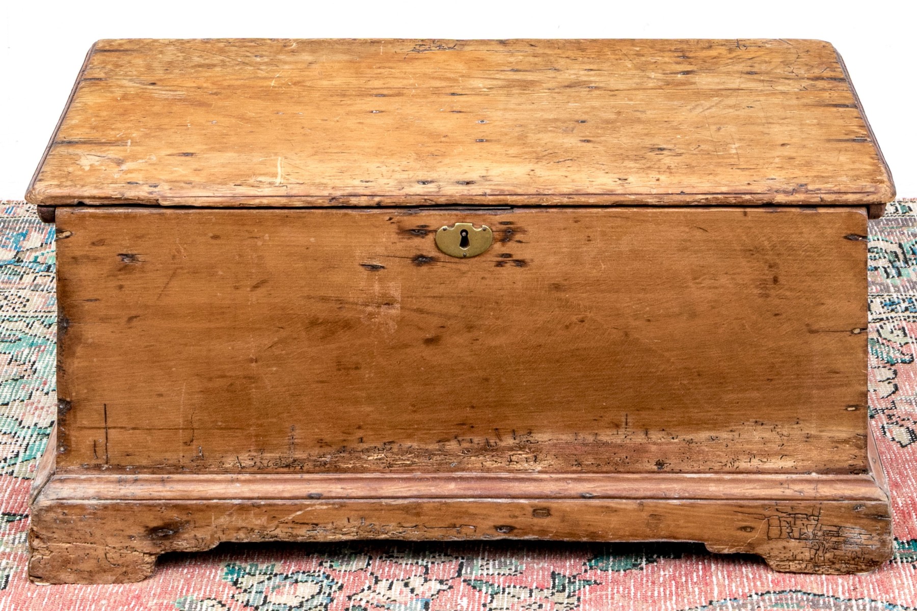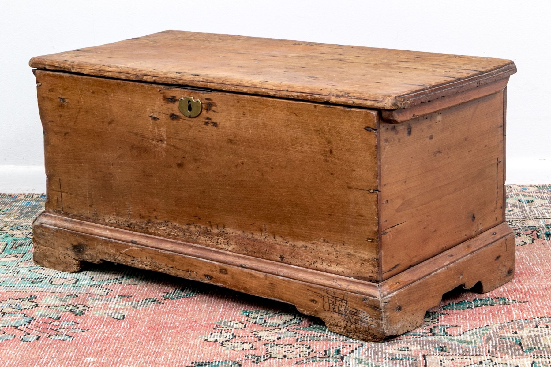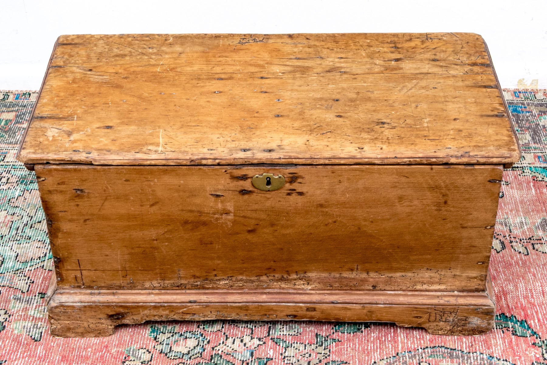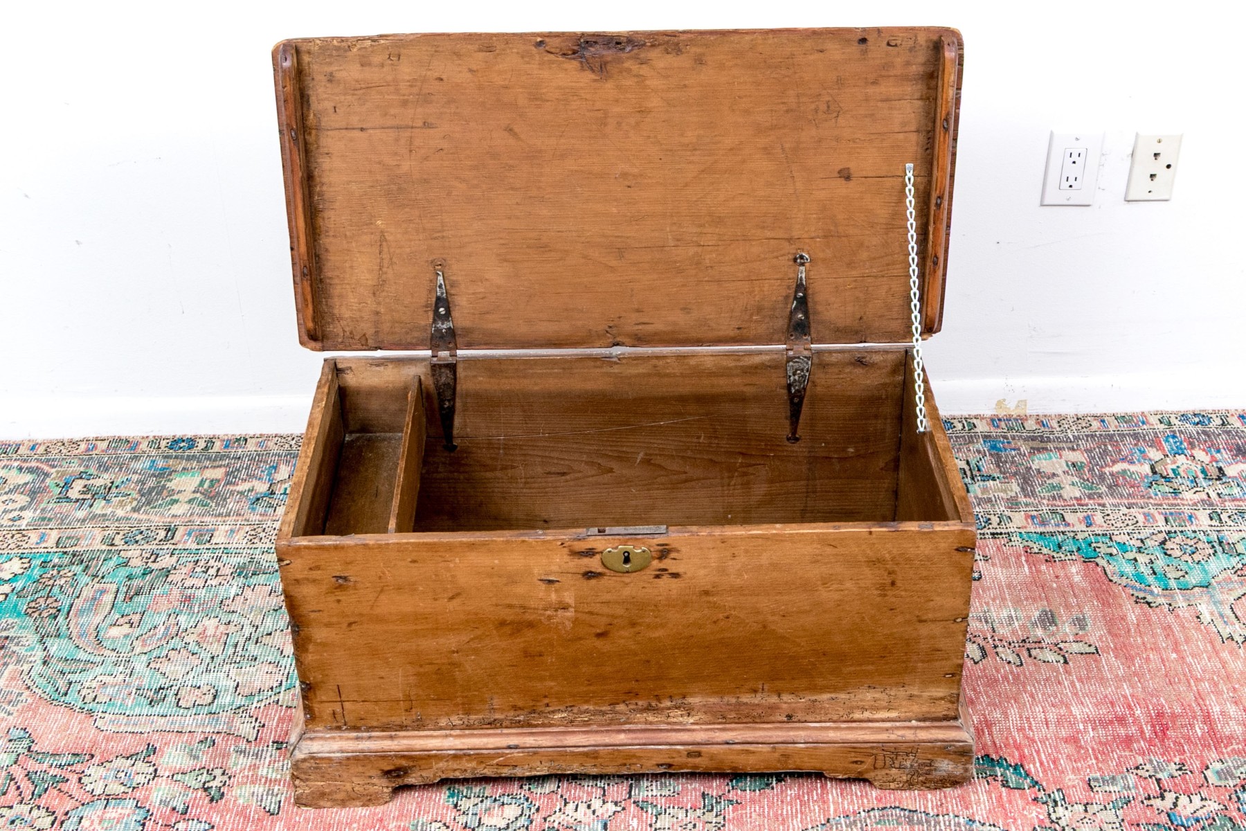 A classic 19th century blanket chest crafted in warm-toned honeyed brown wood with a rectangular hinged lid opening to a spacious interior with an open compartment to the upper left. Detailed with a brass key escutcheon and raised on bracket legs.