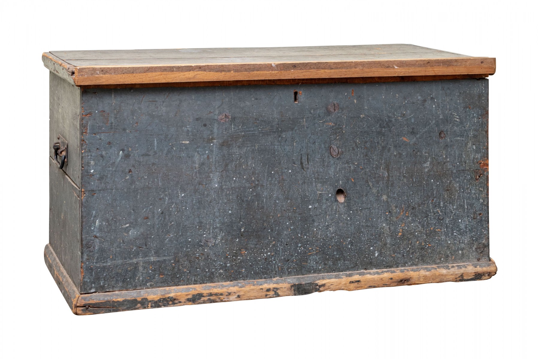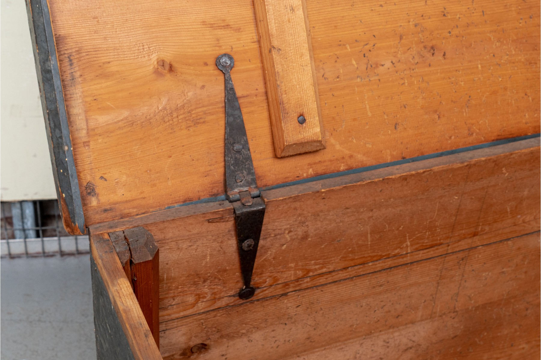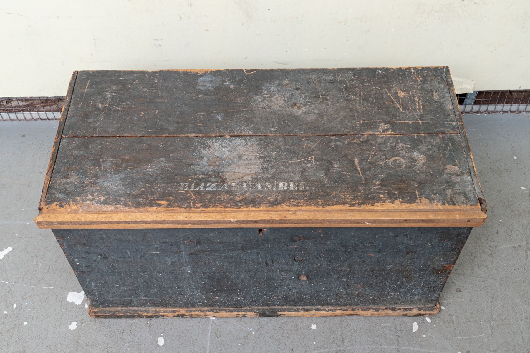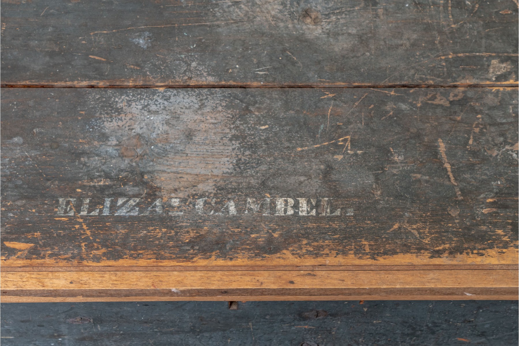 A 19th century blanket chest with remnants of blue paint and traces of the name Eliza L. Cambell. Lid lifts on iron hinges.