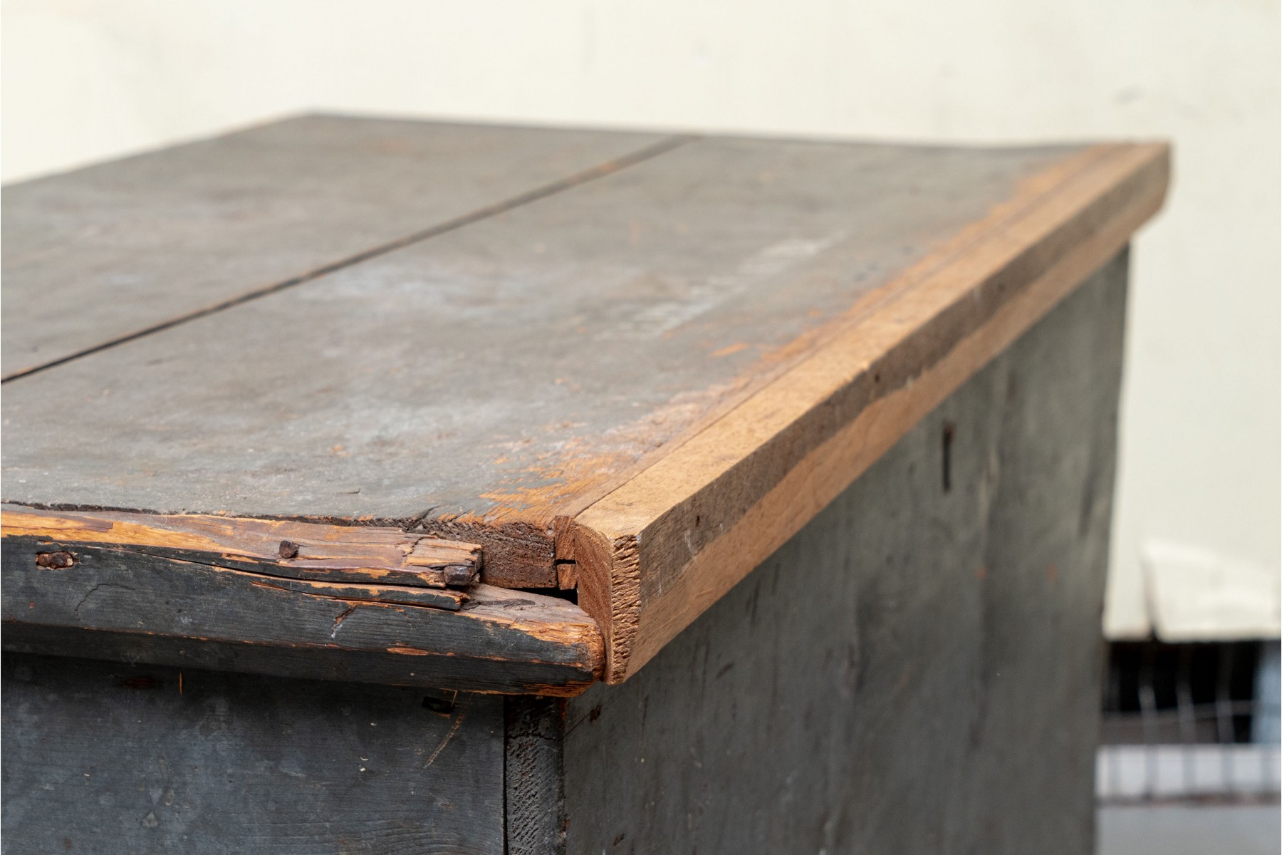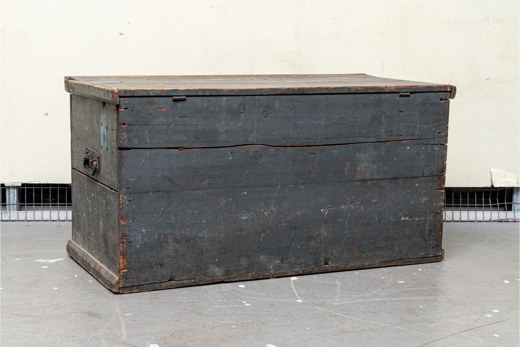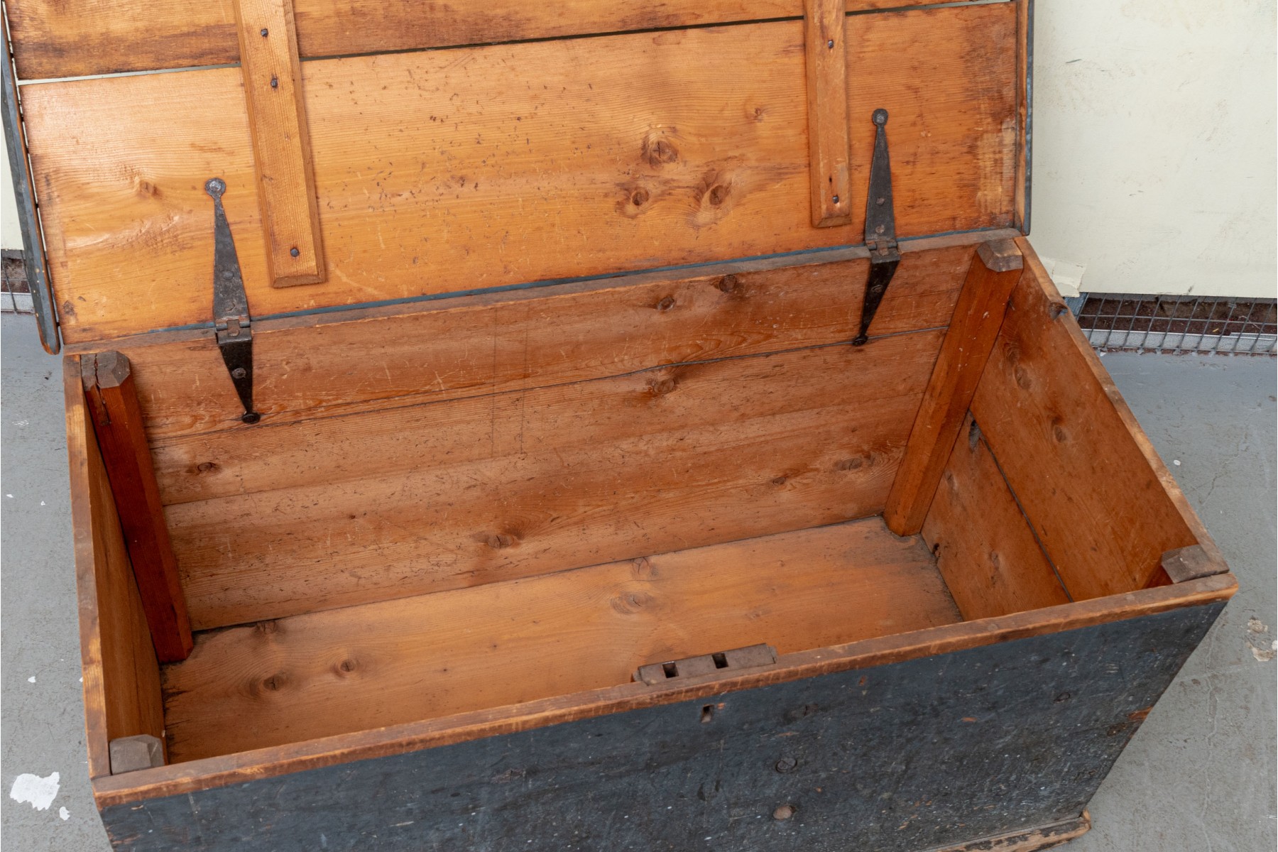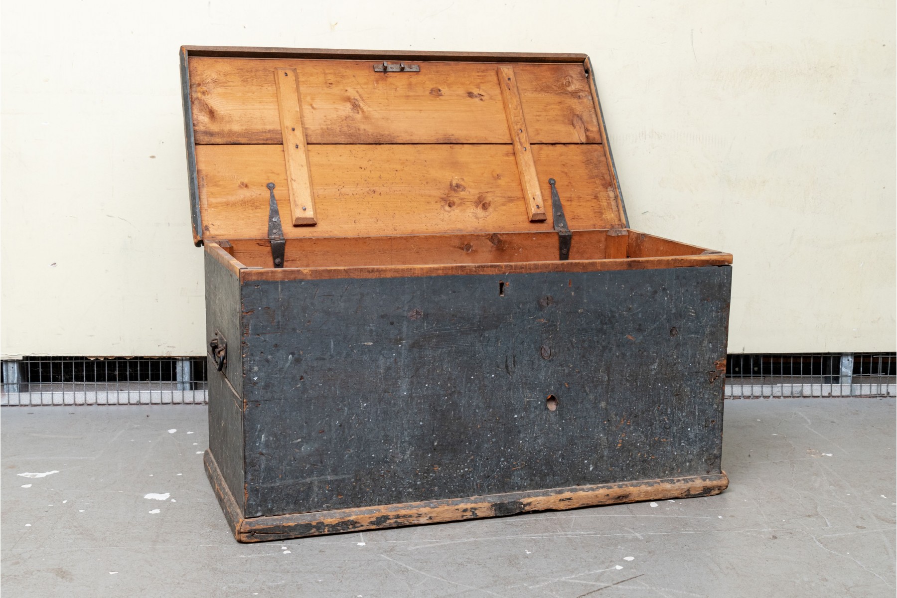 A 19th century blanket chest with remnants of blue paint and traces of the name Eliza L. Cambell. Lid lifts on iron hinges.