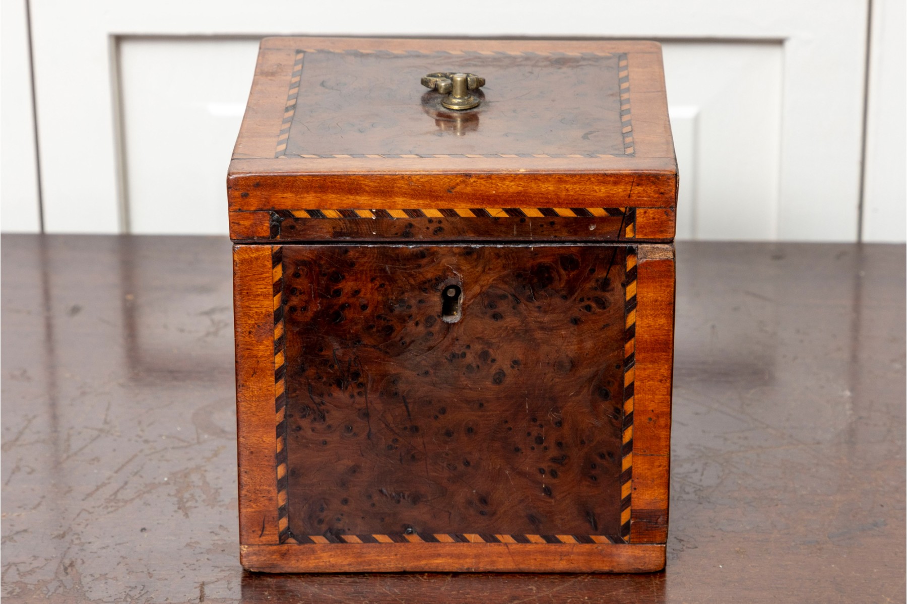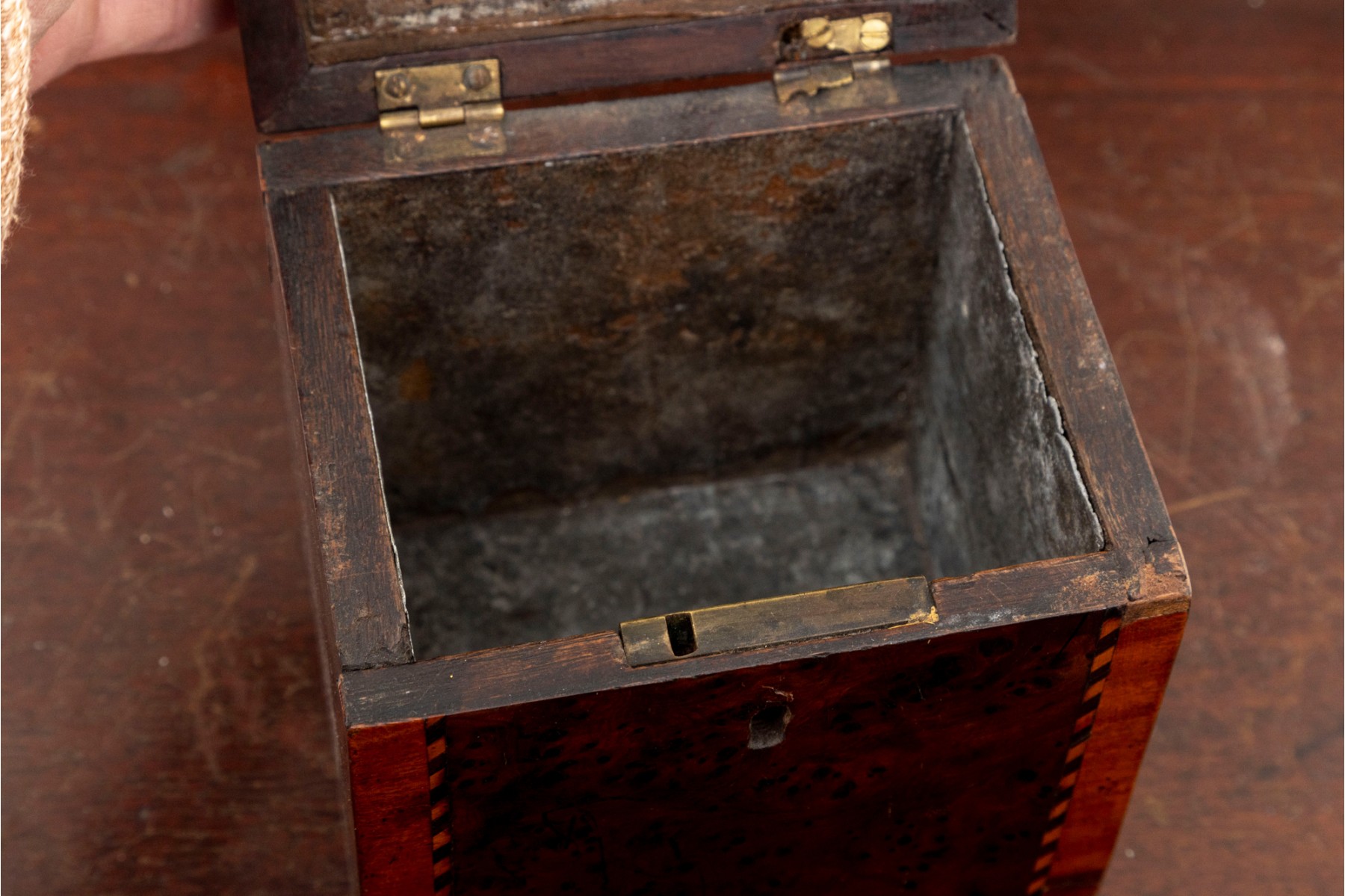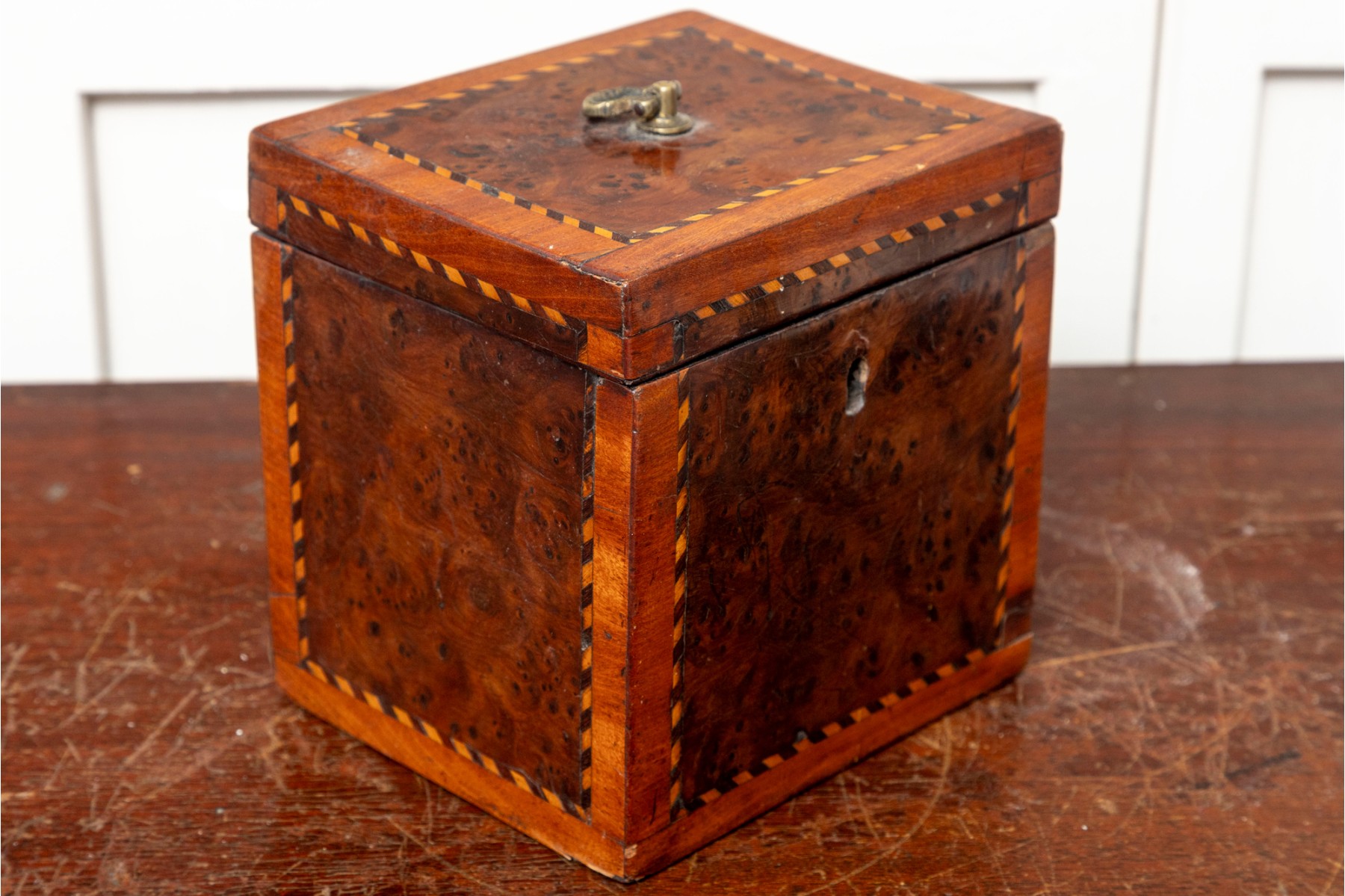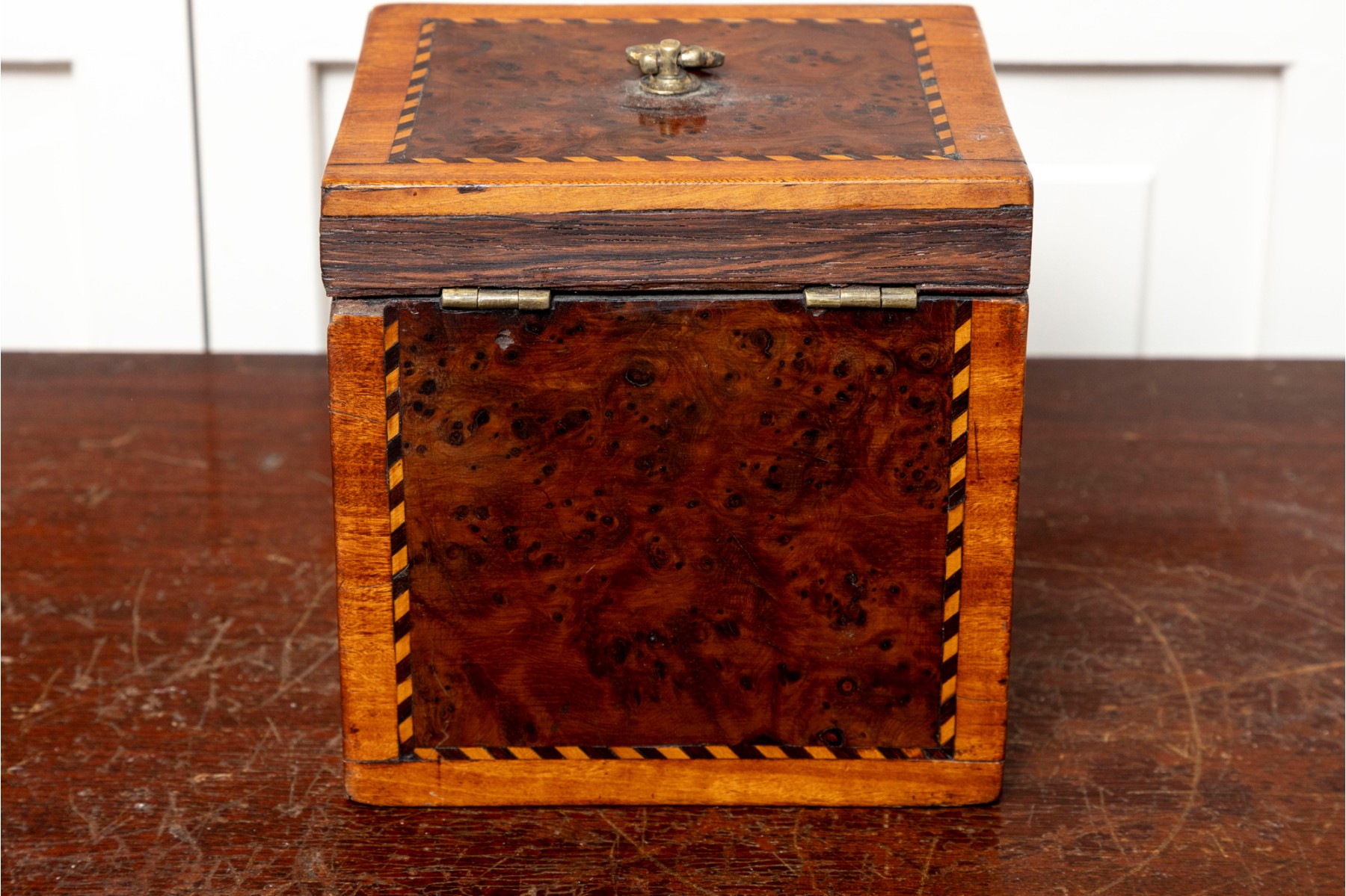 A gorgeous 19th century tea caddy in richly hued medium brown burlwoood surrounded by mahogany parquetry.