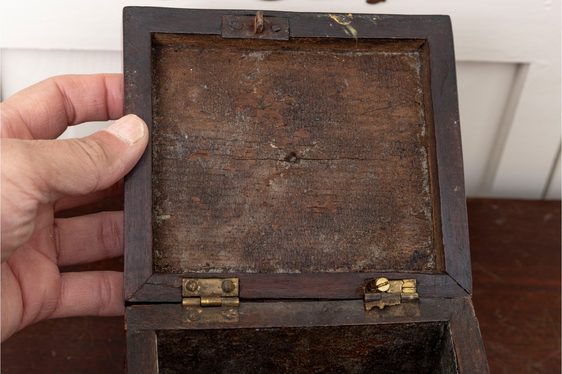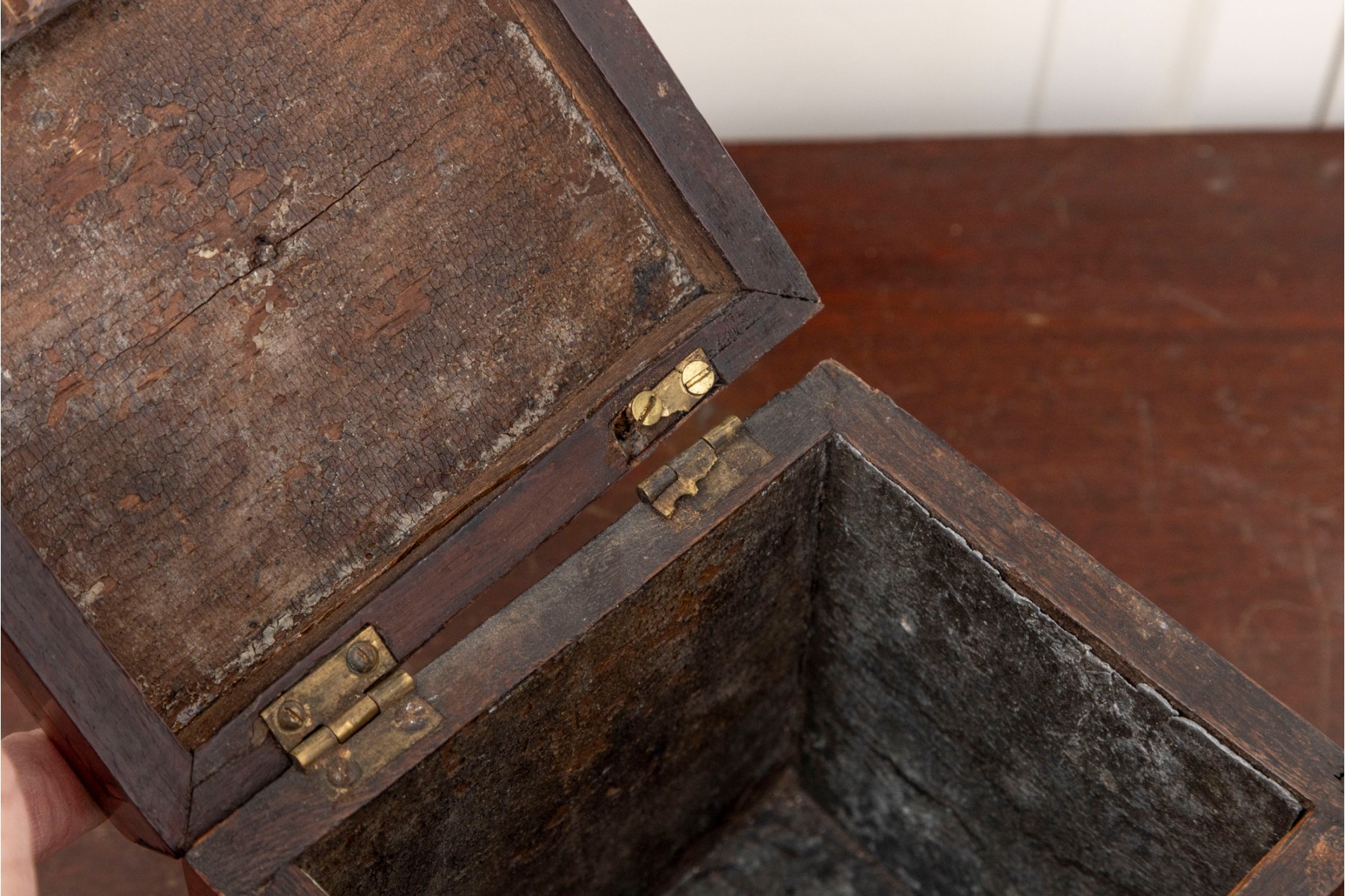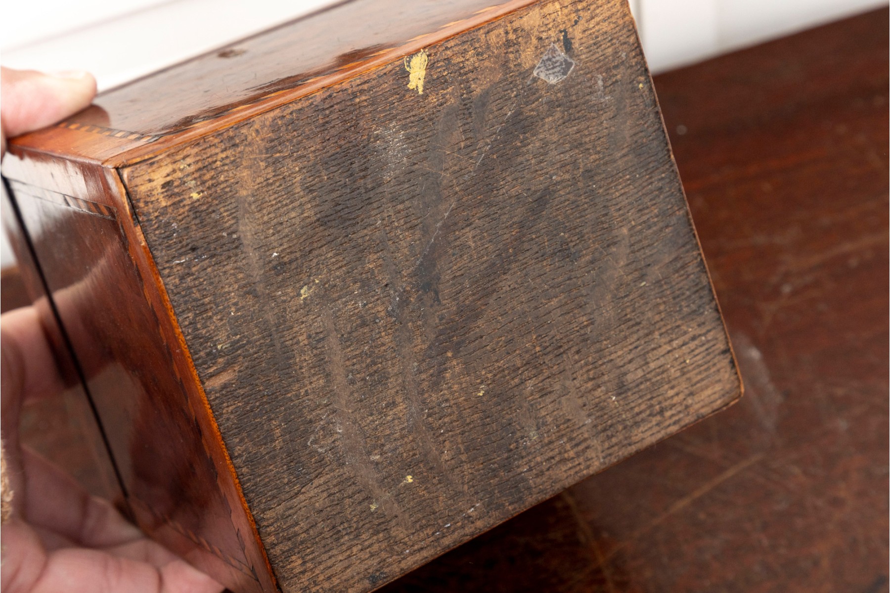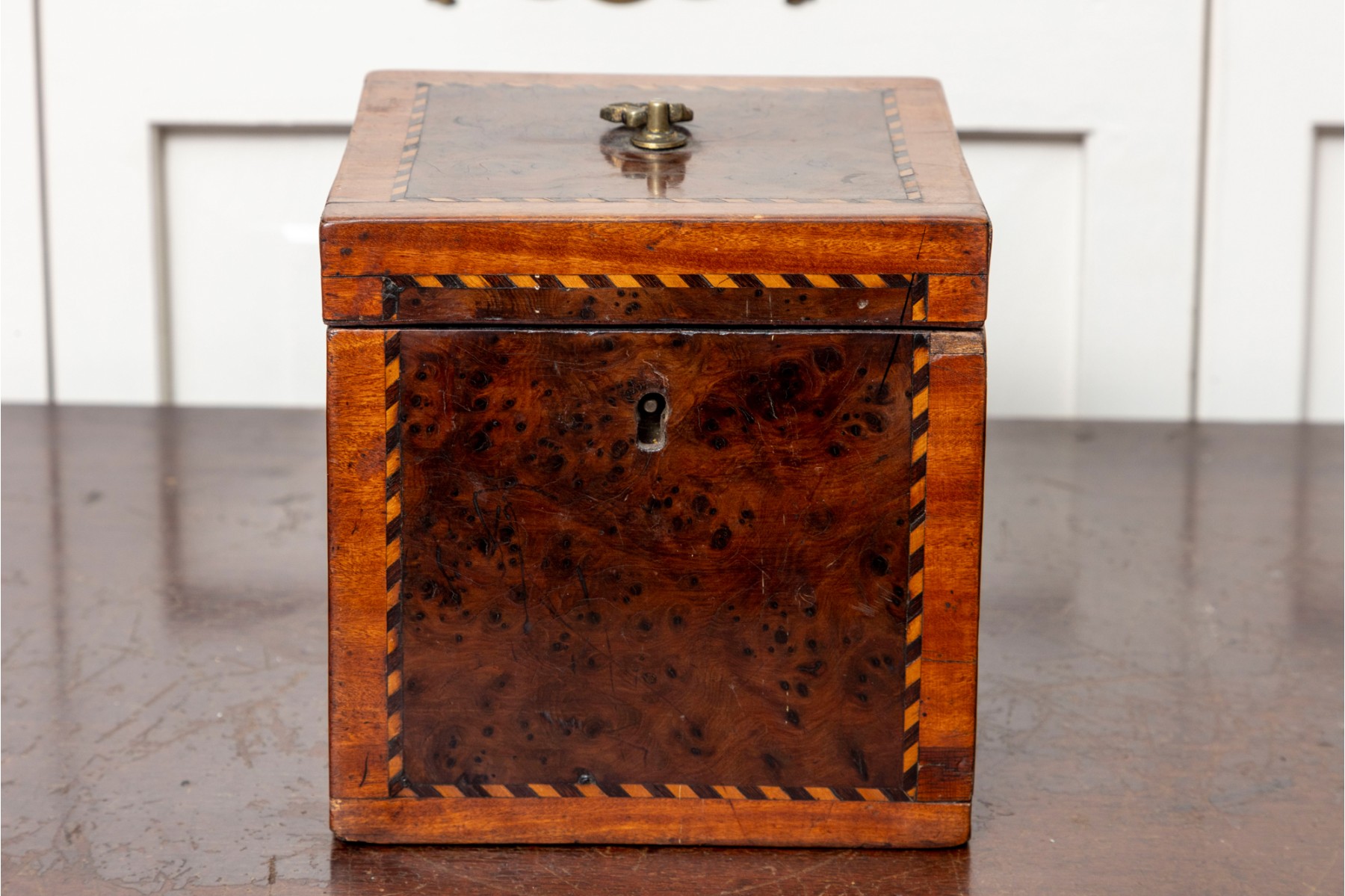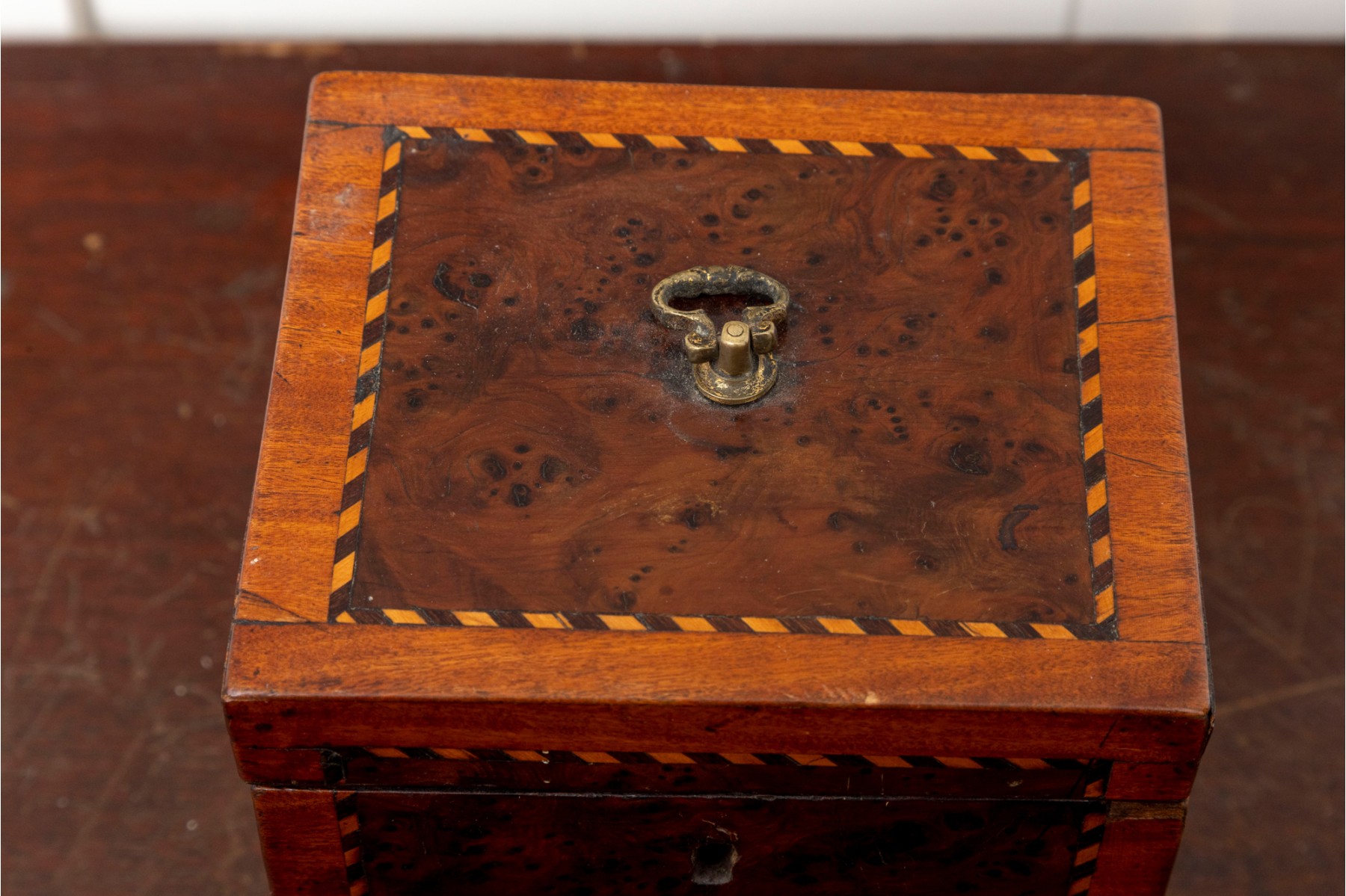 A gorgeous 19th century tea caddy in richly hued medium brown burlwoood surrounded by mahogany parquetry.