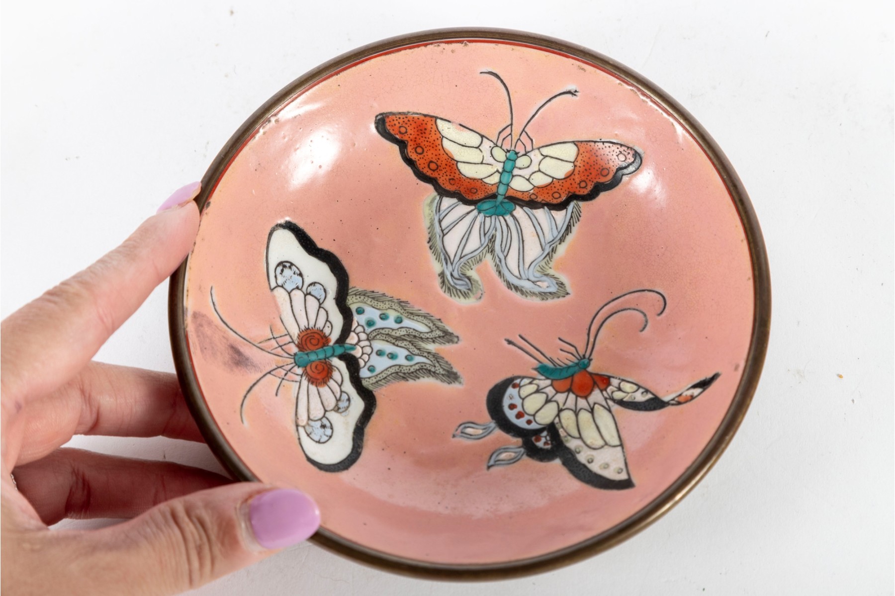 A 19th century Chinese enamel-on-brass bowl with Tongzhi Period (1862–1874) mark, decorated with colorful enamel butterfly motifs against a pale ground.