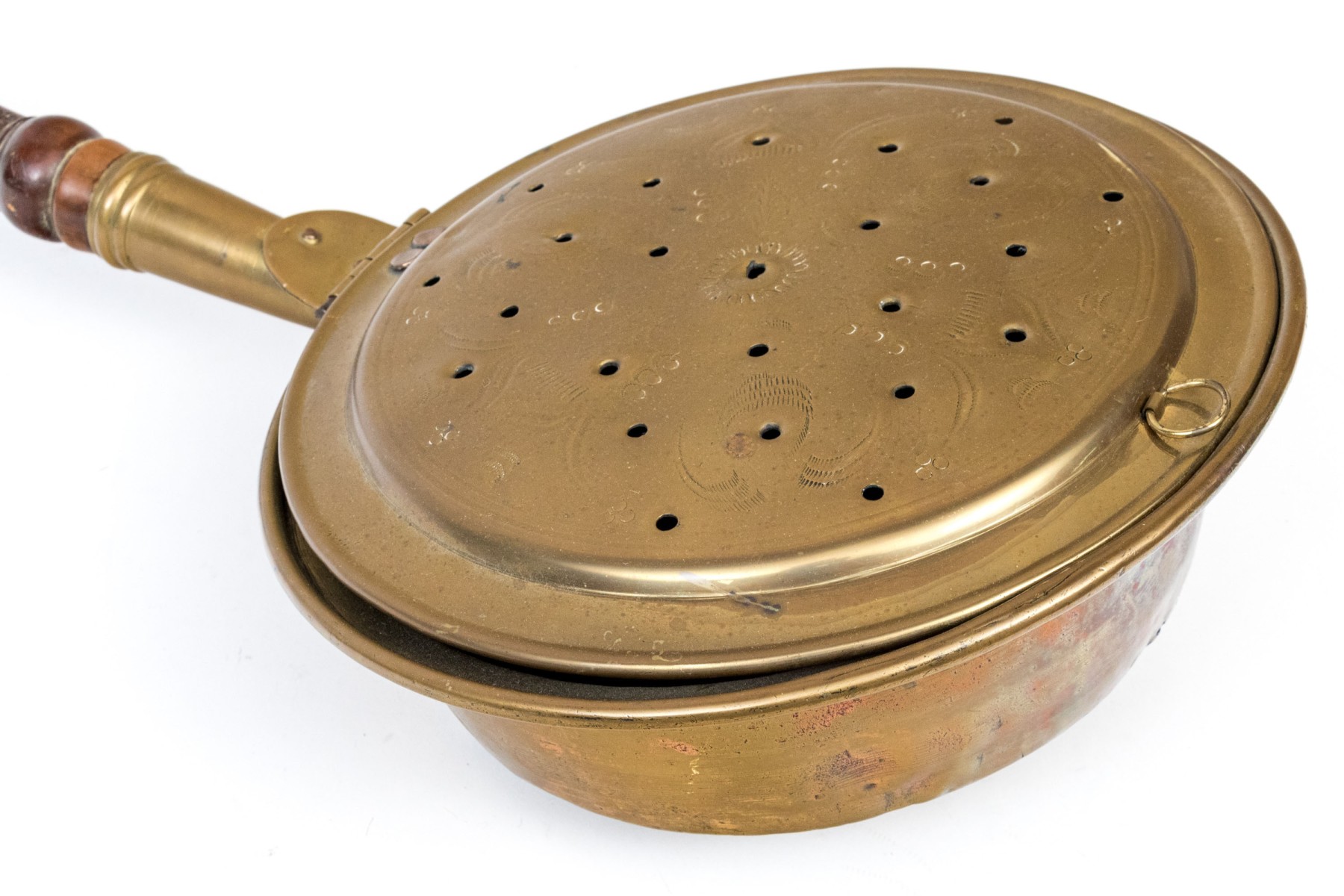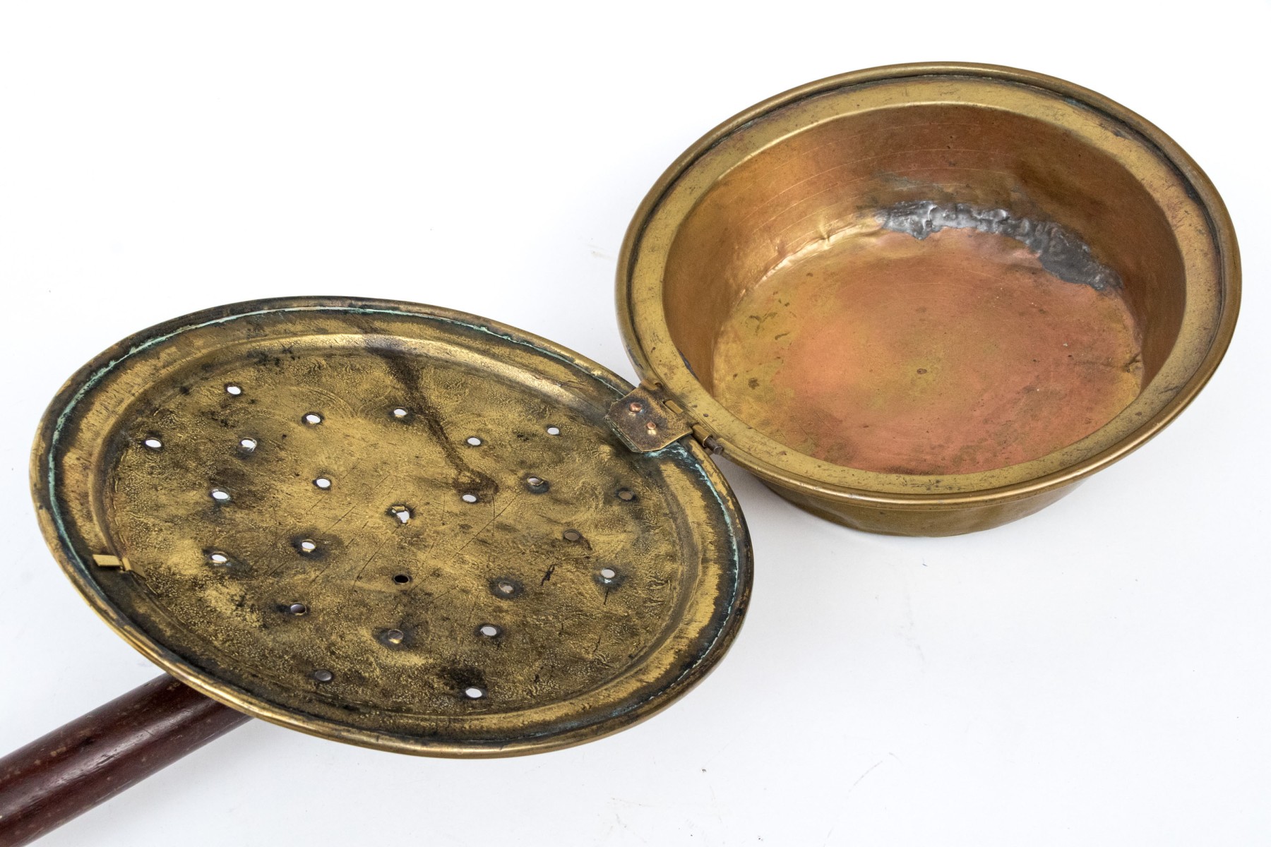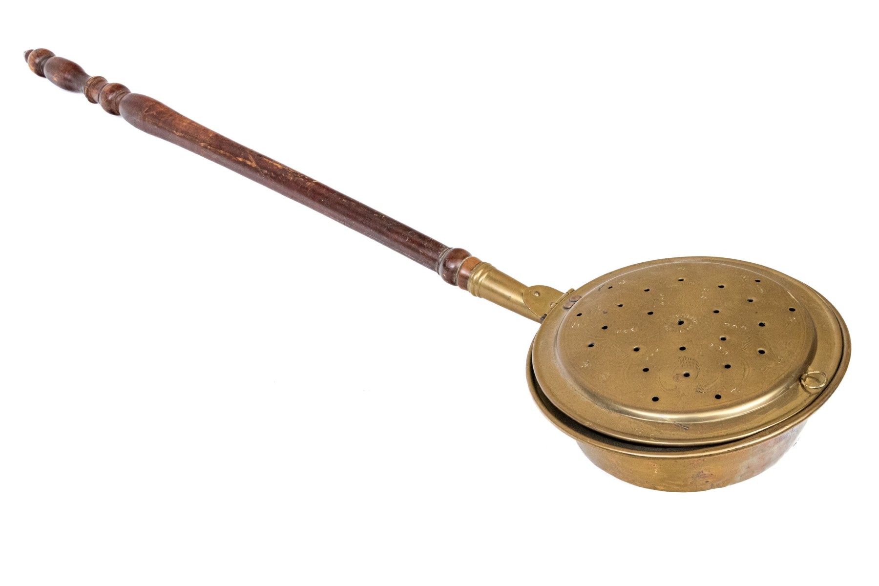 The antique copper clad brass bed warmer has a long turned wooden handle. The hinged lid is pierced and covers the copper clad pot basin. The wooden handle is turned.