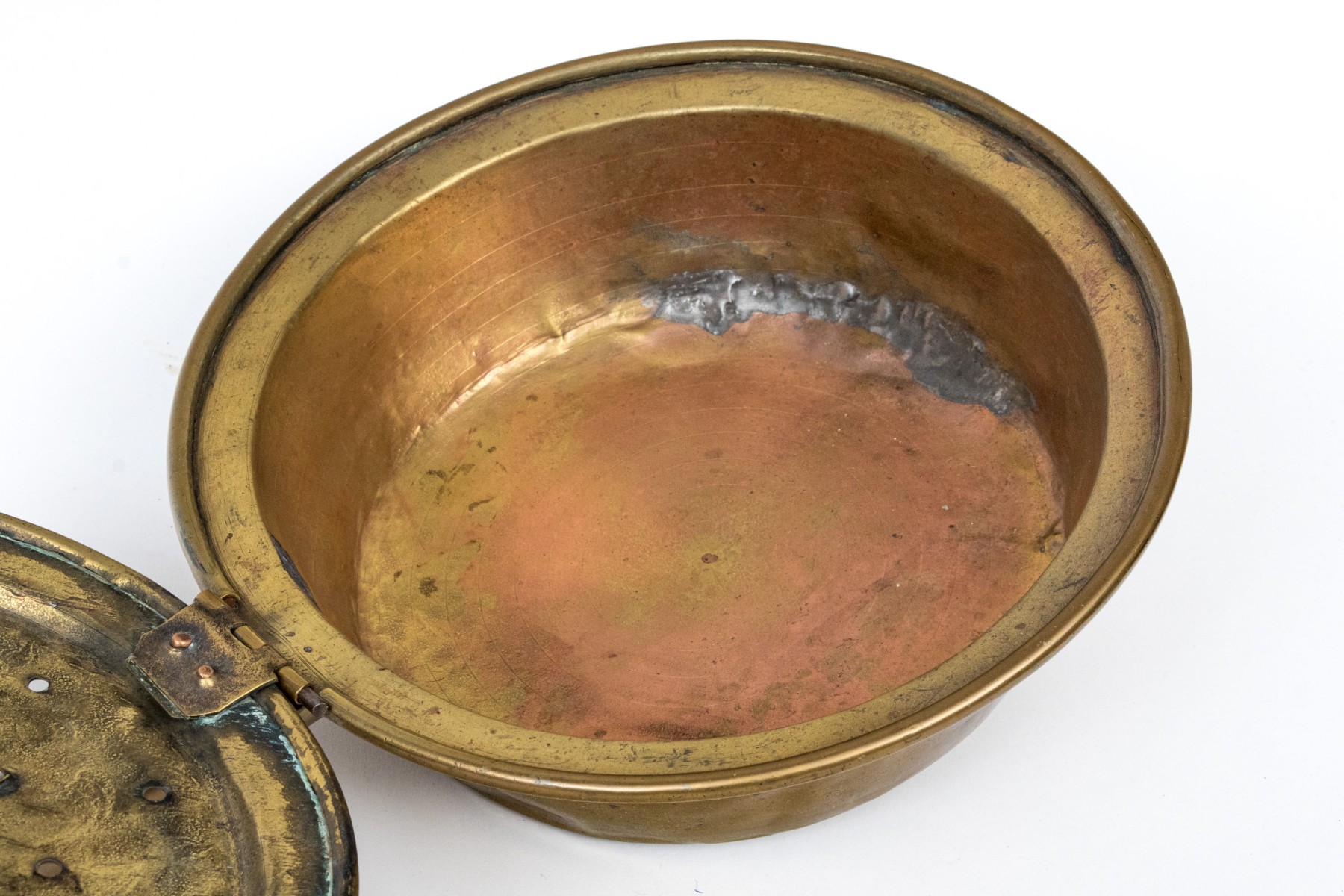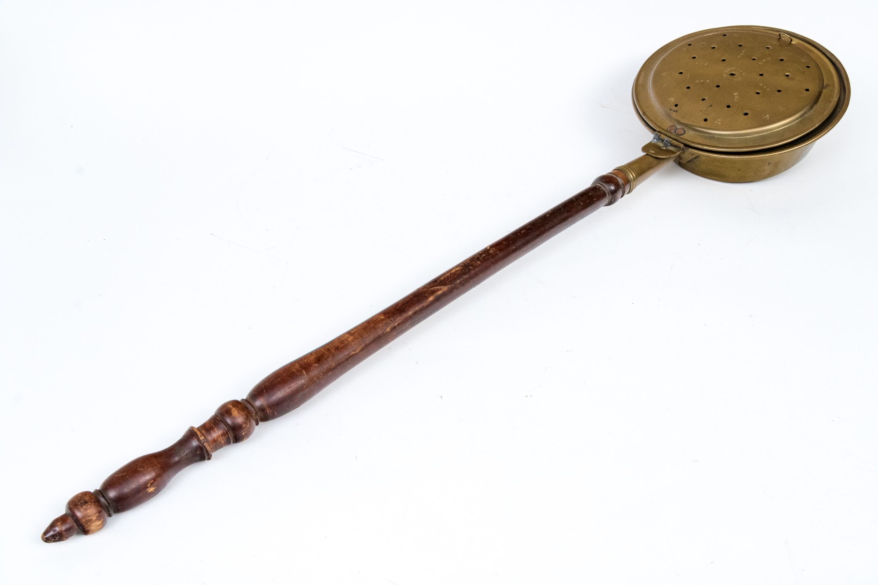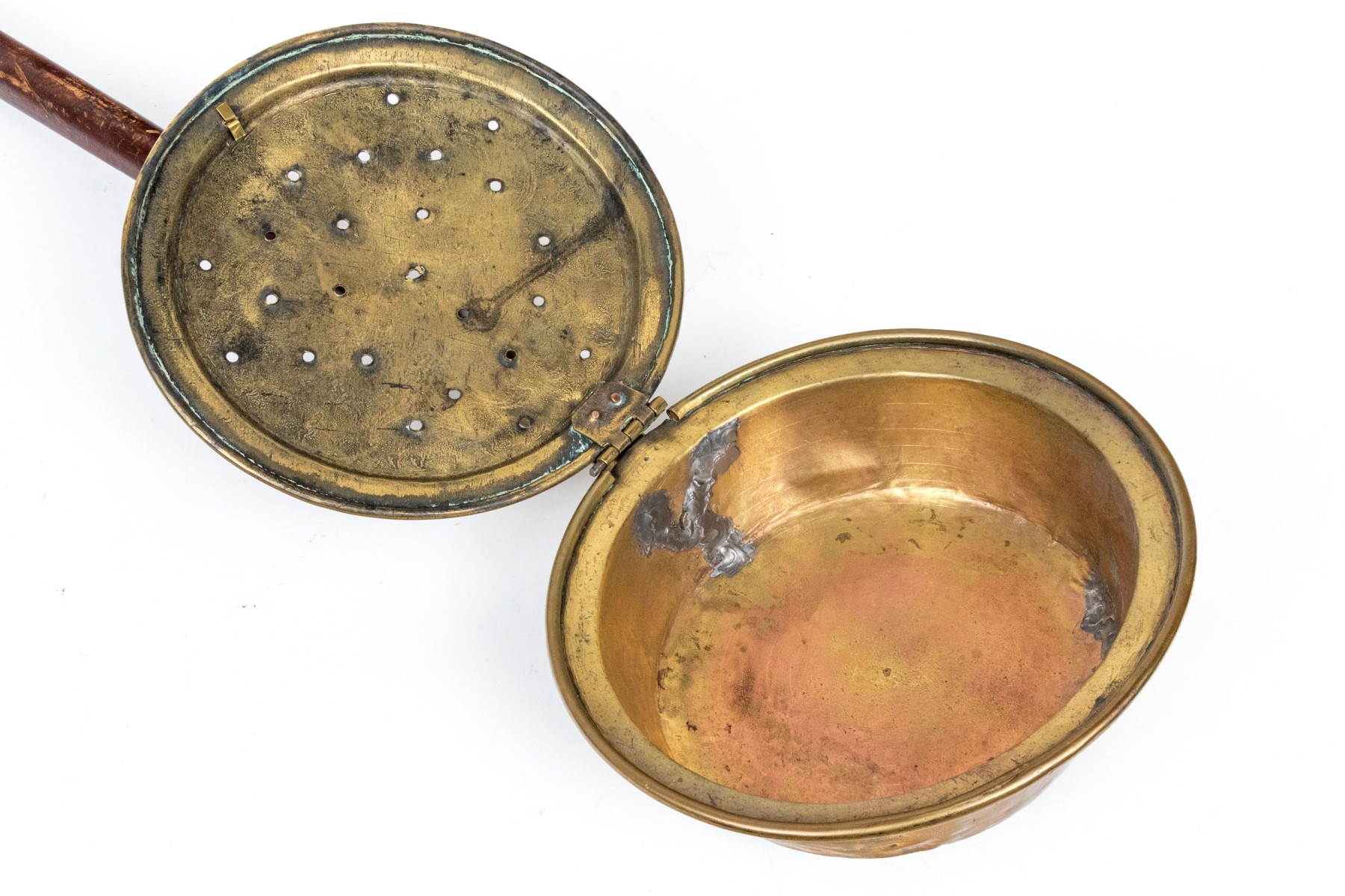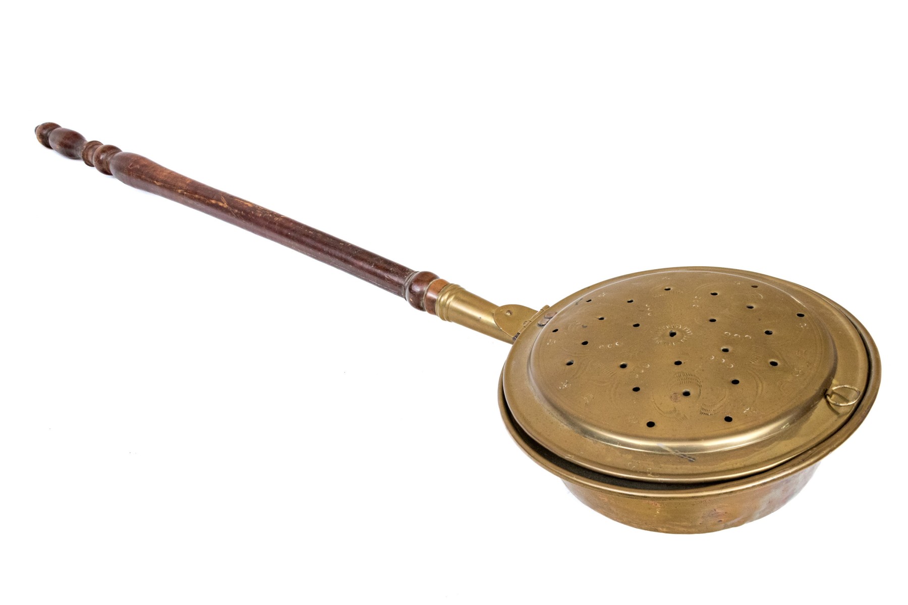 The antique copper clad brass bed warmer has a long turned wooden handle. The hinged lid is pierced and covers the copper clad pot basin. The wooden handle is turned.