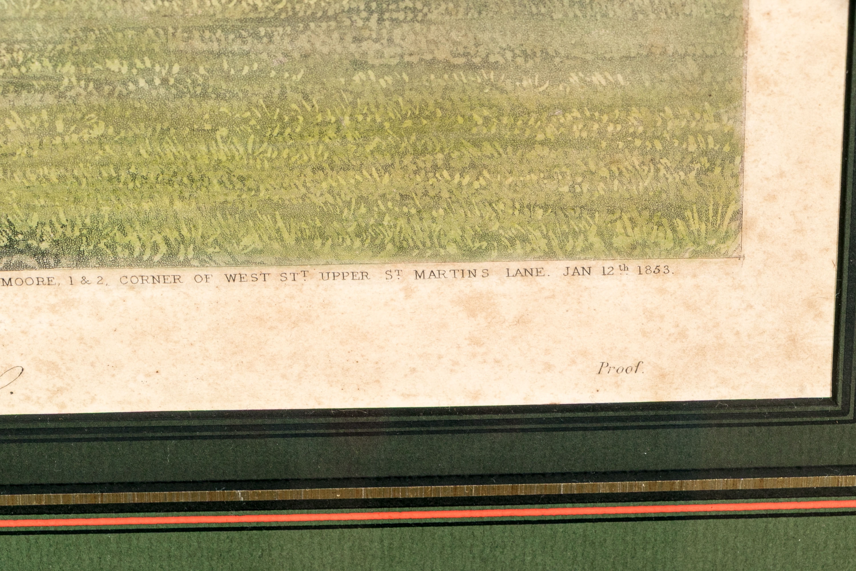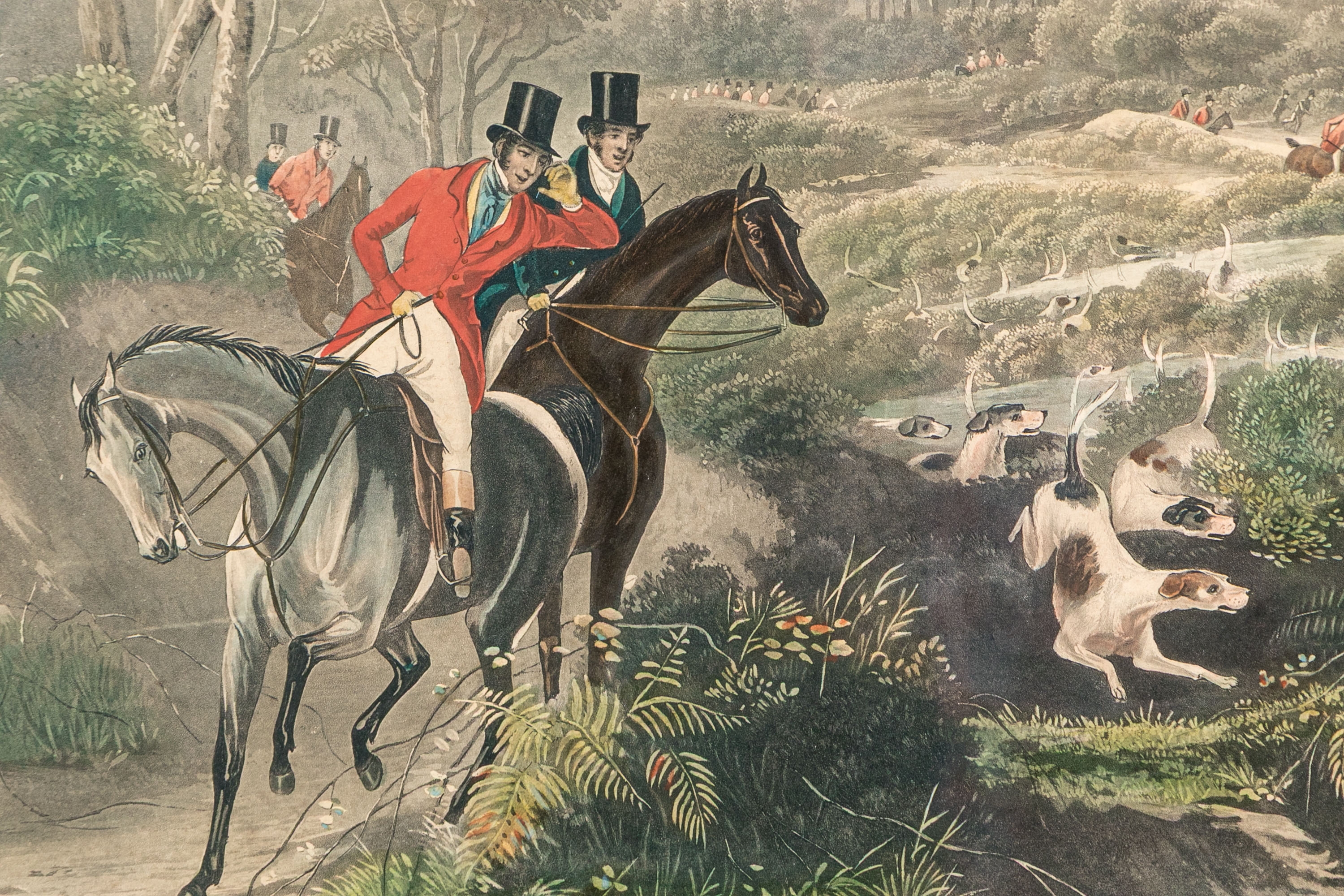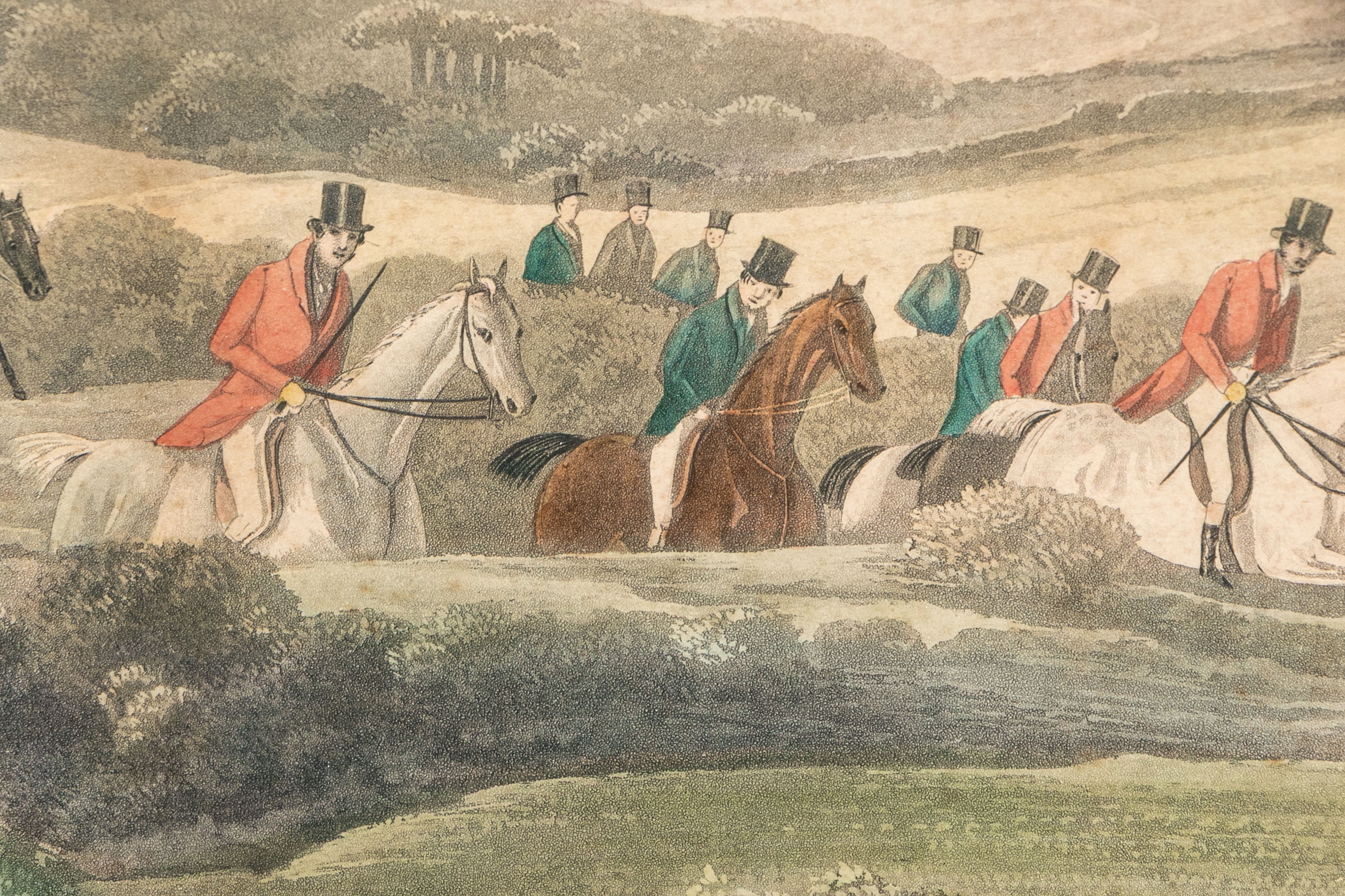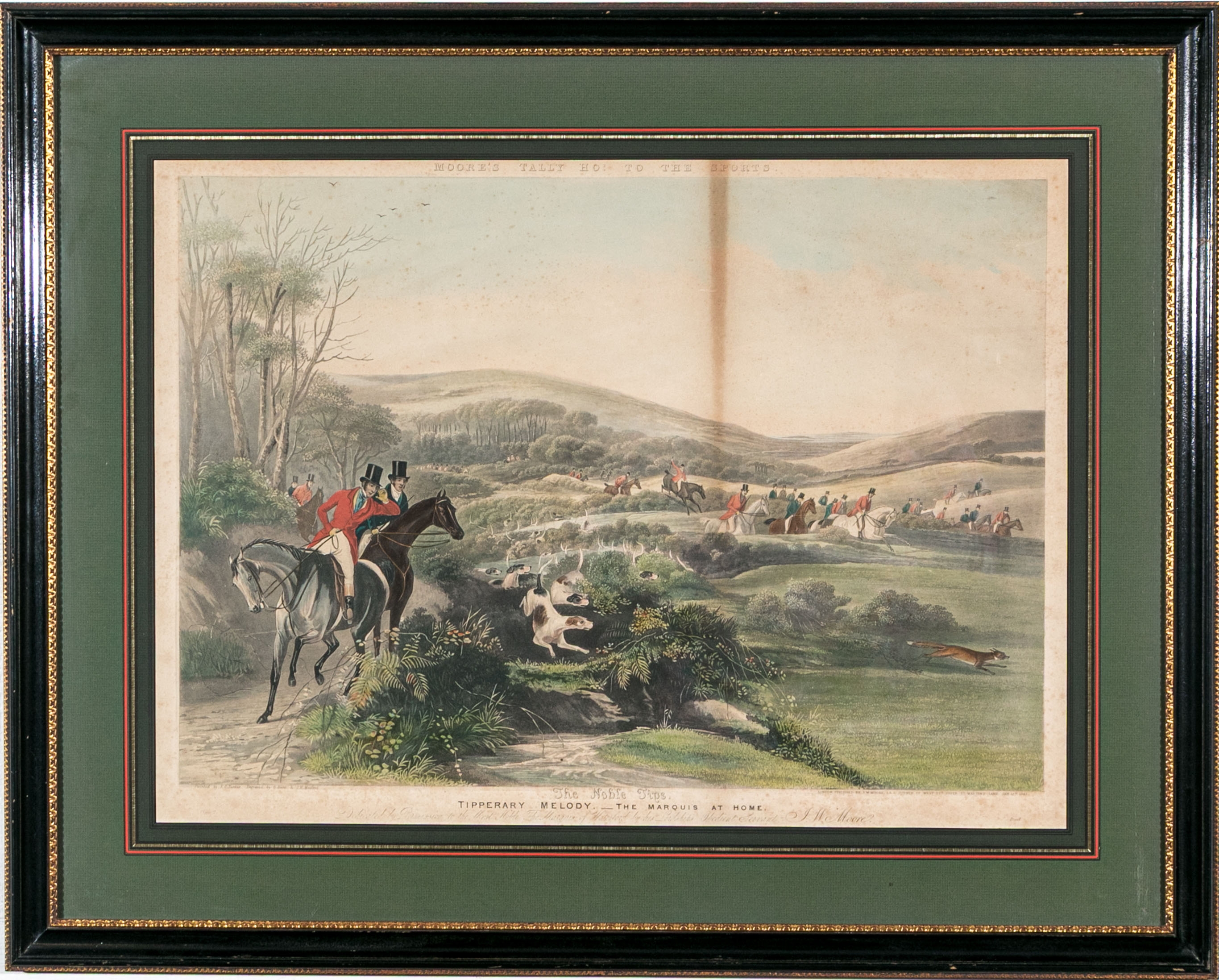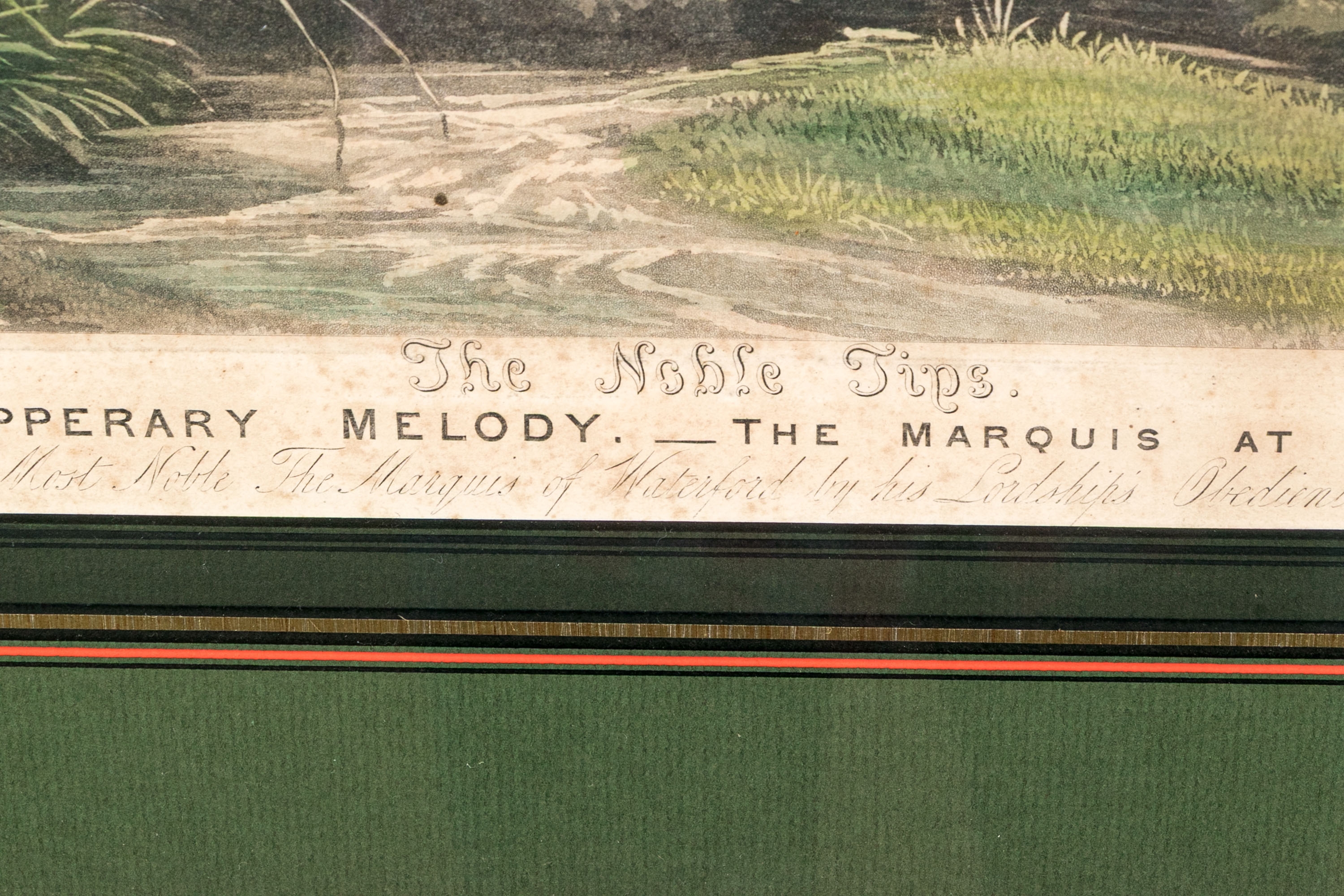 "Tipperary Melody- The Marquis at Home" printed London, 1853, depicting a hunt in beautiful rolling hills with the dogs swimming across a stream in pursuit of the fox racing ahead.