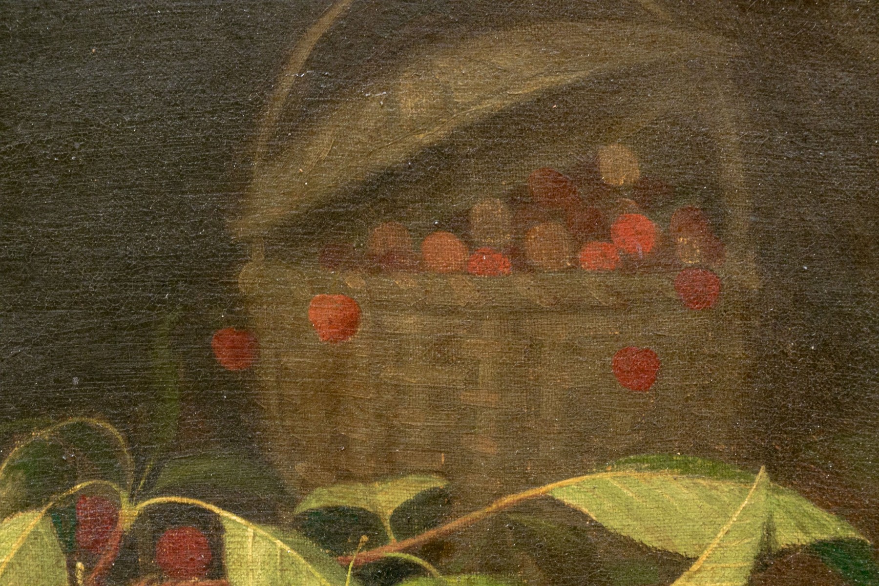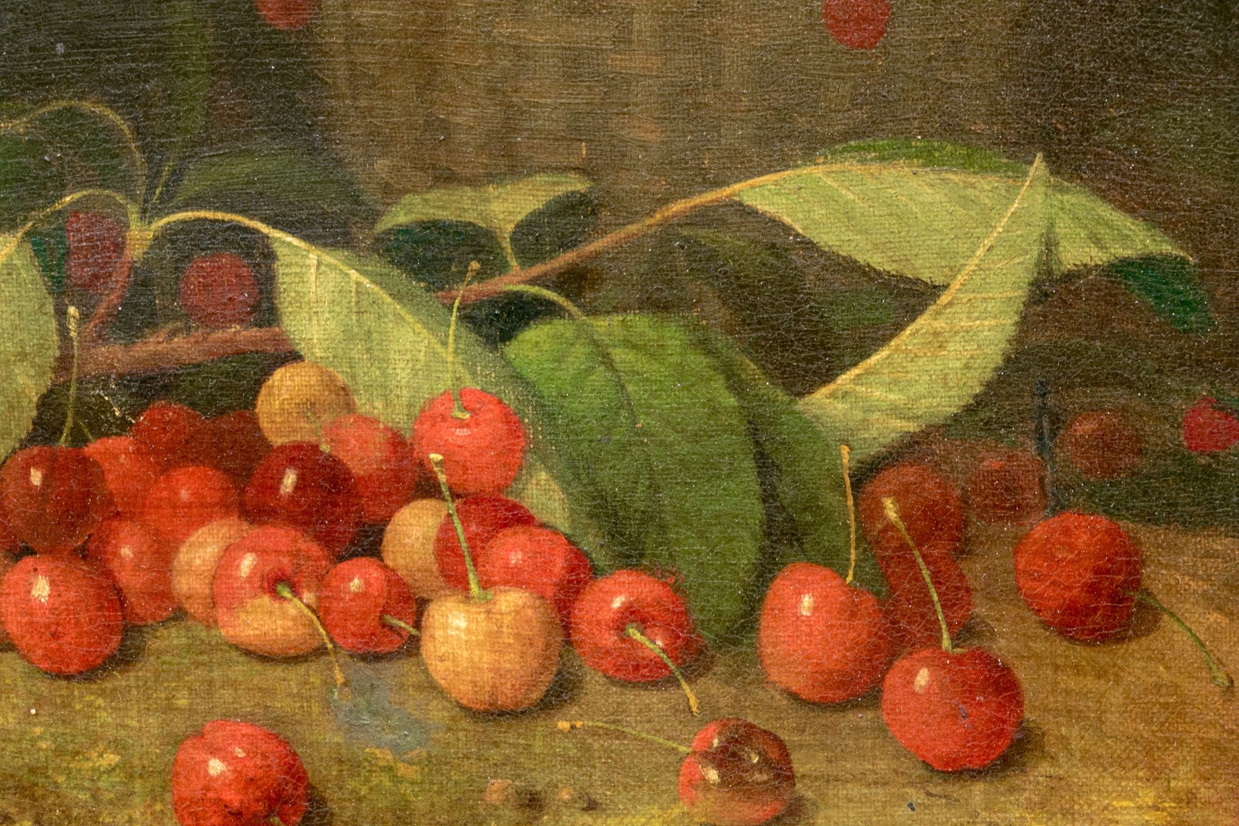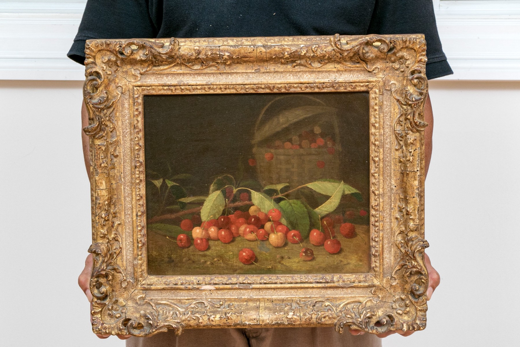 Captivating oil on canvas still life portrays an overflowing basket of cherries, with the lower left corner possibly bearing the signature "P Kearney." The artwork is elegantly showcased in an ornate gilt frame, complete with custom matting, enhancing its overall presentation.
