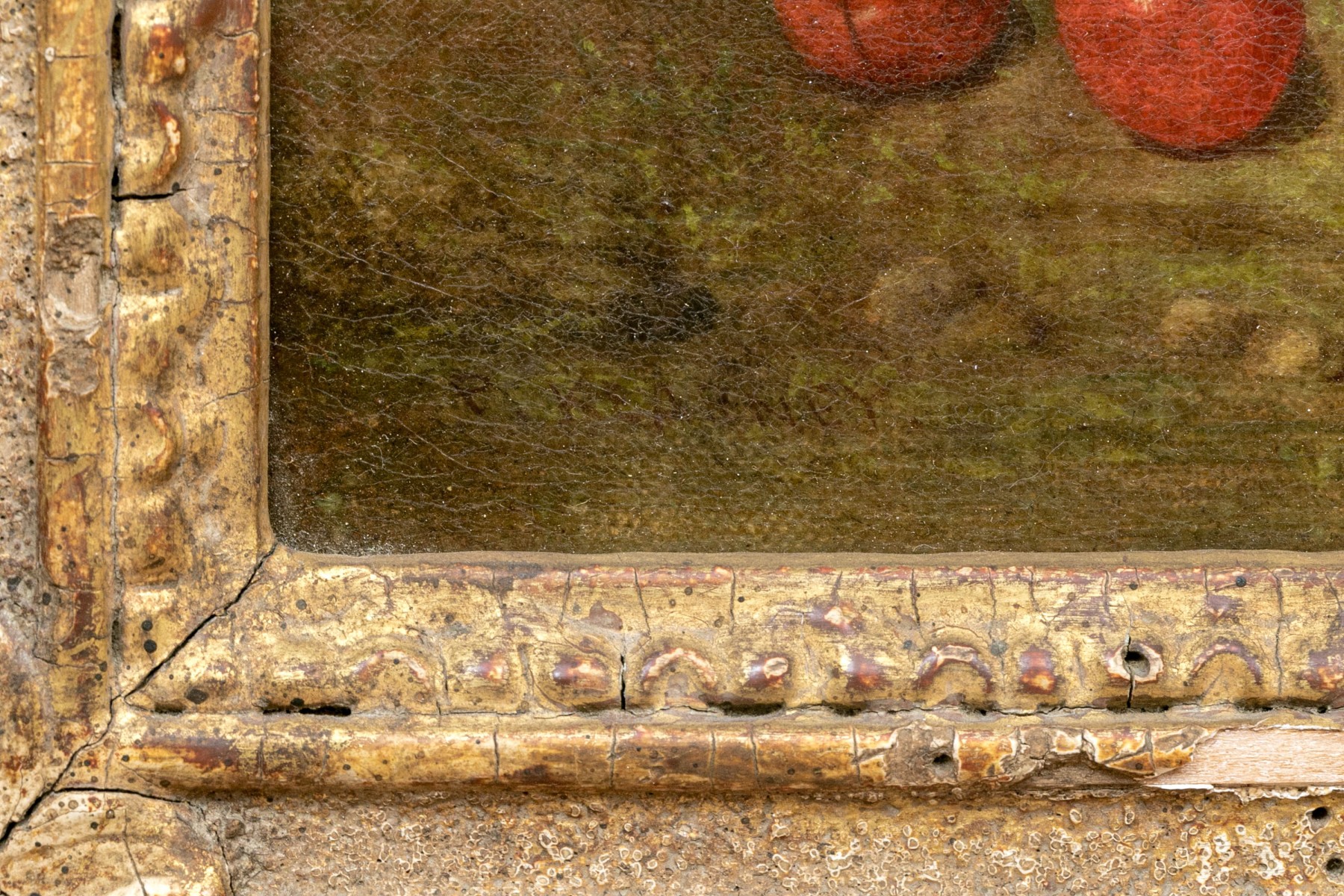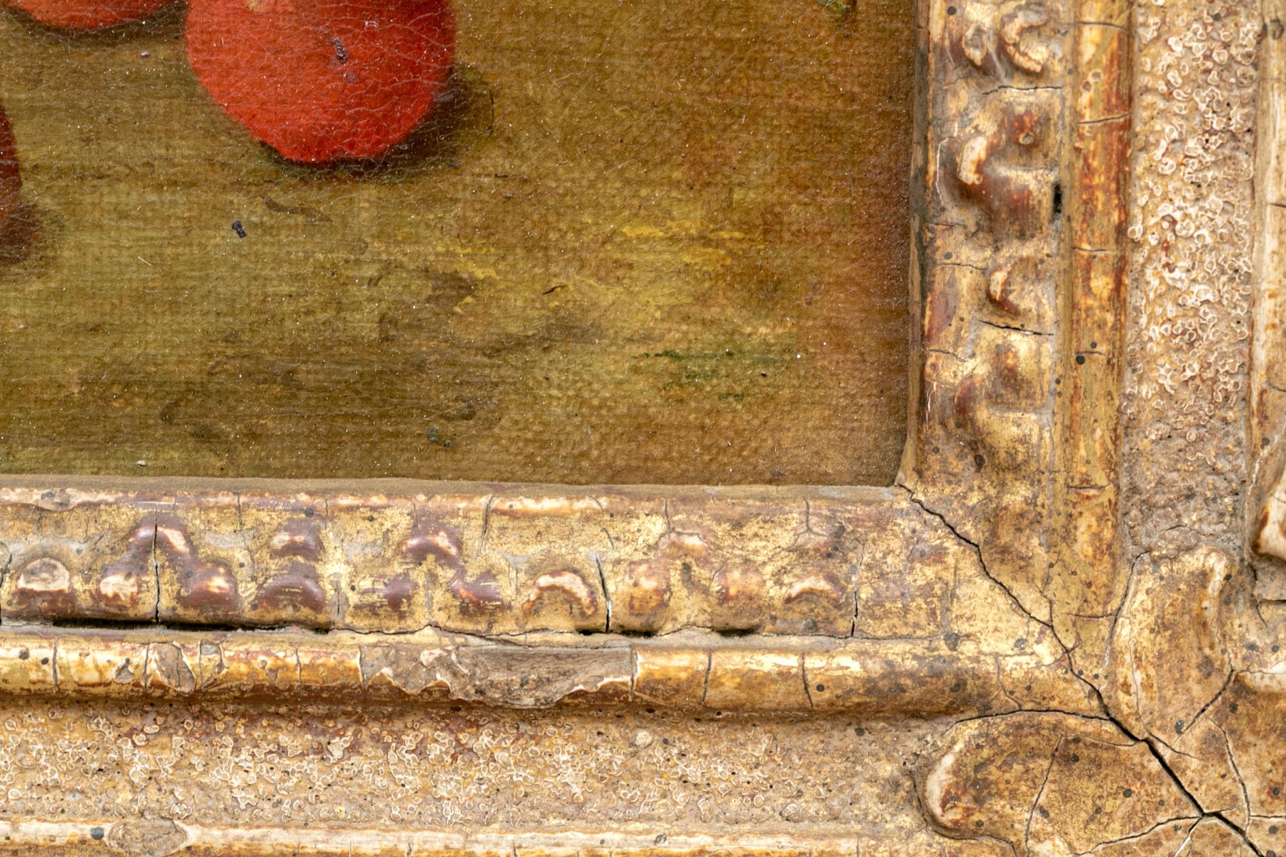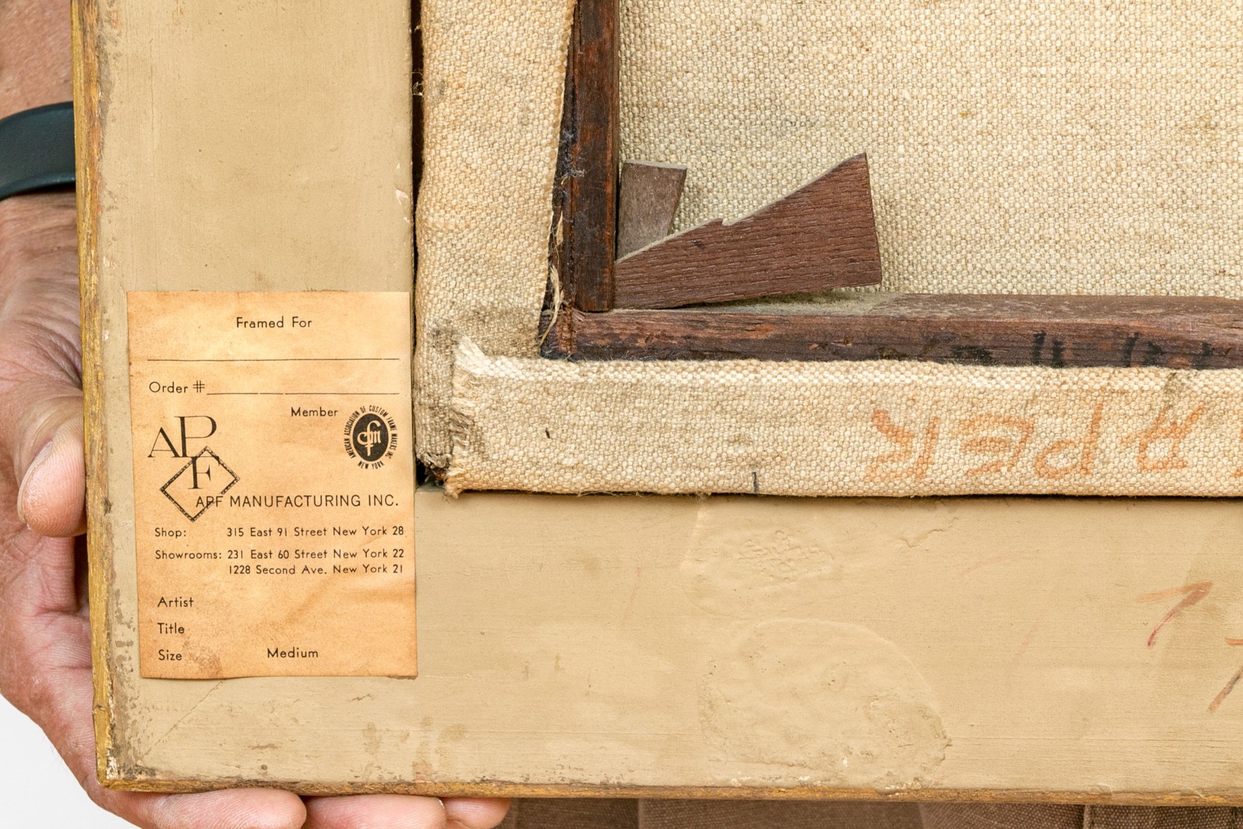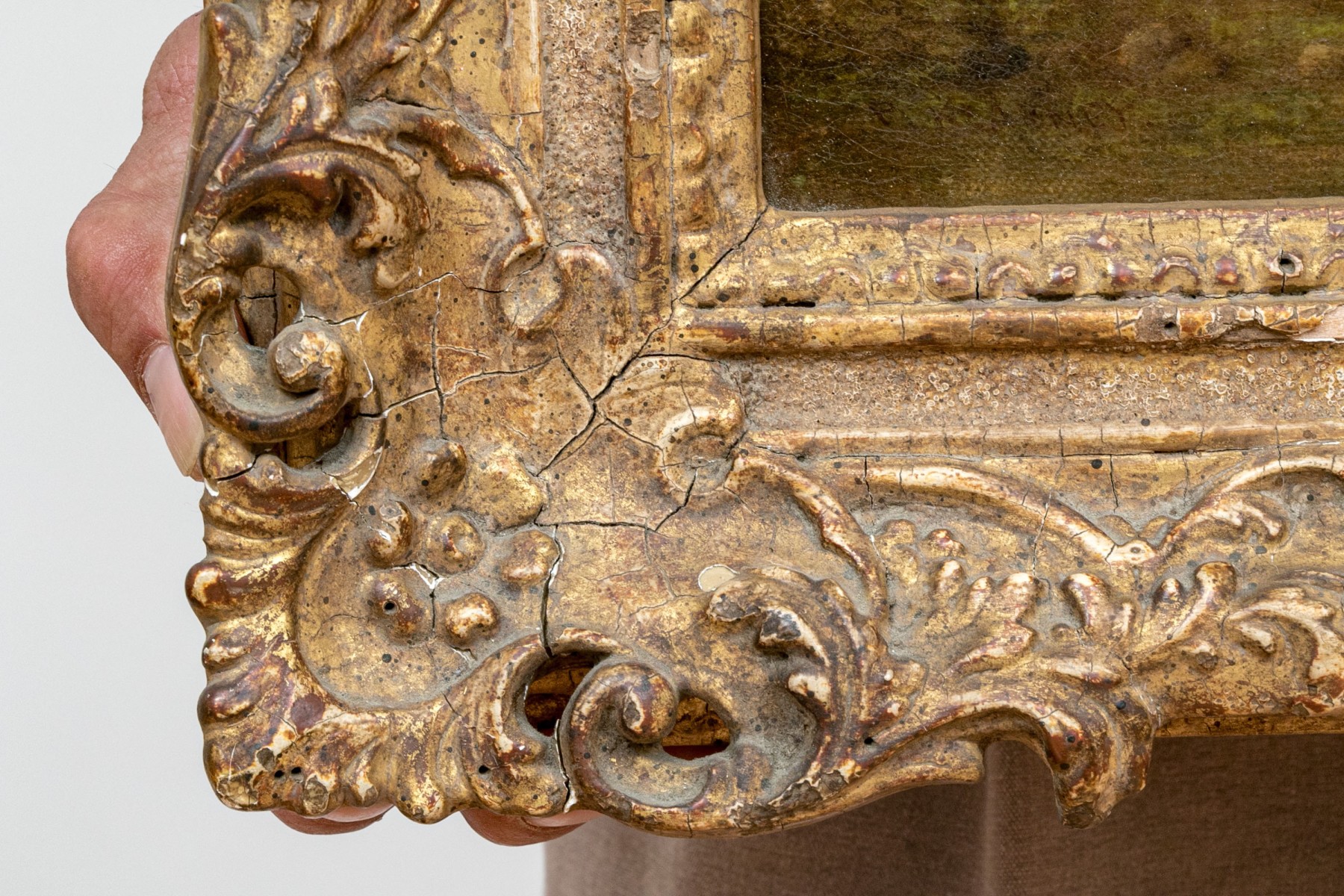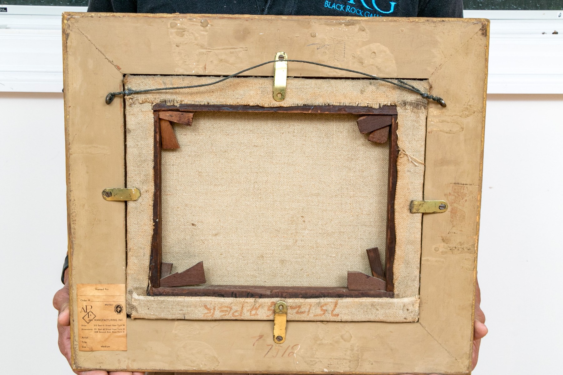 Condition: The artwork is in good condition, but the frame exhibits age-related wear with some losses, chips, and cracks. Additionally, the canvas back shows some discoloration.