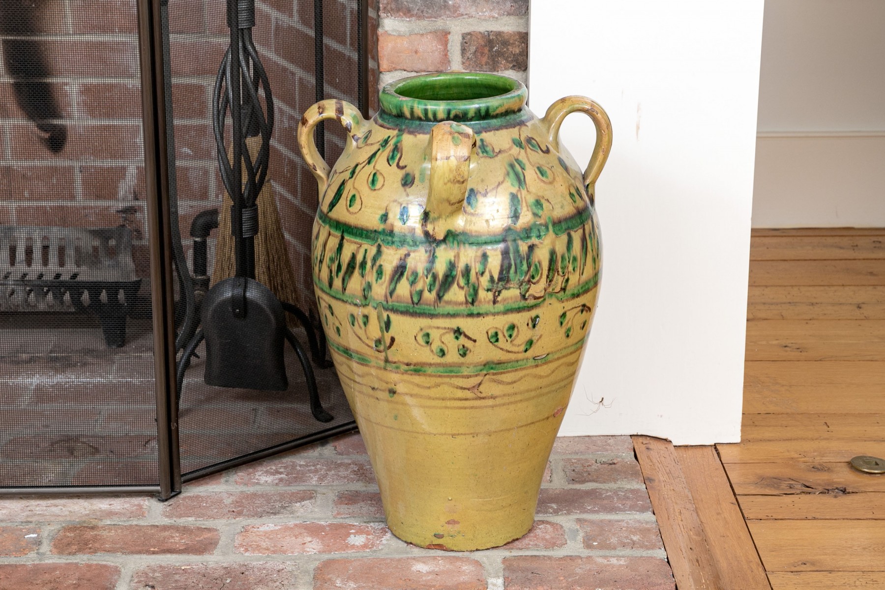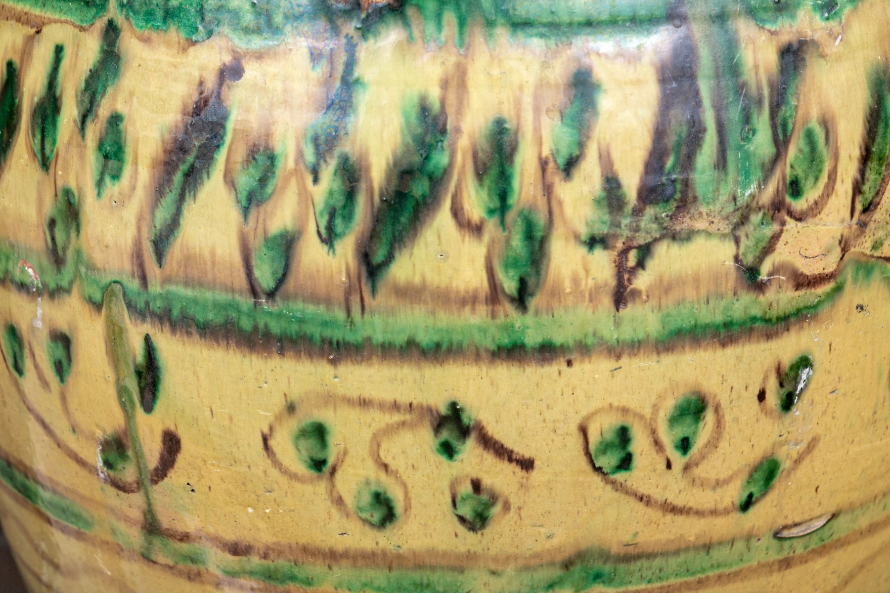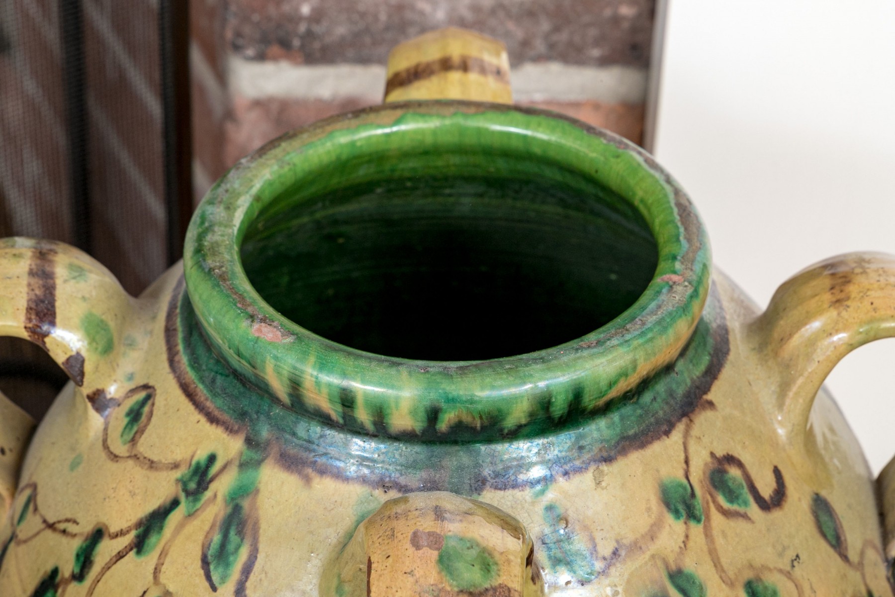 This 19th-century French glazed jardiniere from Savoie, France, and is characterized by its charming yellow and green glaze. It boasts four handles, making it a distinctive and functional piece of pottery.