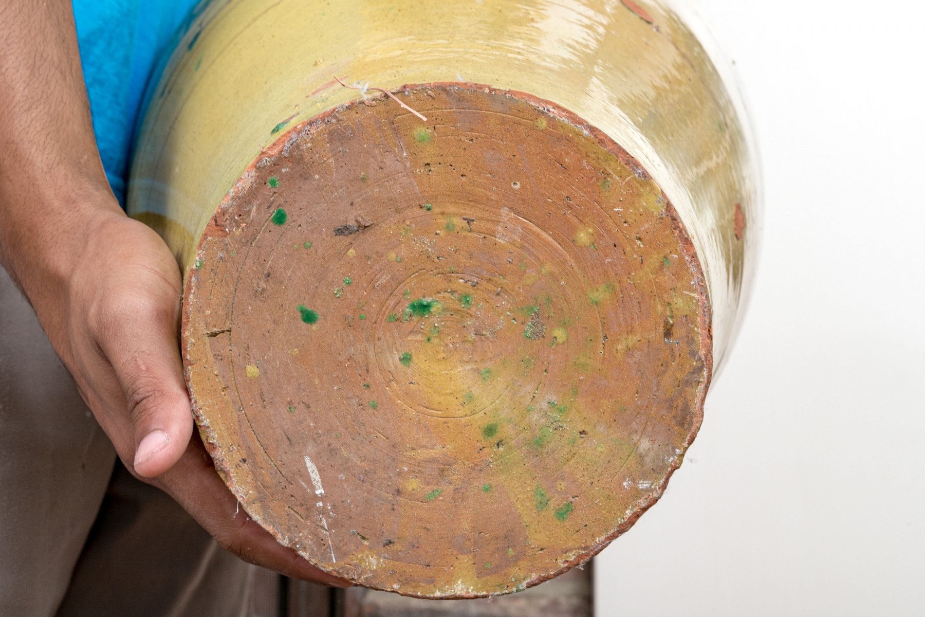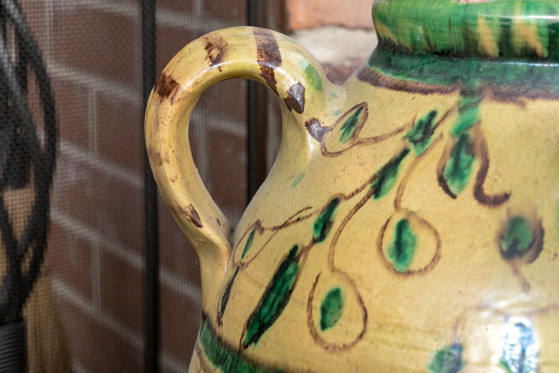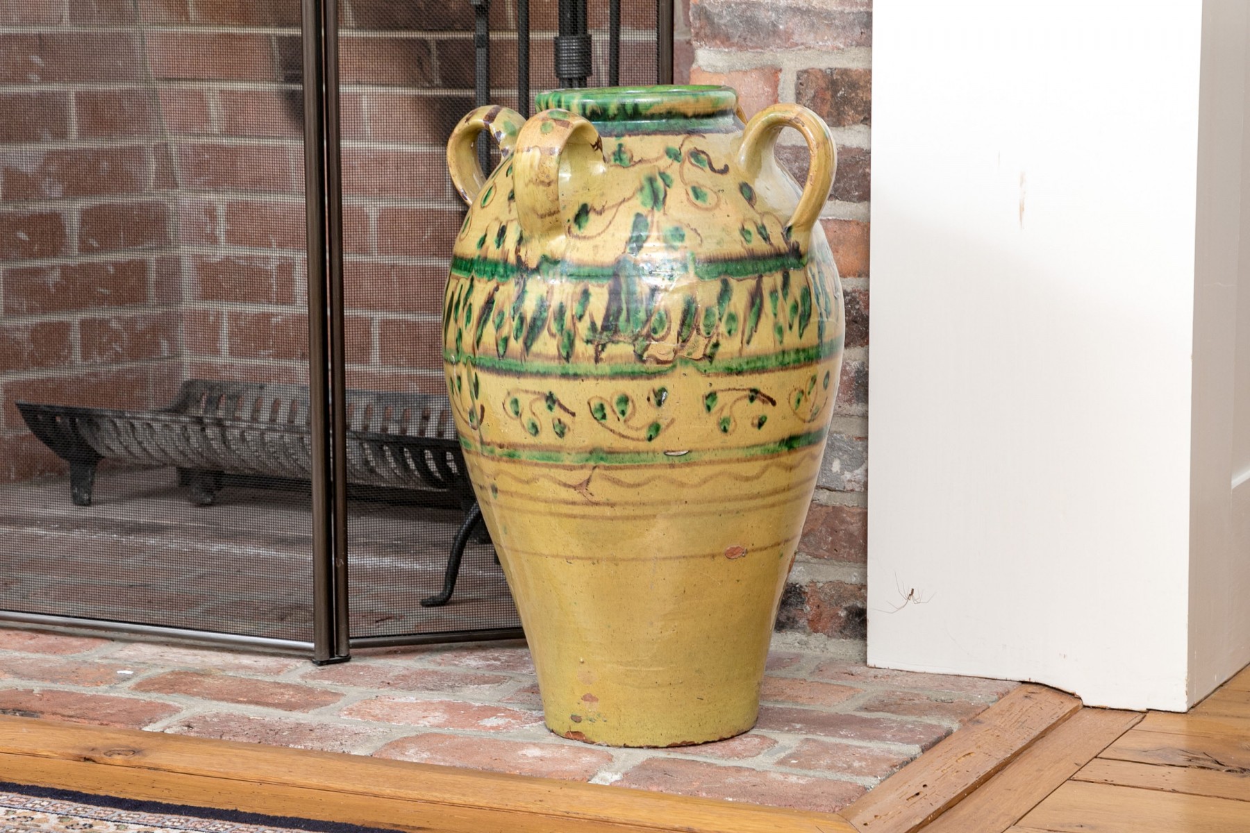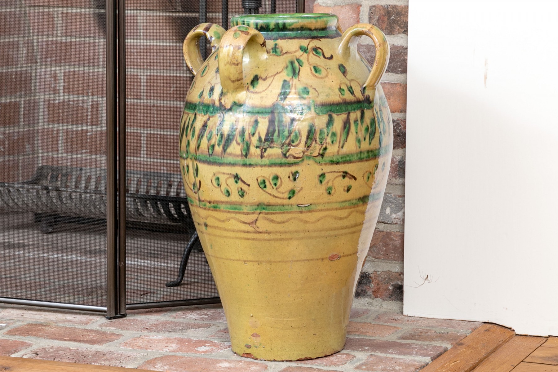 This 19th-century French glazed jardiniere from Savoie, France, and is characterized by its charming yellow and green glaze. It boasts four handles, making it a distinctive and functional piece of pottery.