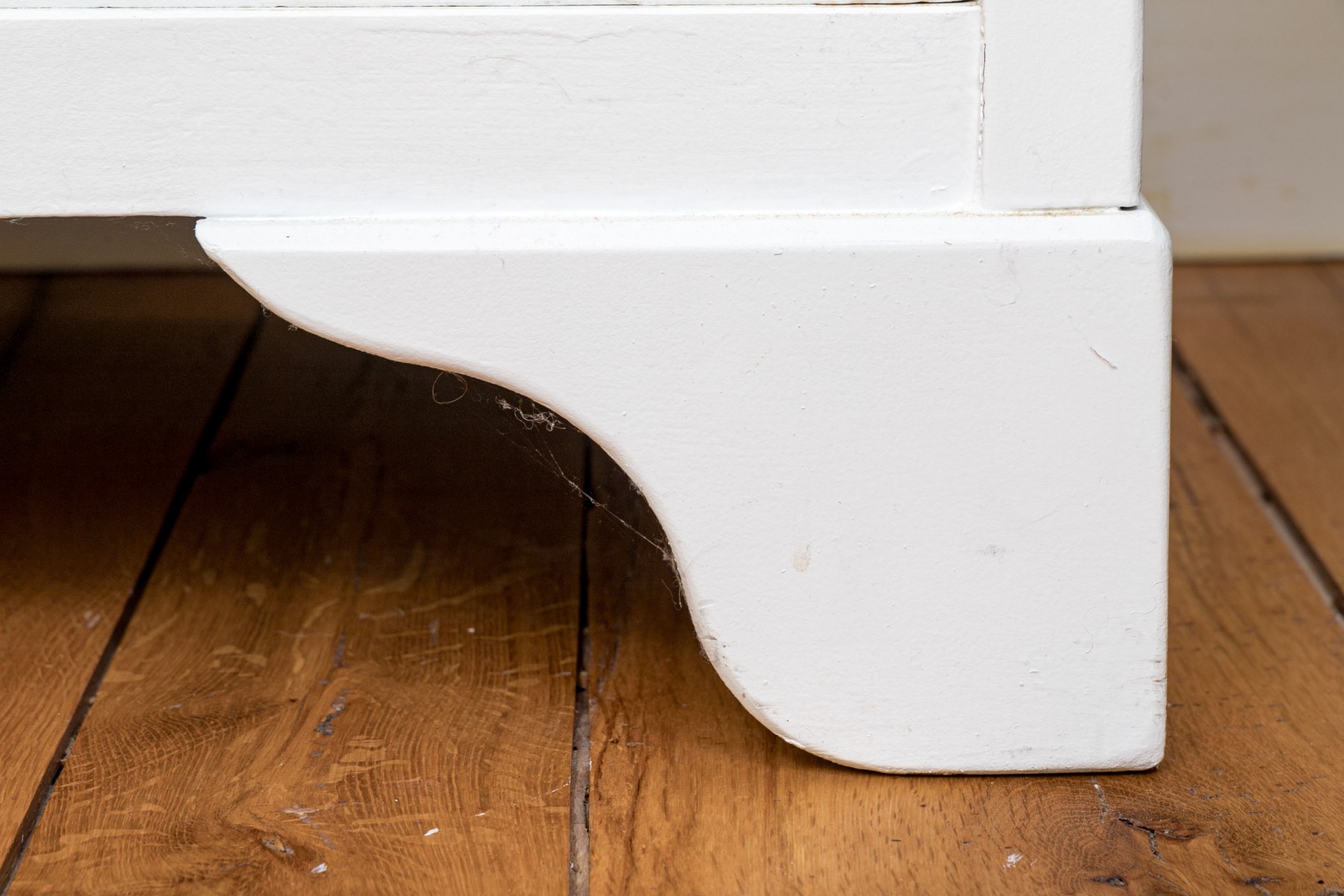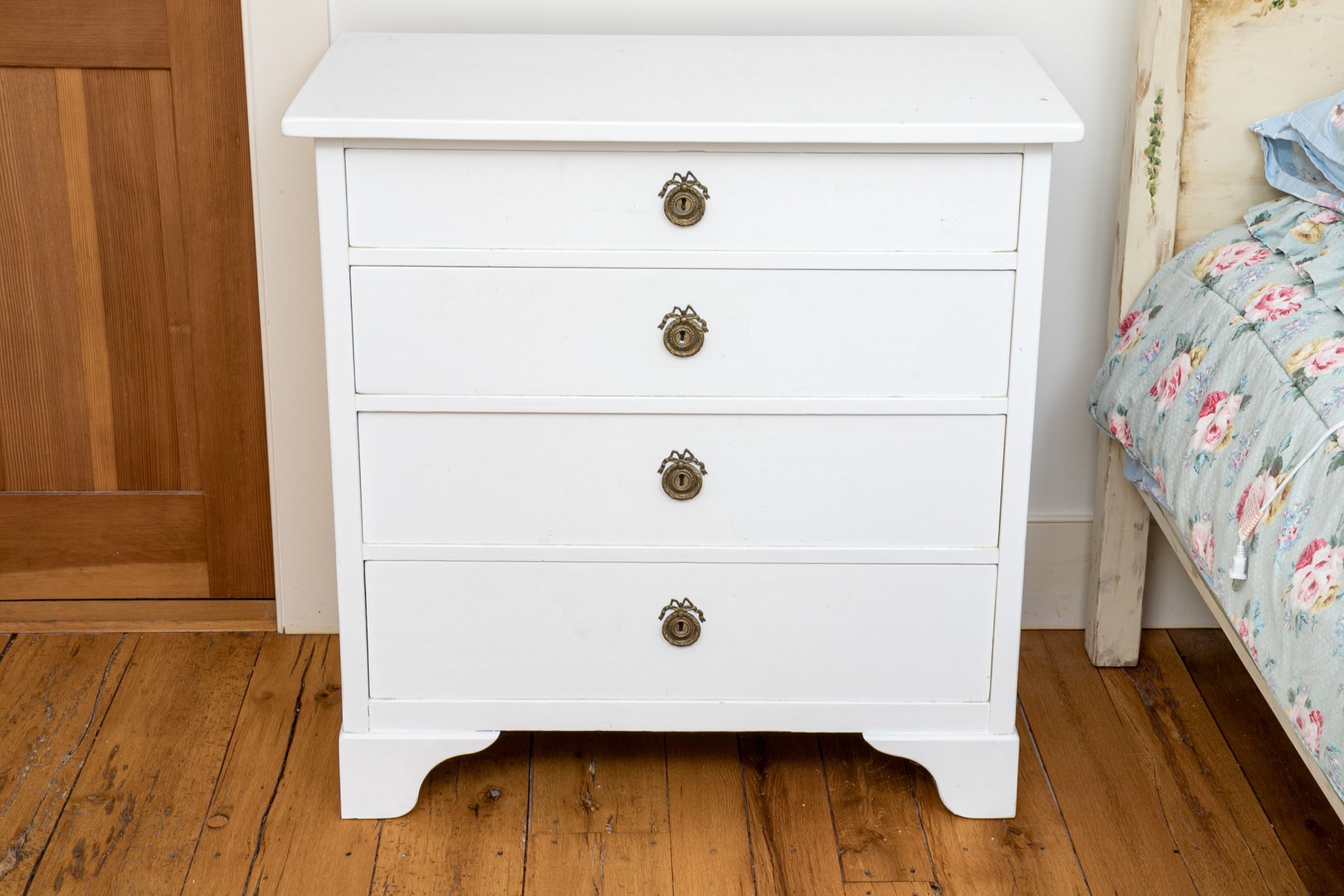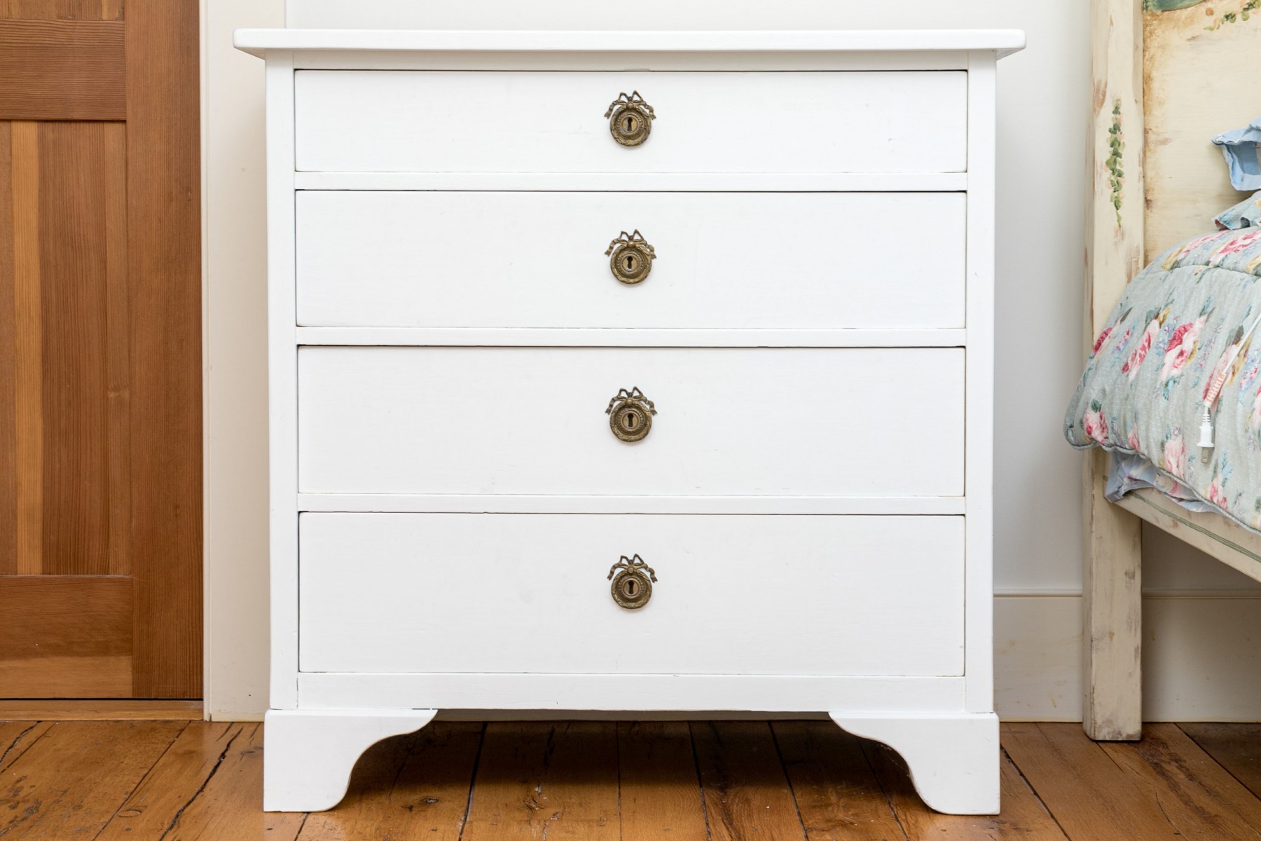 19th-century French oak chest, painted in a crisp white finish, featuring four graduated drawers. This piece is elegantly adorned with Baroque-style brass skeleton keyhole escutcheons, combining vintage charm with a clean, timeless aesthetic.