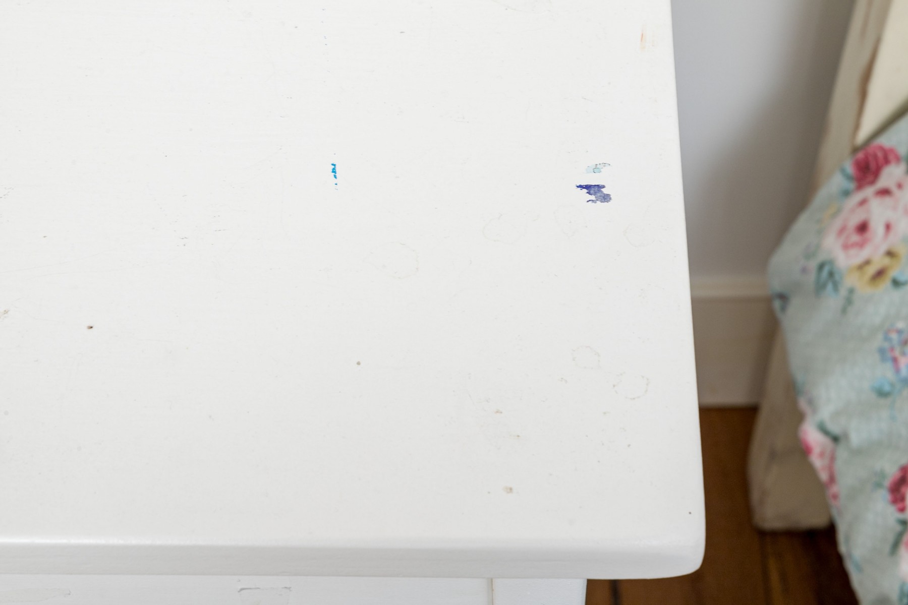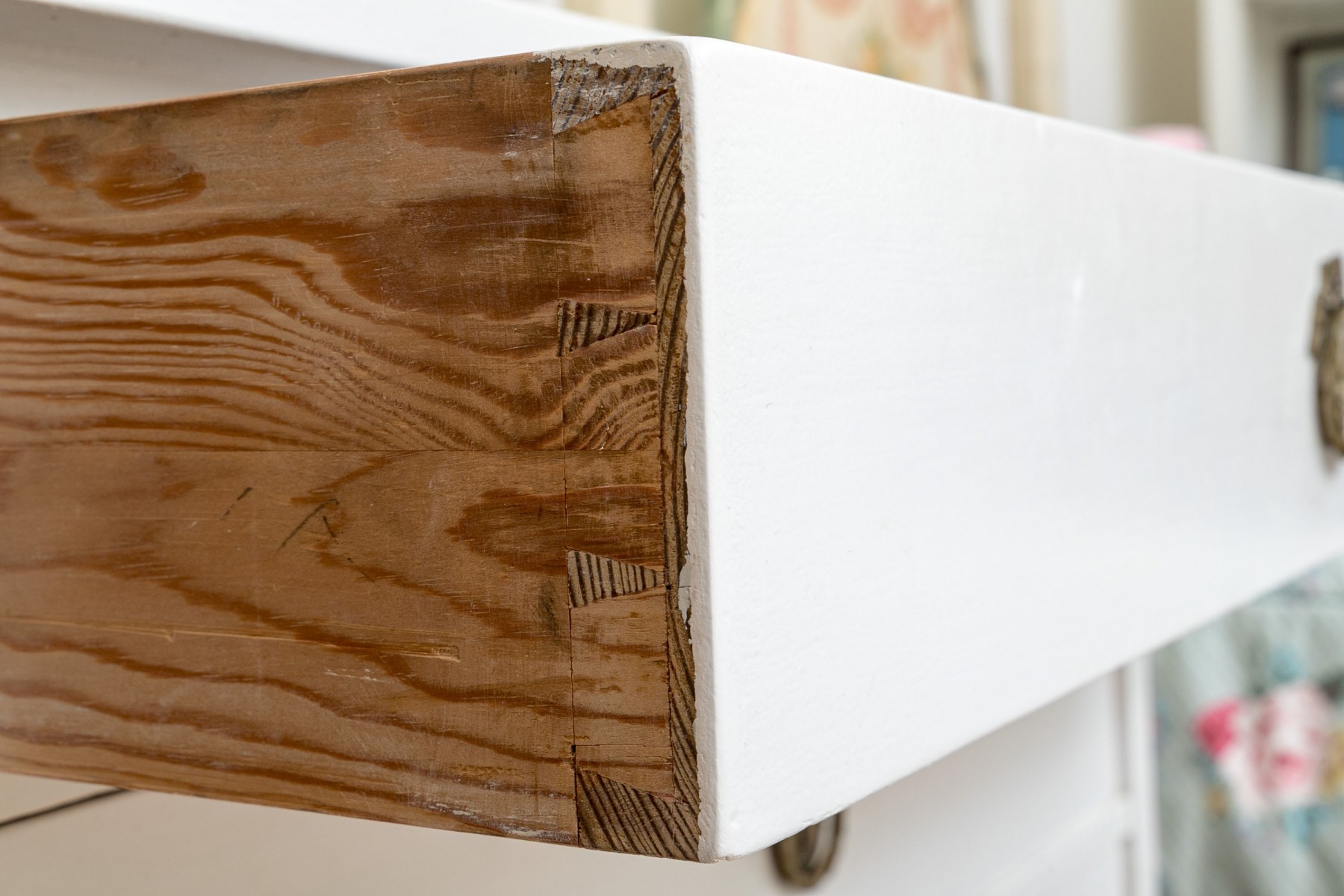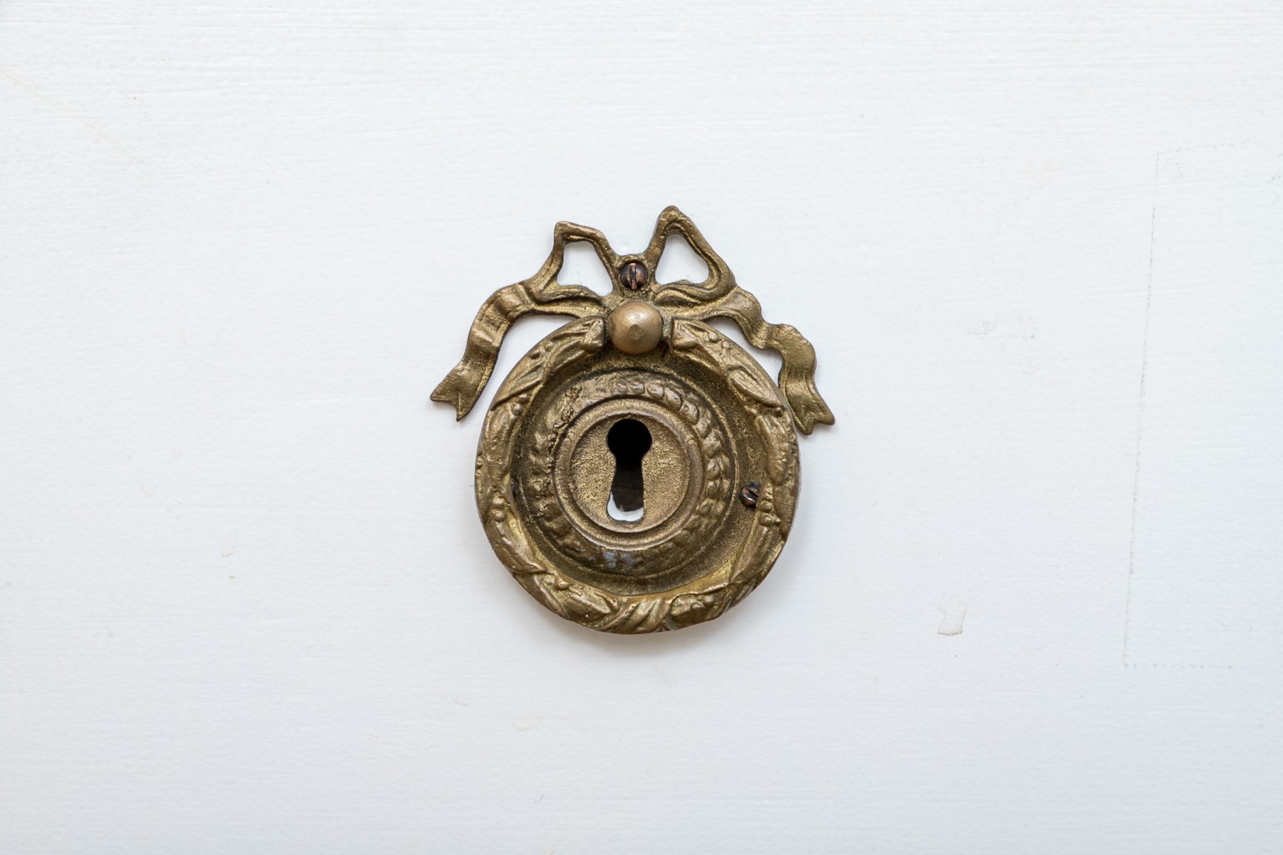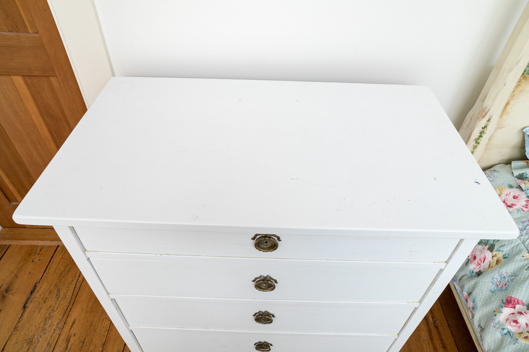 19th-century French oak chest, painted in a crisp white finish, featuring four graduated drawers. This piece is elegantly adorned with Baroque-style brass skeleton keyhole escutcheons, combining vintage charm with a clean, timeless aesthetic.