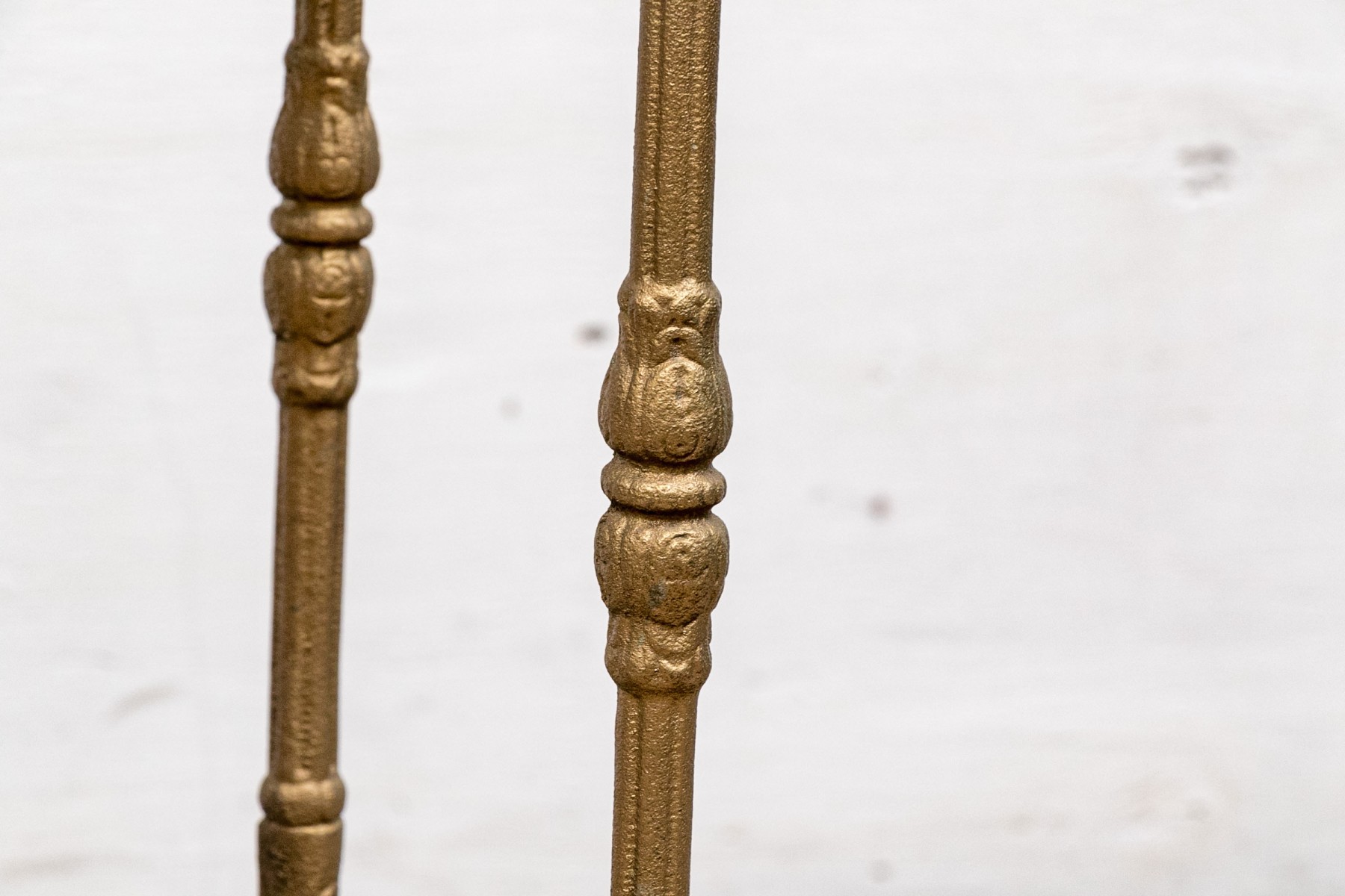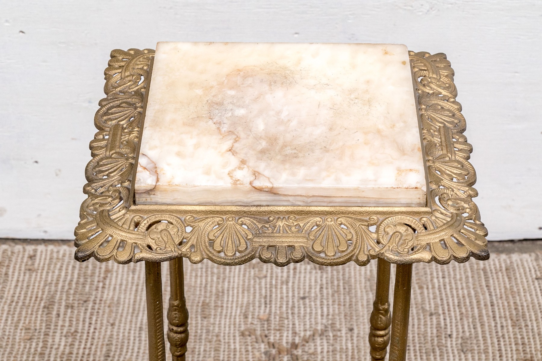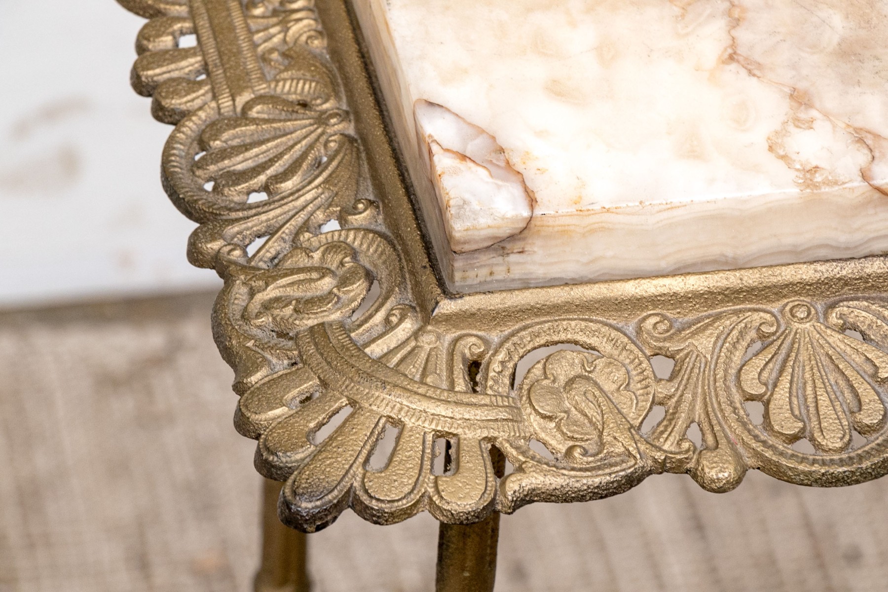 The tall gold paintned stand with a wide foliate scrolled top band framing the alabaster top. Raised on tall legs with twist and scrolled legs. The lower tier with palmettes and center rosette.