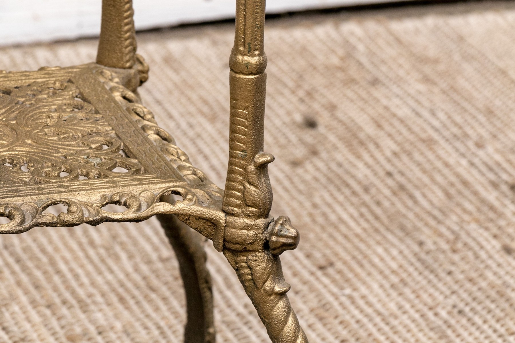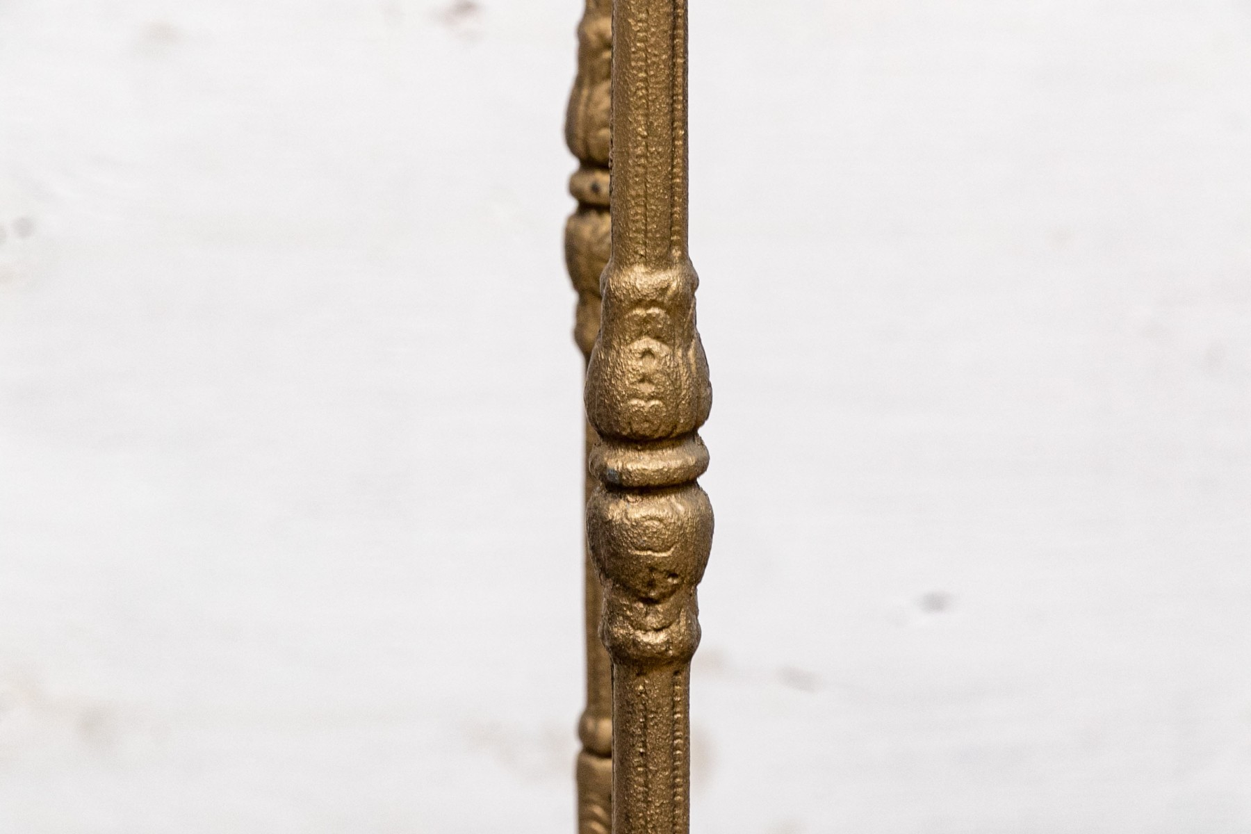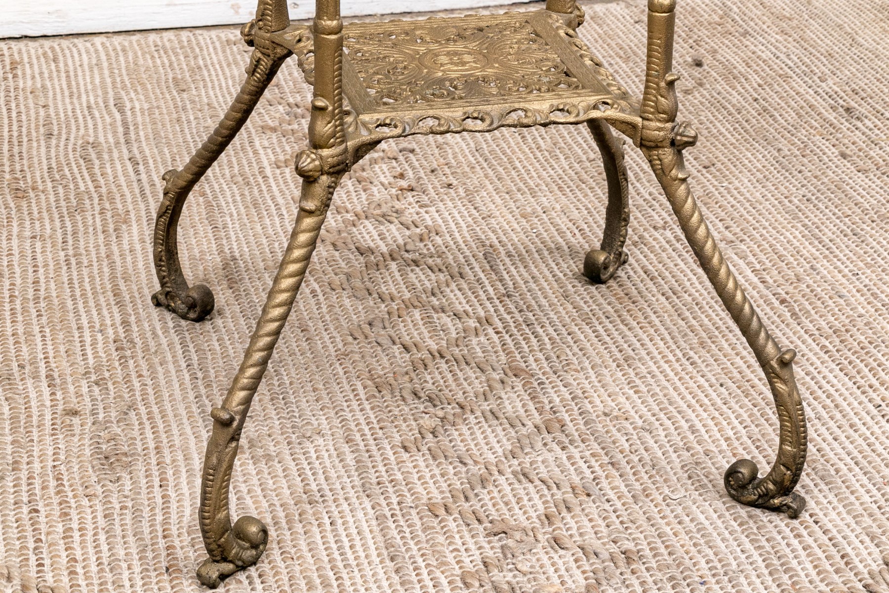 The tall gold paintned stand with a wide foliate scrolled top band framing the alabaster top. Raised on tall legs with twist and scrolled legs. The lower tier with palmettes and center rosette.